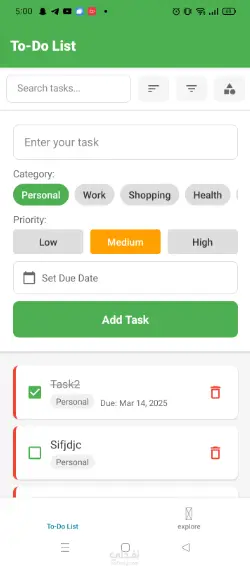 قمت بتطوير تطبيق To-Do List متعدد المنصات باستخدام React Native و Expo ليعمل بكفاءة على كل من Android و Web. يهدف التطبيق إلى إدارة المهام اليومية بطريقة سهلة وسريعة، مع توفير ميزات تساعد المستخدم على تنظيم وقته بفعالية. المميزات الرئيسية للتطبيق: إضافة، تعديل، وحذف المهام بسهولة. دعم تصنيف المهام حسب الفئات (Categories). إمكانية تحديد أولوية المهام (Priority Levels). تحديد Due Dates لكل مهمة مع عرض واضح للتواريخ. خاصية البحث السريع للعثور على المهام بسهولة. واجهة مستخدم بسيطة وسهلة الاستخدام. التطبيق يعمل على: Android Web (ويدعم iOS إذا لزم الأمر) التقنيات المستخدمة: React Native Expo React Navigation Local Storage Hooks & Functional Components