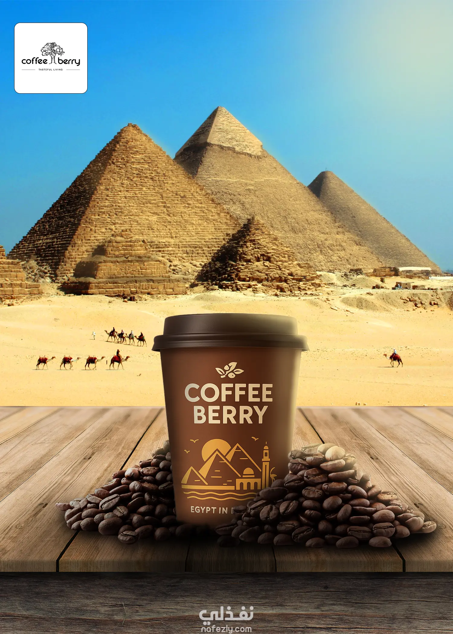 دمج كوب القهوة مع الأهرامات علشان أوصل إن المقهى موجود في القاهرة وليه هوية مصرية مميزة.