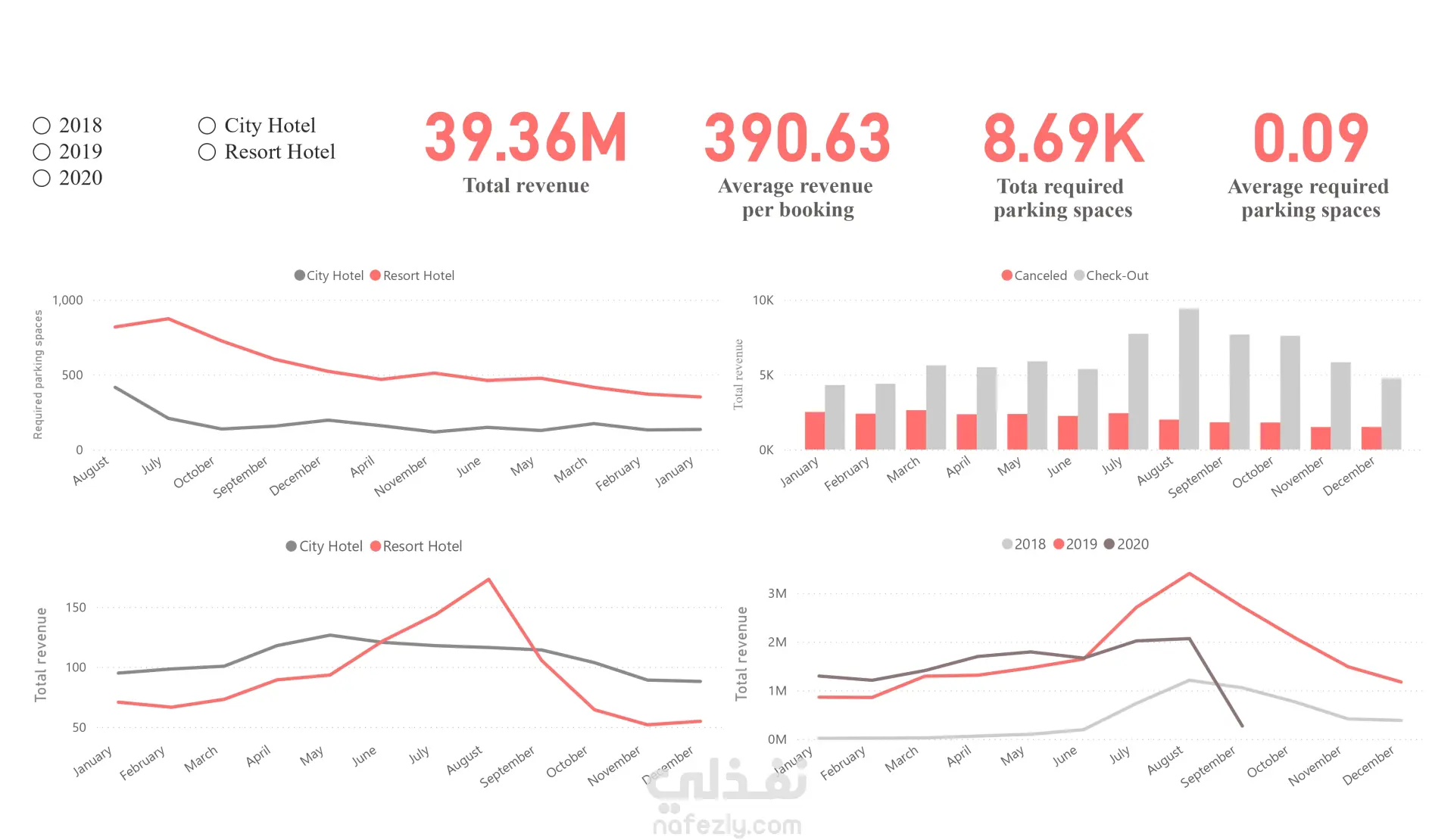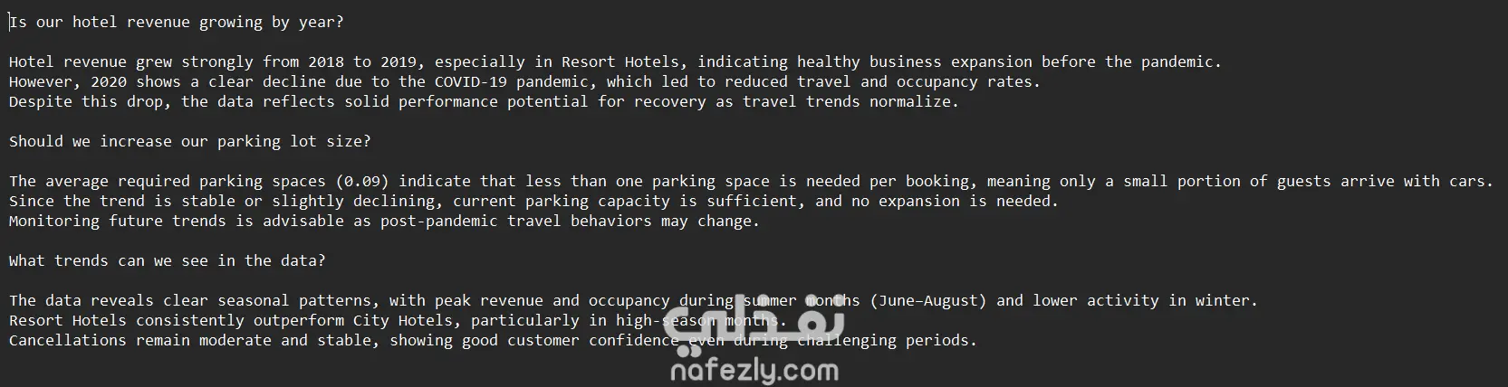 مشروع تحليل بيانات يهدف إلى دراسة أداء الفنادق خلال الأعوام 2018–2020 باستخدام أدوات تحليل البيانات. المهام المنجزة: دمج بيانات الفنادق من عدة سنوات باستخدام SQL تنظيف وتحويل البيانات في Power Query إنشاء عمود محسوب للإيرادات وتحليل الأداء في Power BI تصميم لوحة تفاعلية للإجابة على أسئلة العمل الرئيسية النتائج: نمو الإيرادات من عام 2018 إلى 2019، ثم انخفاضها في 2020 بسبب الجائحة. انخفاض الطلب على مواقف السيارات، مما يدل على عدم الحاجة للتوسّع. ارتفاع الحجوزات في أشهر الصيف، خصوصًا في الفنادق السياحية. الأدوات المستخدمة: SQL – Power Query – Power BI