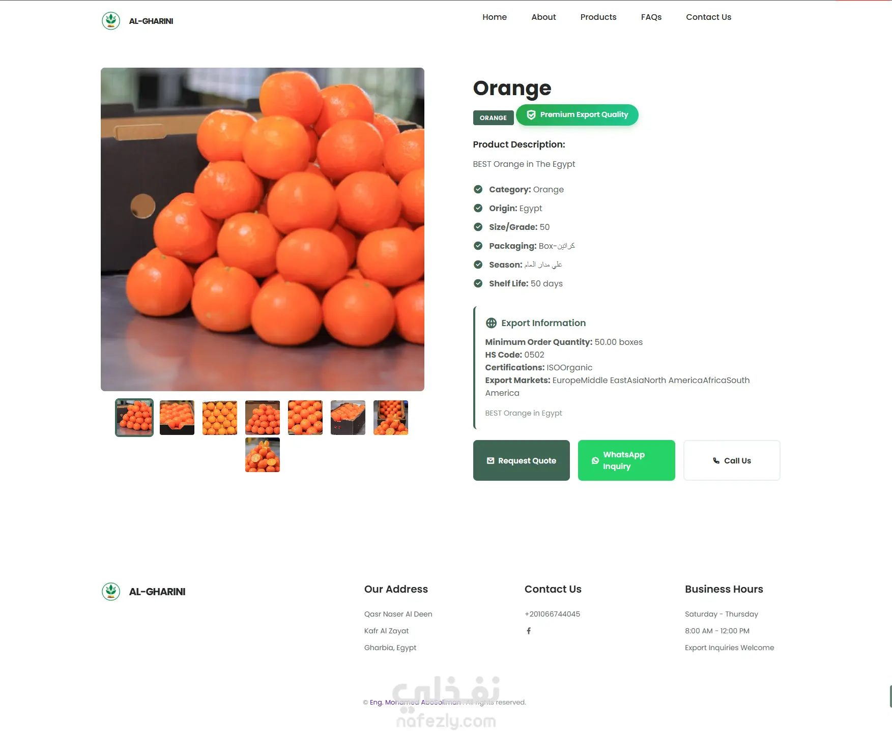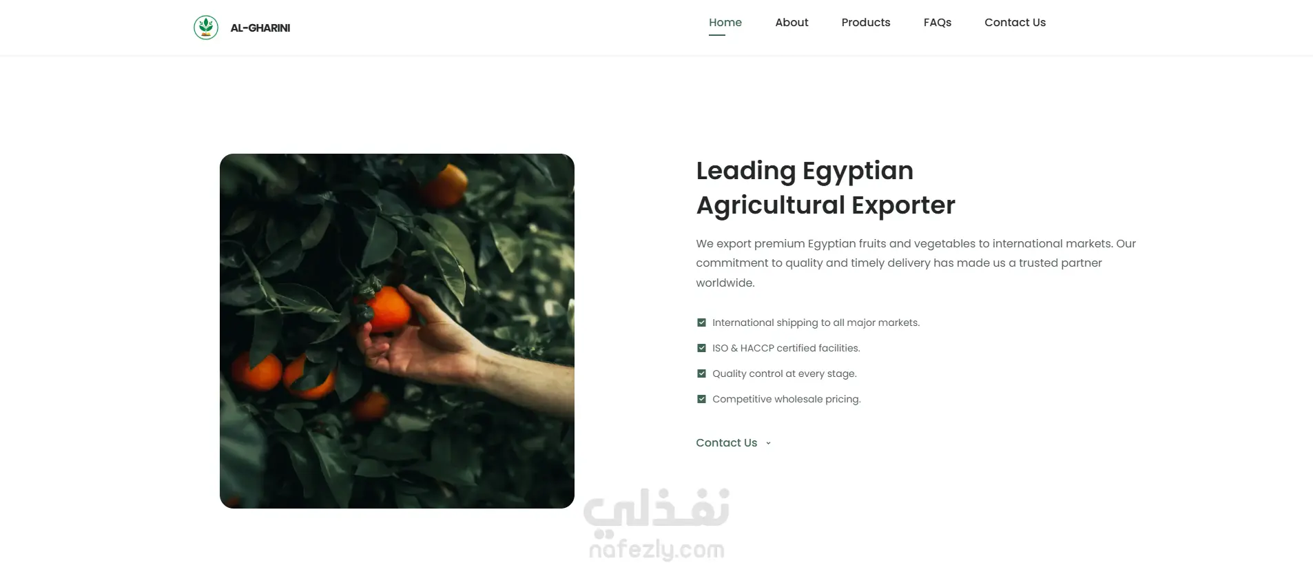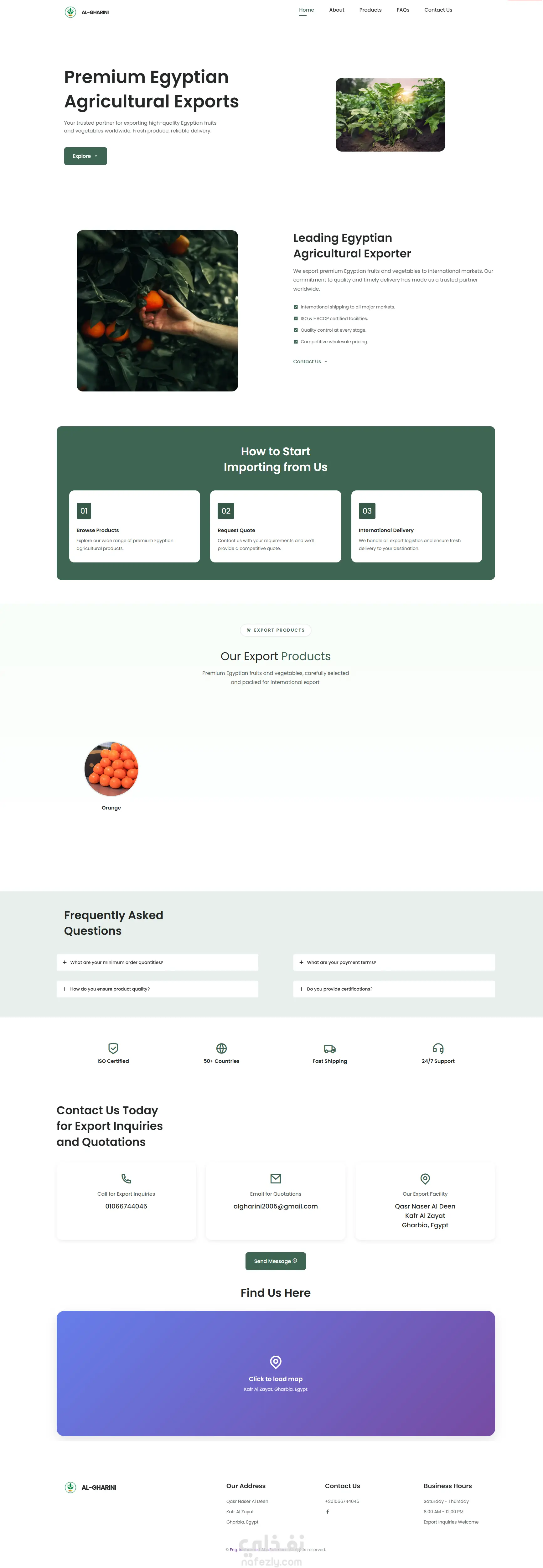 قمت بتطوير موقع شركة تصدير زراعي يهدف لعرض منتجات الشركة، شهادات الجودة، طرق التواصل، وتسهيل طلبات التصدير. استخدمت في تطوير الموقع: Laravel في الـ Backend MySQL لإدارة البيانات HTML / CSS / JavaScript تحسين السرعة والأداء تصميم متوافق مع جميع الشاشات (Responsive Design) دمج صفحات المنتجات، سياسة الجودة، نموذج طلب الأسعار، وصفحة تواصل الموقع يعمل بكفاءة على الهواتف والكمبيوتر وتم تحسين الـ SEO لضمان ظهور أفضل على محركات البحث.