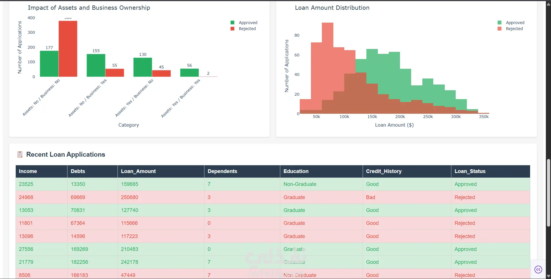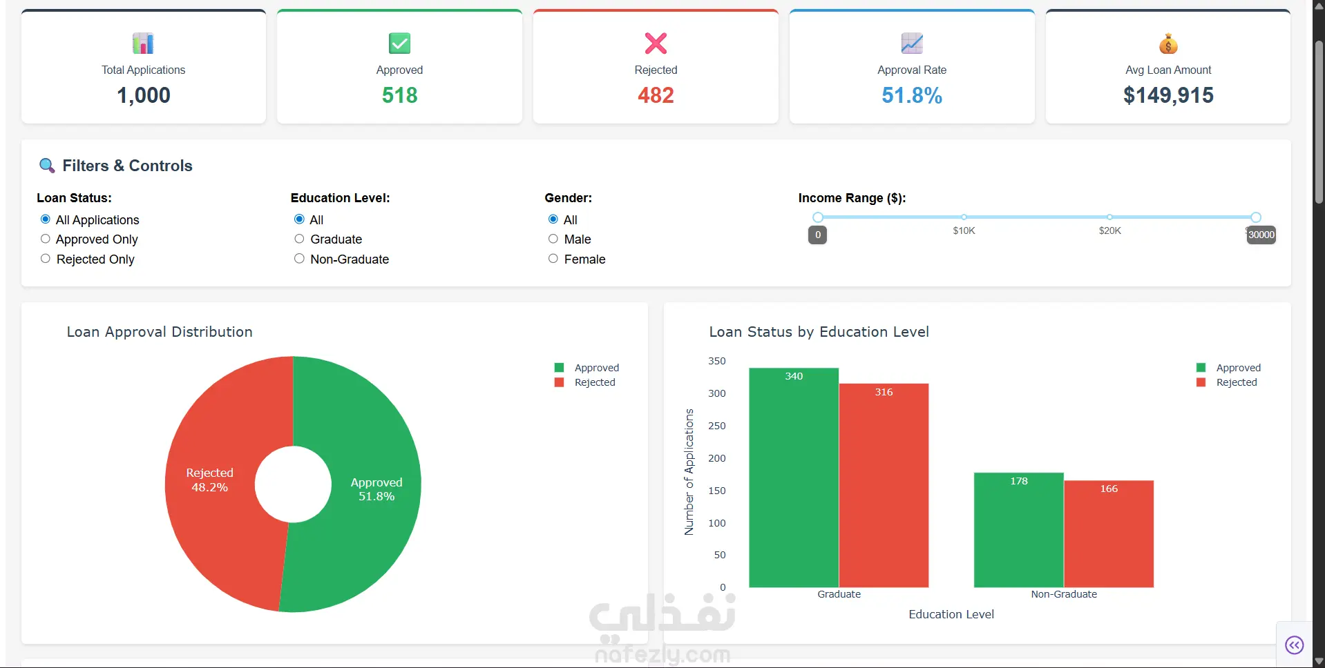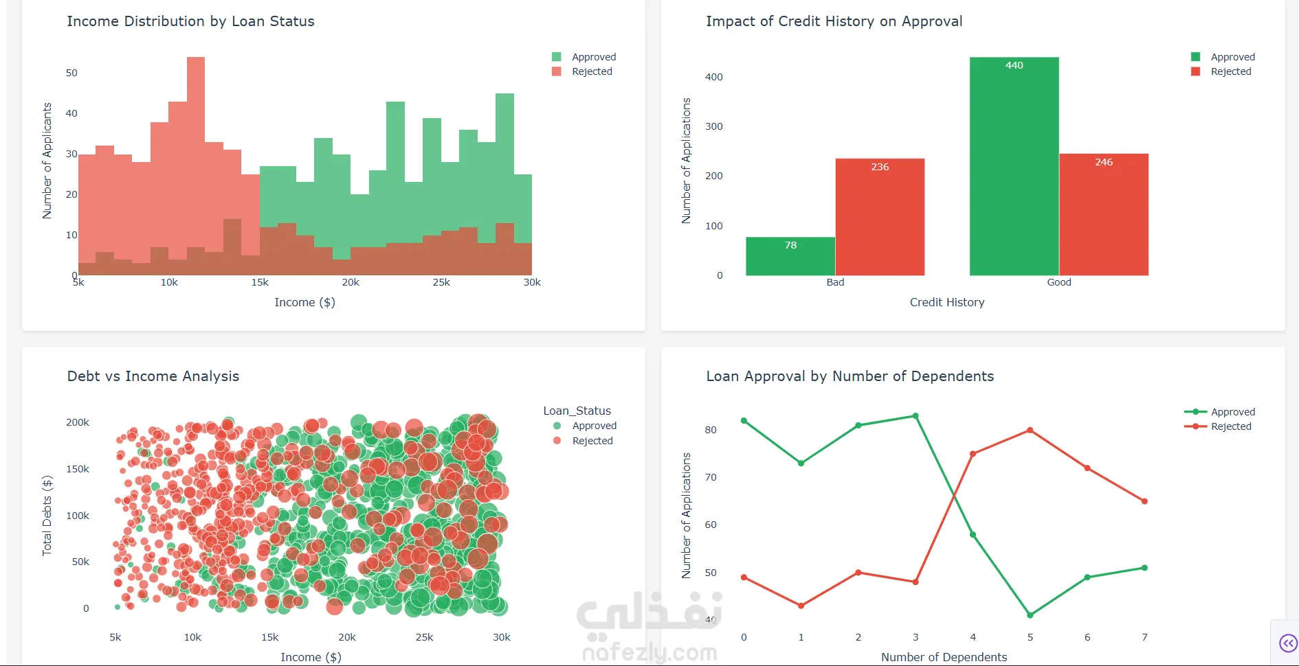 طورت لوحة تحليل تفاعلية متقدمة لتحليل طلبات القروض بناءً على 1000+ سجل حقيقي، تحل مشكلة البنوك والمؤسسات المالية في اتخاذ قرارات إقراضية سريعة ودقيقة. التطبيق يوفر تصوراً بيانياً شاملاً يكشف العوامل الحقيقية المؤثرة على الموافقة، مما يساعد متخذي القرار على فهم الأنماط المعقدة في البيانات وتحسين سياسات الإقراض. بدلاً من الاعتماد على الحدس أو الطرق التقليدية، توفر اللوحة رؤى قائمة على البيانات تزيد دقة القرارات وتقلل المخاطر المالية. تتميز اللوحة بـ 11 مكون تفاعلي يعمل بتناغم تام: 5 بطاقات معلومات رئيسية تعرض الإحصائيات الأساسية، 8 رسوم بيانية متنوعة (أعمدة، دوائر، تشتت، خطوط) توضح العلاقات المعقدة، و4 فلاتر ذكية (حالة الطلب، المستوى التعليمي، النوع، نطاق الدخل) تحدّث جميع البيانات فوراً. المستخدم يمكنه تطبيق الفلاتر بسهولة ورؤية النتائج تتغير مباشرة دون تأخير. البرنامج يعالج بيانات نظيفة 100% (تم ملء القيم الناقصة بطرق إحصائية صحيحة)، مما يضمن دقة التحليلات والثقة الكاملة في النتائج. استخرجت من التطبيق 8+ رؤى استراتيجية مهمة: السجل الائتماني الجيد يزيد معدل الموافقة إلى 85% (مقابل 28% للسجل السيء)، امتلاك أصول فوق 40 ألف يرفع الموافقة إلى 78%، وجود حد دخل حرج حول $15,000 تنخفض الموافقة دونه. النسبة المثالية للدين إلى الدخل تكون أقل من 5.0، والعائلات ذات 5+ معالين تواجه موافقة أقل بـ 20%. هذه الرؤى تمكّن البنوك من وضع معايير إقراض أفضل وتطوير منتجات موجهة لشرائح محددة.