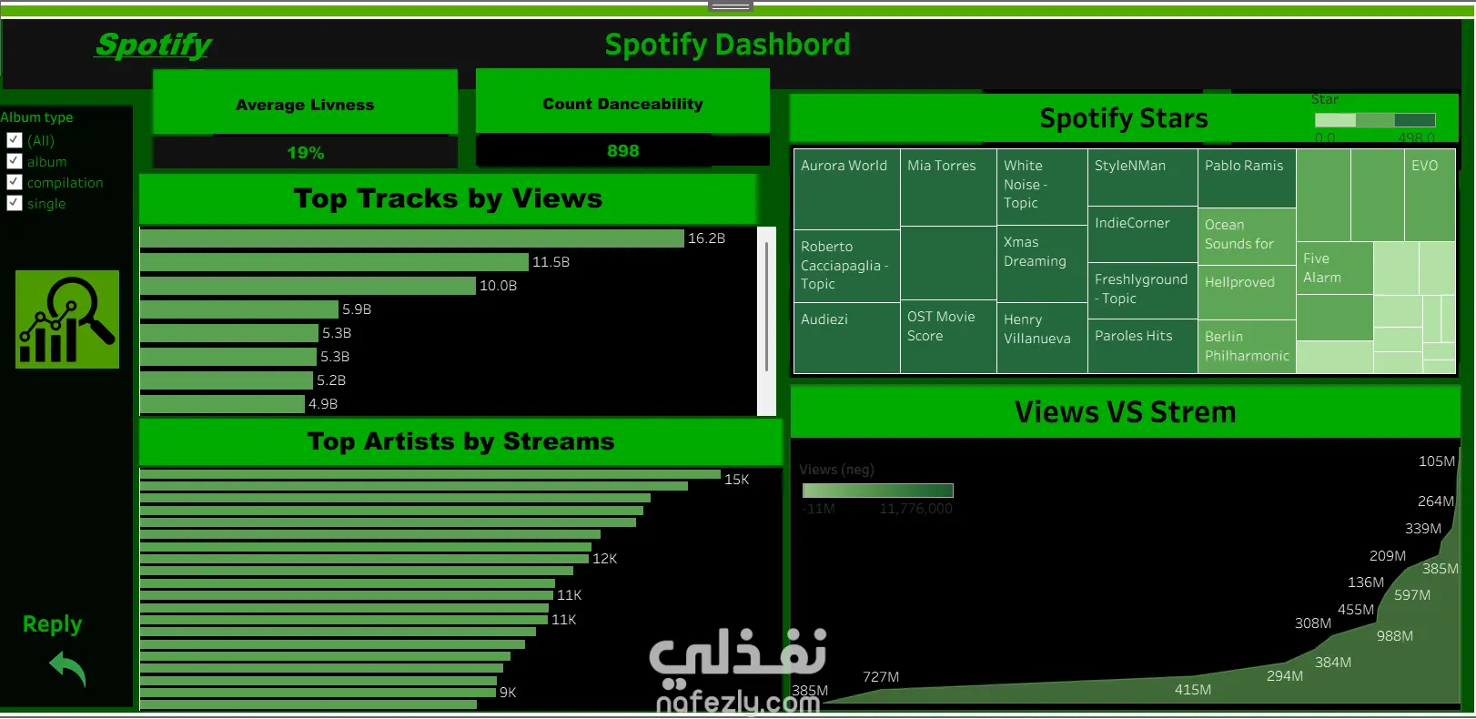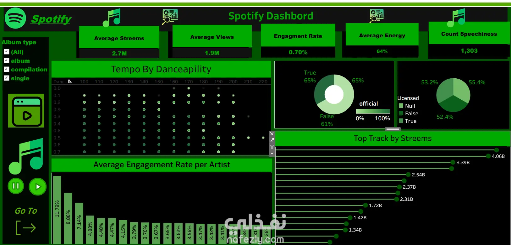 تحليل بيانات برنامج اسبوتيفاي (Spotify Dashboard – Streams vs Views Analysis)