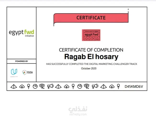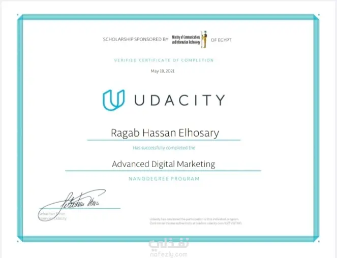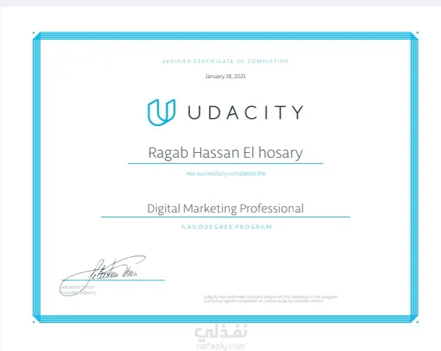 الشهادات التى حصلت عليه خلال دراسته لمنحه Udacity digital marketing Nanodegree بمراحلها الثالثه challenger, professional, Advanced