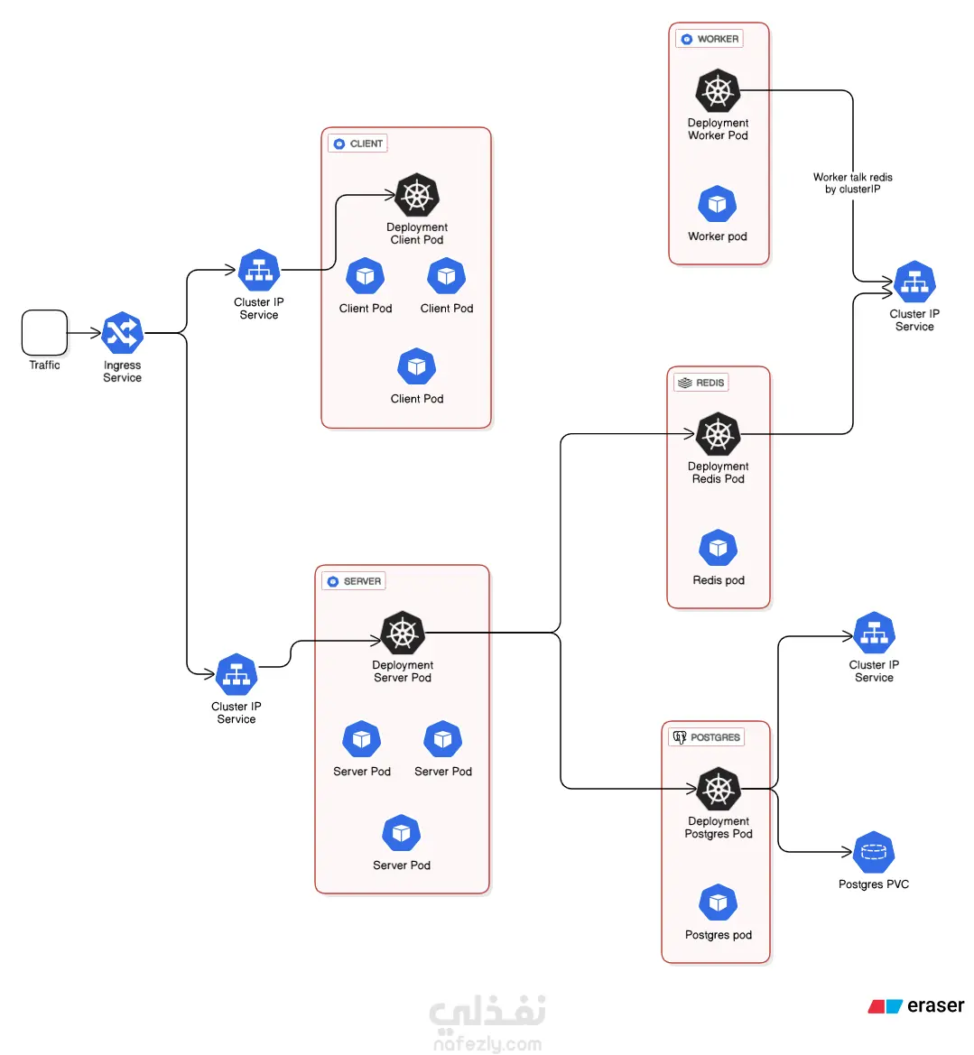 This project is a microservices-based Fibonacci calculator deployed in a Kubernetes cluster. The system accepts an index from a React frontend, forwards it to an Express API, and calculates the Fibonacci value for that index in a distributed, fault-tolerant way.
