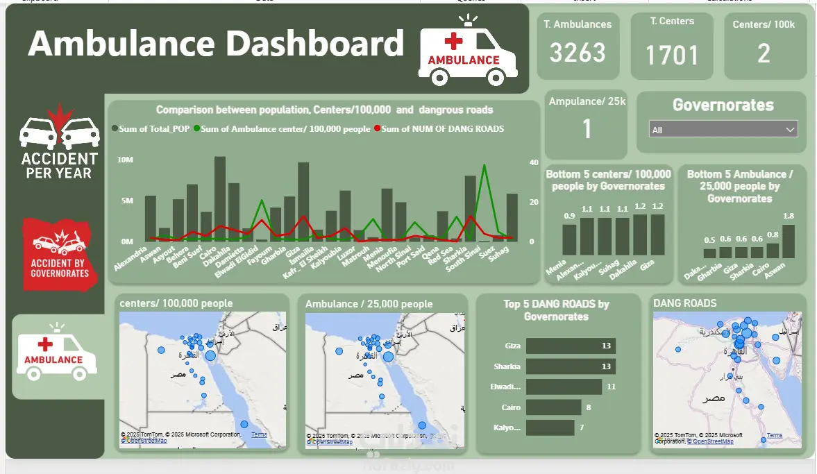 🔧 ماذا قمت به في المشروع؟ ✔ تنظيف وتجهيز البيانات (Data Cleaning) ✔ بناء نموذج بيانات متكامل (Data Modeling) ✔ إنشاء مقاييس DAX لحساب: – عدد سيارات الإسعاف – عدد المراكز – الإسعاف لكل 25 ألف شخص – مراكز الإسعاف لكل 100 ألف شخص ✔ تحليل العلاقة بين: – الكثافة السكانية – عدد المراكز – الطرق الخطرة ✔ إنشاء خرائط تفاعلية (Maps) لعرض النقاط الساخنة Hotspots ✔ تصميم لوحة متكاملة توضح مقارنة المحافظات في كفاءة توزيع خدمات الإسعاف 📊 أهم الـ Insights من التحليل: 🔹 القاهرة والجيزة تمتلكان أعلى عدد من السكان ولكن نسبة مراكز الإسعاف لكل 100 ألف شخص أقل مما يجب، مما يشير إلى ضغط كبير على الخدمات. 🔹 محافظات مثل شمال سيناء – جنوب سيناء – البحر الأحمر لديها أعلى معدل مراكز إسعاف بالنسبة لعدد السكان، بسبب قلة عدد السكان وامتداد الطرق السريعة. 🔹 محافظات مثل الدقهلية – الغربية – القليوبية ظهرت ضمن Bottom 5 في: – مراكز إسعاف لكل 100 ألف – سيارات إسعاف لكل 25 ألف وهذا يوضح فجوة في التغطية الصحية رغم ارتفاع الكثافة السكانية. 🔹 الطرق الأكثر خطورة كانت في: – الجيزة (13 طريق خطير) – الشرقية (13 طريق خطير) – القاهرة و كفر الشيخ (طرق متعددة ذات معدل خطر أعلى من المتوسط) 🔹 المحافظات ذات عدد طرق خطرة مرتفع لا تمتلك دائمًا العدد الكافي من سيارات أو مراكز الإسعاف، ما يشير لعدم توازن في التوزيع. 📝 أهم التوصيات (Recommendations): ✔ زيادة عدد مراكز الإسعاف في المحافظات ذات الكثافة السكانية المرتفعة: القاهرة – الجيزة – الشرقية – الدقهلية. ✔ إعادة توزيع سيارات الإسعاف لتتناسب مع عدد الطرق الخطرة، خاصة في الجيزة والشرقية. ✔ توجيه سيارات إضافية بالقرب من الطرق السريعة ذات معدلات الحوادث المرتفعة. ✔ بناء نظام تنبؤ (Predictive Model) مستقبلاً للتنبؤ بالمناطق التي ستحتاج دعمًا إضافيًا خلال المواسم أو أوقات الذروة. ✔ تحسين عمليات الاستجابة من خلال وضع مؤشرات أداء (KPIs) لمتابعة: – زمن الوصول – عدد البلاغات – نسبة تغطية المناطق النائية