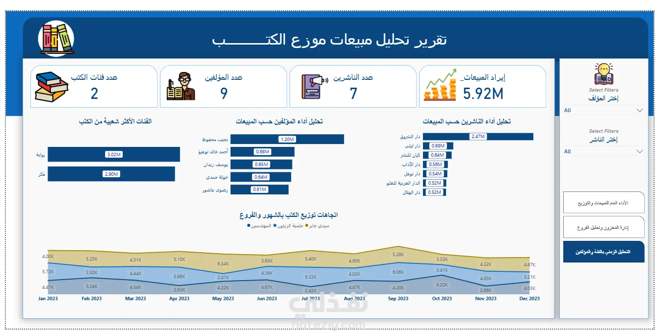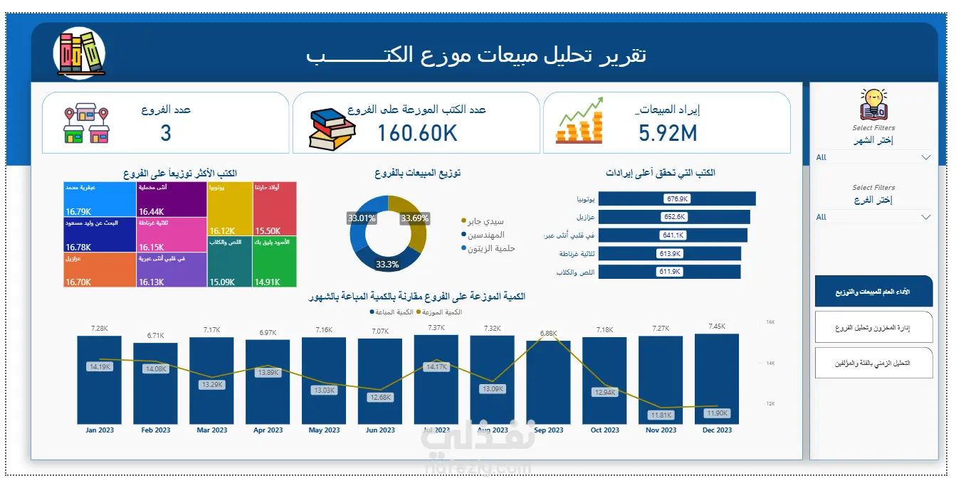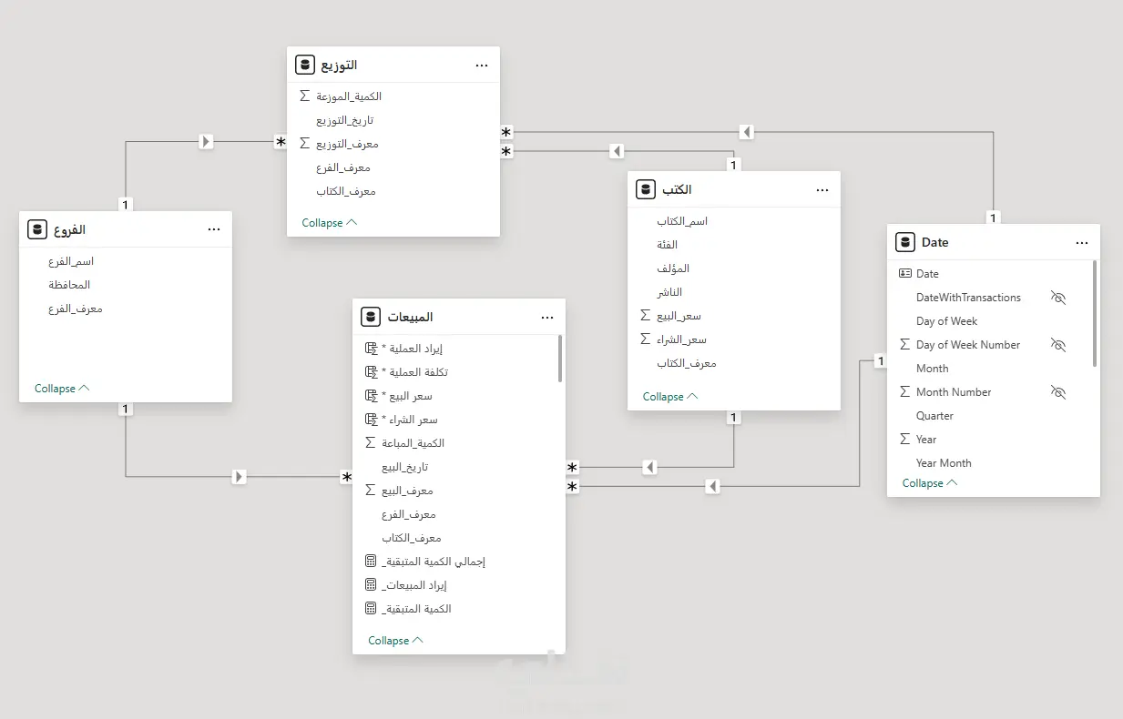 تفاصيل العمل المنفّذ باستخدام Power BI تم تنفيذ مشروع متكامل لتحليل بيانات المبيعات والتوزيع الخاصة بالكتب اعتمادًا على Power BI، وشمل العمل الخطوات التالية: 1️⃣ إعداد ومعالجة البيانات (Data Preparation) استيراد جميع جداول البيانات الخاصة بالمبيعات، التوزيع، الفروع، الكتب، والتقويم. تنظيف البيانات (Data Cleaning) من التكرارات والأخطاء، وتوحيد الصيغ. إنشاء جدول تاريخ احترافي (Date Table) يحتوي على: اليوم–الشهر–السنة رقم اليوم في الأسبوع رقم الشهر الربع السنوي Year–Month التأكد من جاهزية الجداول للتحليل عبر Power Query. 2️⃣ تصميم نموذج البيانات (Data Modeling) إنشاء نموذج بيانات على شكل Star Schema لضمان سرعة الأداء ودقة تحليل المقاييس. ربط الجداول الرئيسية بعلاقات One-to-Many، ومنها: الكتب ↔ المبيعات الفروع ↔ المبيعات التوزيع ↔ الكتب التاريخ ↔ المبيعات تحديد اتجاه العلاقات (Single Direction) لضمان جمع البيانات الصحيح. معالجة الـ Cardinality بشكل صحيح بين (1:*). 3️⃣ إنشاء المقاييس التحليلية باستخدام DAX تم تطوير مجموعة مقاييس احترافية، أهمها: مقاييس المبيعات إجمالي الإيرادات تكلفة العملية صافي الربح سعر البيع سعر الشراء إجمالي الكمية المباعة كمية المخزون المتبقية مقاييس التوزيع إجمالي الكمية الموزعة تحليل الفروقات بين الكمية الموزعة والمباعة معدل التوزيع لكل فرع ولكل كتاب 4️⃣ التحليل والنتائج (Business Insights) تم استخراج عدد كبير من الرؤى، منها: 📌 تحليل الفروع مقارنة أداء الفروع حسب الإيرادات، الكميات، وهامش الربح. معرفة الفروع ذات أعلى مبيعات أو أعلى توزيع غير مستغل. 📌 تحليل الكتب أفضل الكتب مبيعًا حسب الفئة والمؤلف والناشر. مقارنة سعر البيع بالشراء للوقوف على الكتب الأعلى ربحية. 📌 تحليل التوزيع قياس مدى فعالية توزيع الكتب على الفروع. اكتشاف الكتب التي تم توزيعها بكميات كبيرة لكن مبيعاتها منخفضة. 📌 تحليل الوقت (Time Intelligence) تحليل المبيعات يوميًا، أسبوعيًا، شهريًا، وربع سنوي. تتبع الاتجاهات (Trends) ومعرفة مواسم الذروة. 5️⃣ تصميم لوحات Power BI تصميم Dashboard تفاعلية سهلة الاستخدام. استخدام عناصر بصرية مدروسة: Cards – Bar Charts – Pie Charts – Line Charts – Matrix – Slicers إضافة خيارات فلترة متقدمة حسب: (الفرع – الفئة – المؤلف – الناشر – الكتاب – الفترة الزمنية)