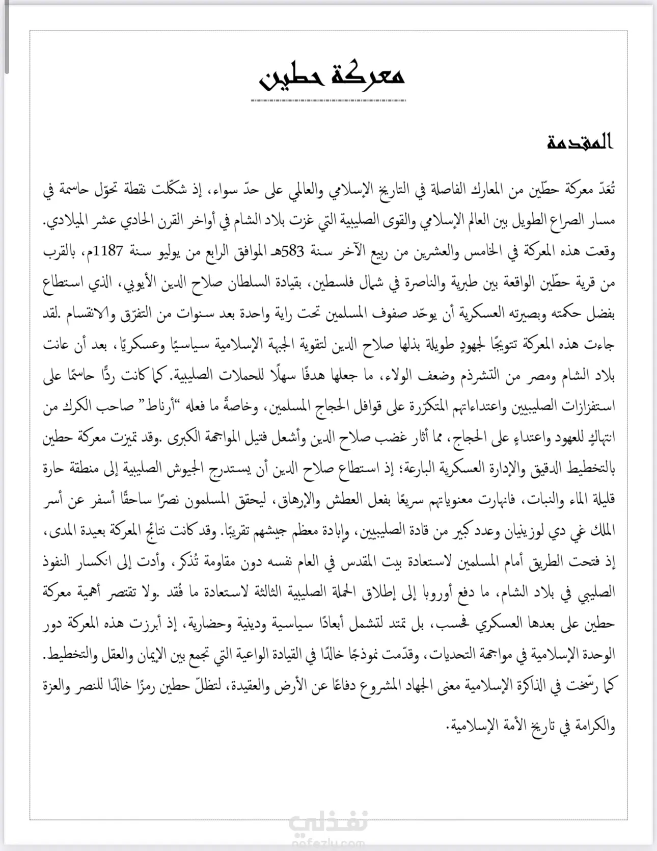 بحث عن معركة حطين متكامل، تم إعداده بعناية كبيرة من خلال جمع وتحليل معلومات من مصادر علمية وإسلامية موثوقة. البحث يحتوي على مقدمة، التعريف بالمعركة ، الخلفية الجغرافية والعسكرية، الأسباب والدوافع، الاستعدادات العسكرية، مجريات المعركة، النتائج المترتبة علي المعركة، الأثر التاريخيّ والحضاري، الجوانب الثقافية والاجتماعية، البلدان المشاركة والمتأثر بالمعركة، وخاتمة، مع توثيق دقيق لجميع المصادر المستخدمة.