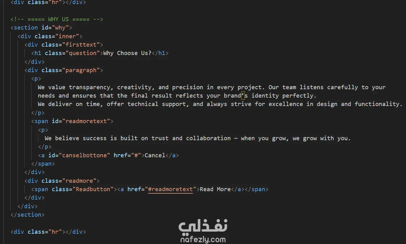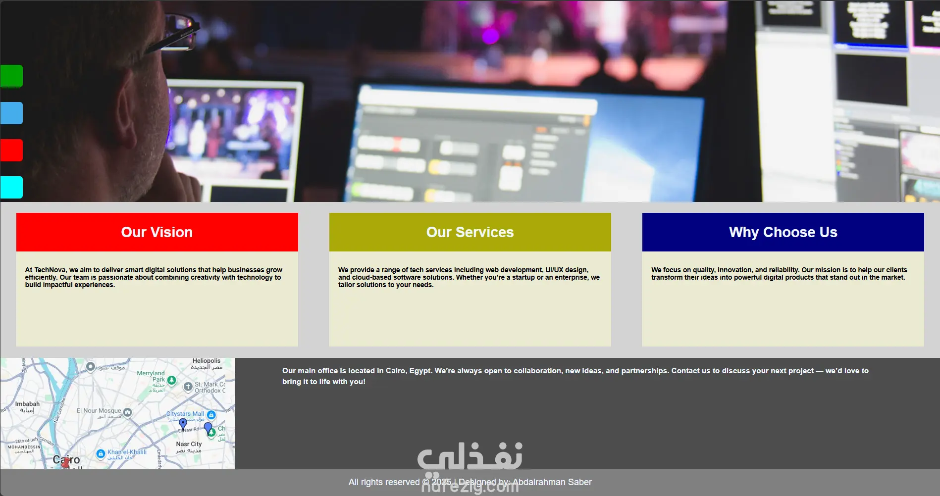 يمثل هذا الموقع صفحة تعريفية عصرية لشركة تقدم حلول وخدمات تقنية في مجال تطوير الويب. يعتمد التصميم على هيكل واضح وألوان متباينة لعرض الأقسام الأساسية مثل: رؤيتنا، خدماتنا، ولماذا تختارنا، مما يساعد الزائر على فهم هوية الشركة وقيمتها بسرعة ووضوح. يقدّم الموقع رؤية الشركة في تقديم حلول رقمية ذكية تساعد الأعمال على النمو، ويعرض مجموعة من الخدمات تشمل تطوير المواقع، تصميم واجهات المستخدم، وحلول البرمجيات السحابية. كما يبرز المميزات التي تجعل العميل يختار الشركة، مثل الجودة والابتكار والموثوقية. يحتوي الموقع أيضًا على خريطة تفاعلية تُظهر موقع الشركة، بالإضافة إلى تذييل احترافي يعزز الهوية البصرية للموقع. التصميم بسيط، منظم، وسهل الاستخدام، مما يجعله مناسبًا للشركات التقنية الناشئة أو المستقلين الذين يرغبون في تقديم أنفسهم بشكل احترافي عبر الإنترنت.