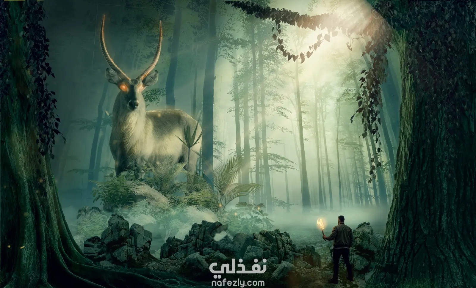 هذا مشروع فني شخصي تم إنجازه باستخدام برنامج أدوبي فوتوشوب، يصوّر مشهدًا خياليًا في غابة غامضة يجمع بين الإنسان والطبيعة بشكل أسطوري. يُظهر العمل غابة ضبابية يقف فيها رجل يحمل شعلة أمام غزال عملاق بعيون متوهجة، في مشهد يمزج بين الغموض والرهبة والجمال الطبيعي. طريقة التنفيذ باختصار: تم تركيب الصور المختلفة (الغابة، الغزال، الرجل، والإضاءة) باستخدام تقنيات الدمج والطبقات. أُضيف الضباب والوهج الضوئي للشعلة والعينين باستخدام فرش وتأثيرات إضاءة ناعمة. جرى تعديل الألوان والإضاءة لإضفاء جو سينمائي وغامض يوحّد عناصر المشهد. النتيجة: عمل فوتومونتاج خيالي يجسّد لقاءً بين الإنسان ومخلوق أسطوري في عالم من الغموض والطبيعة