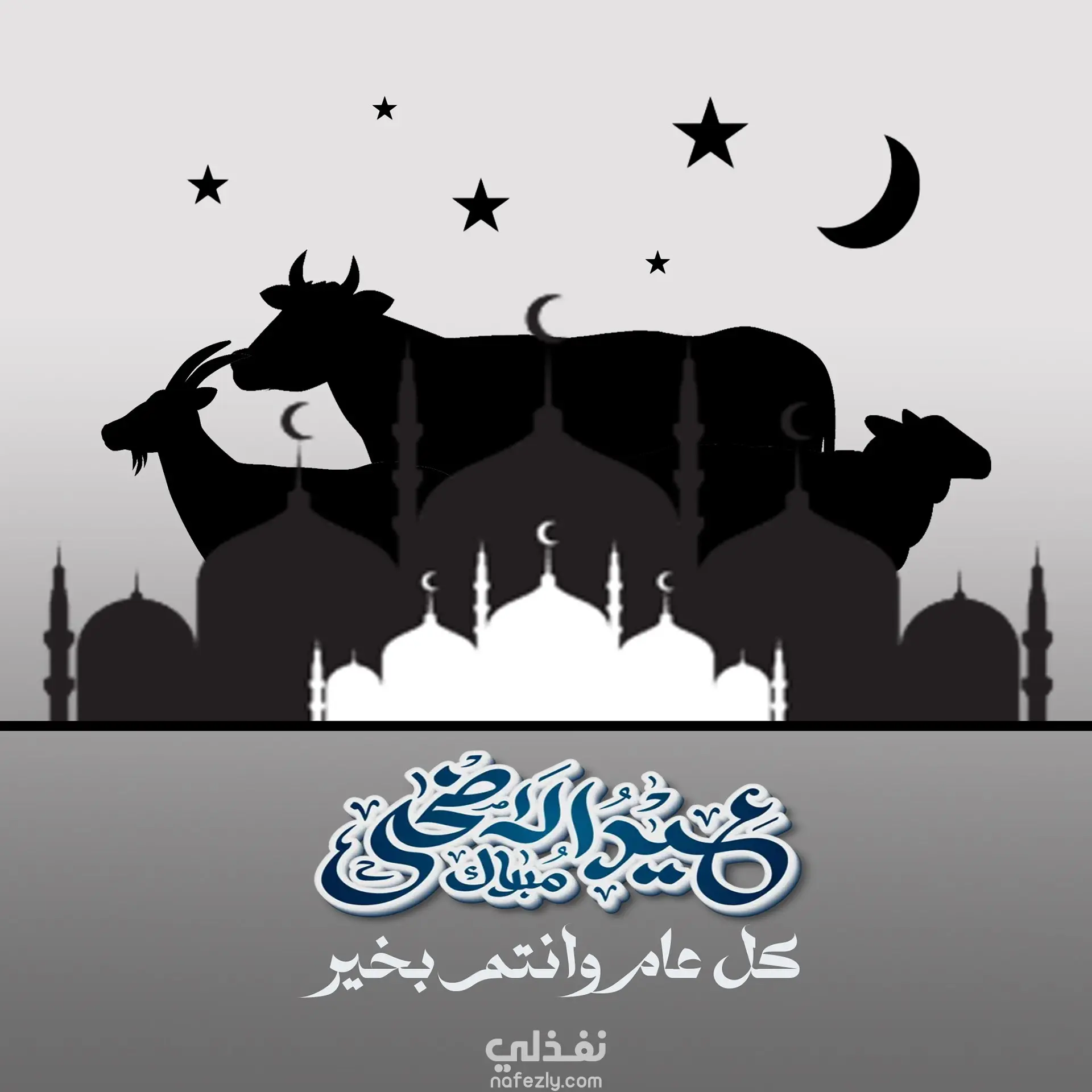 خلفيه لوان غامق مدرج و اضافه نجوم و هلال صوره معبر عن عيد الاضحي بمناسبه الدينيه كلامه معبر عن عيد الاضحي بخط زخرفي