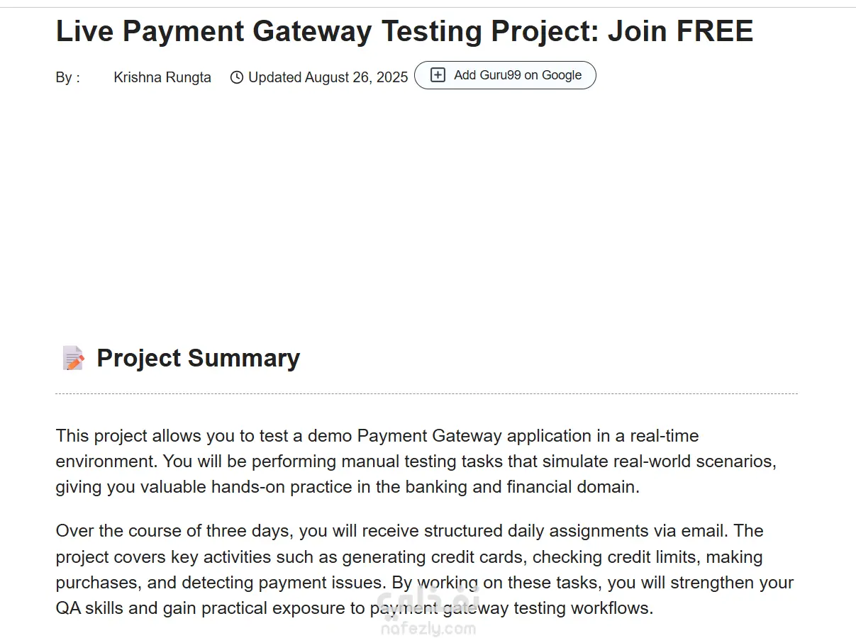 • Performed hands-on exploratory and functional testing on the Guru99 Payment Gateway live web • application. • Tested key modules including Credit Card Generation, Card Balance Verification, and Product • Purchase (Cart). • Conducted exploratory testing without predefined documentation to simulate real-world QA workflows. • Designed and executed detailed test scenarios and test cases for all major modules. • Identified and reported functional defects related to validation, transaction flow, and insufficient balance. • Documented test results using structured templates in Excel Sheet