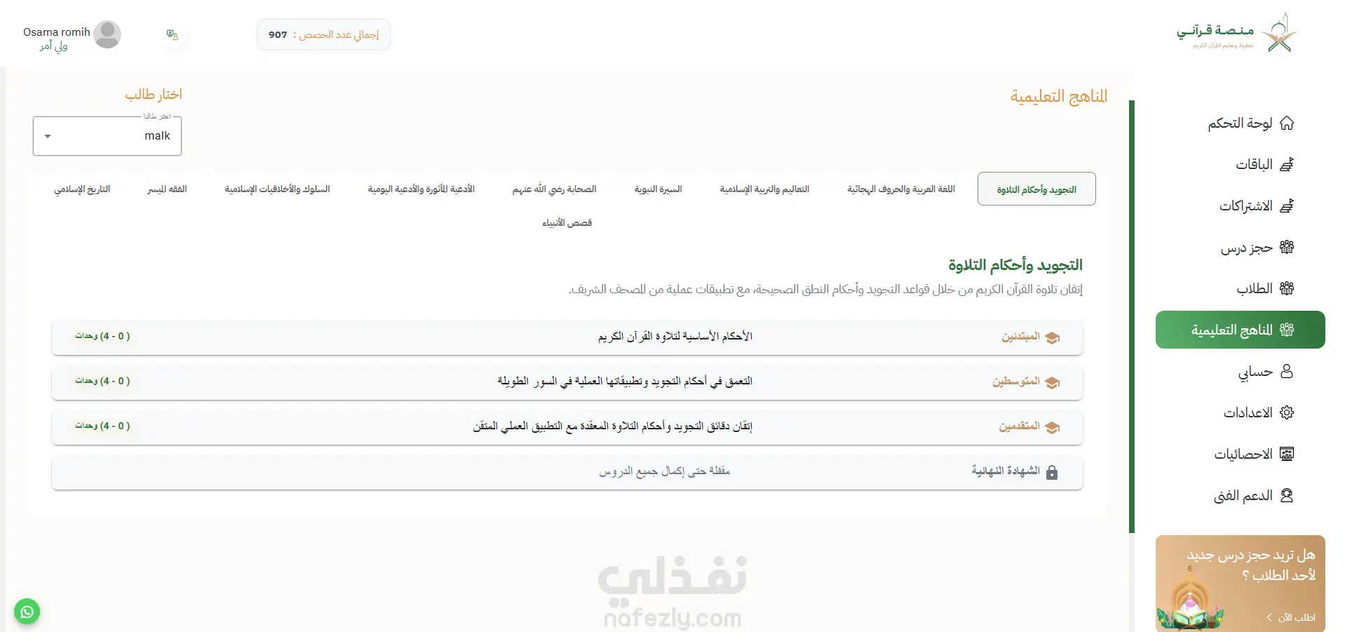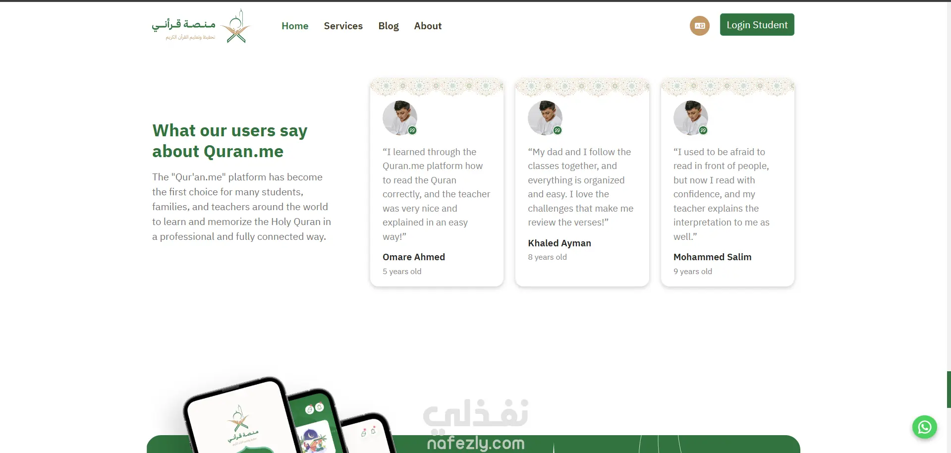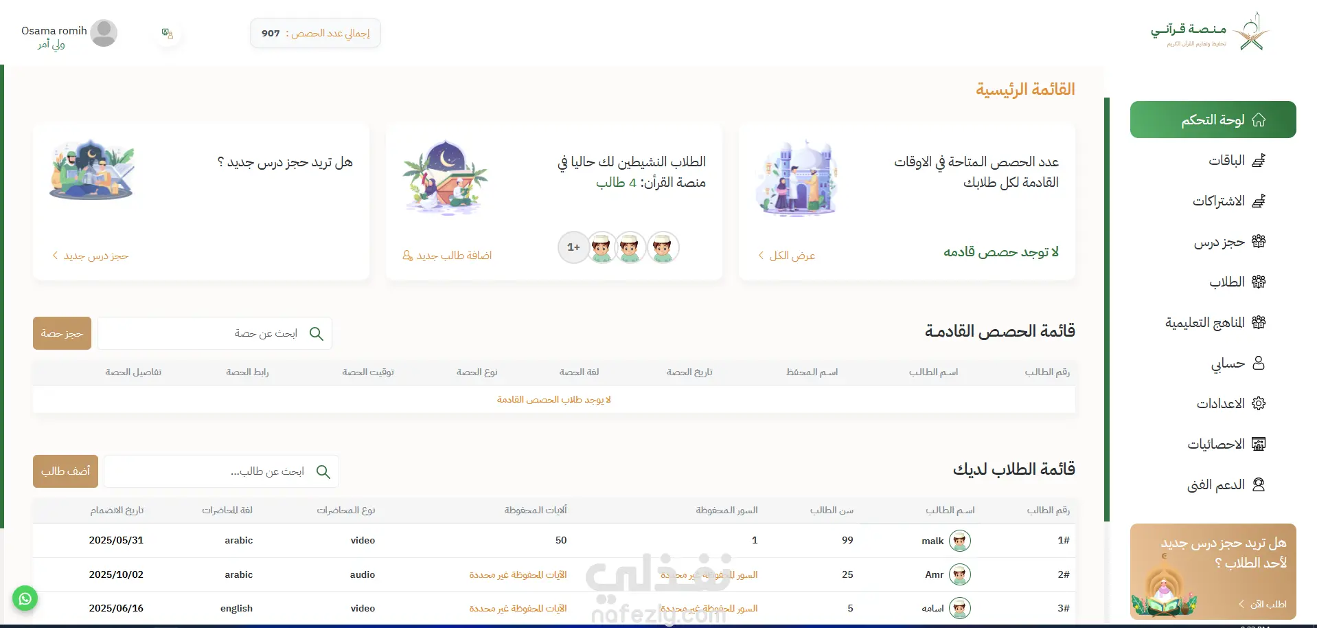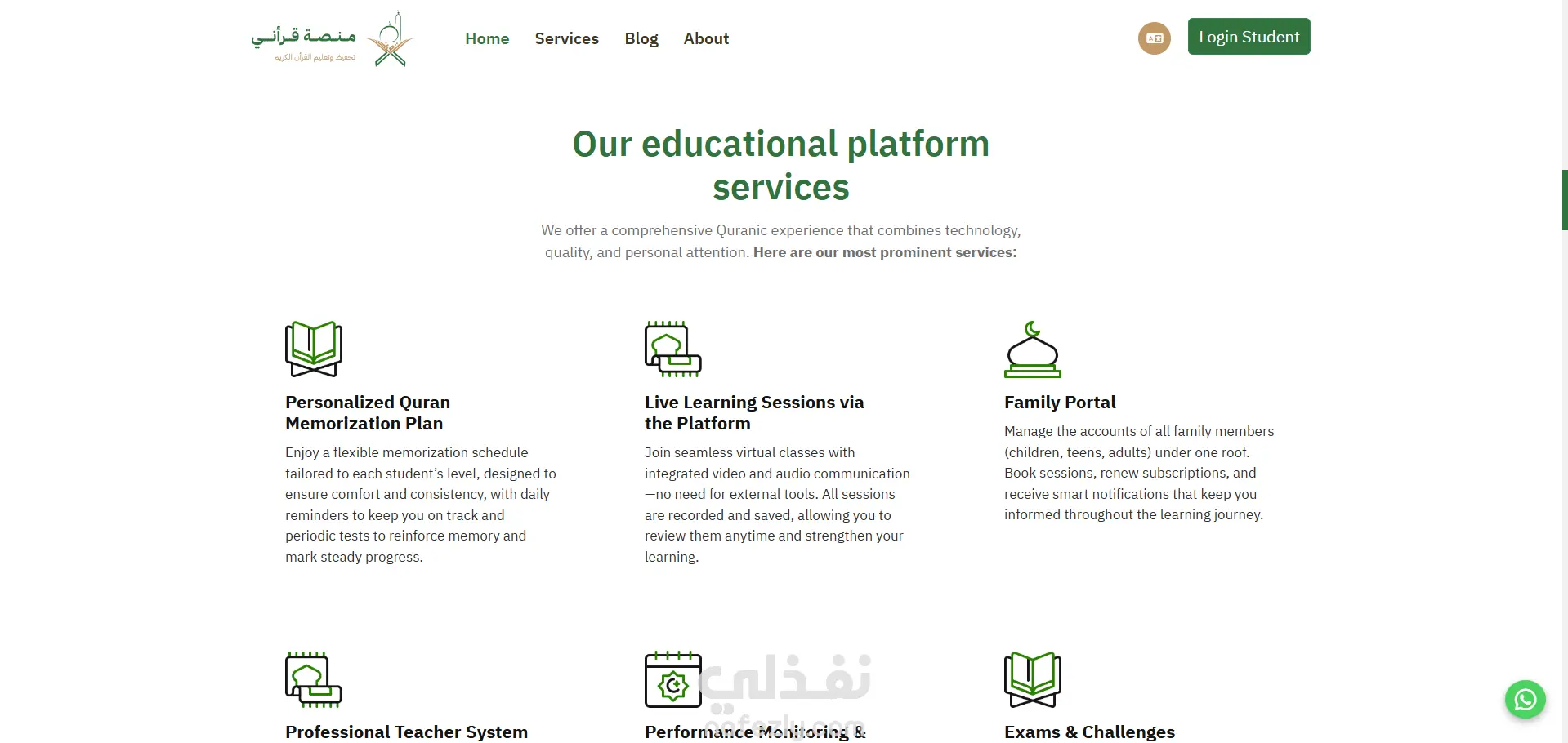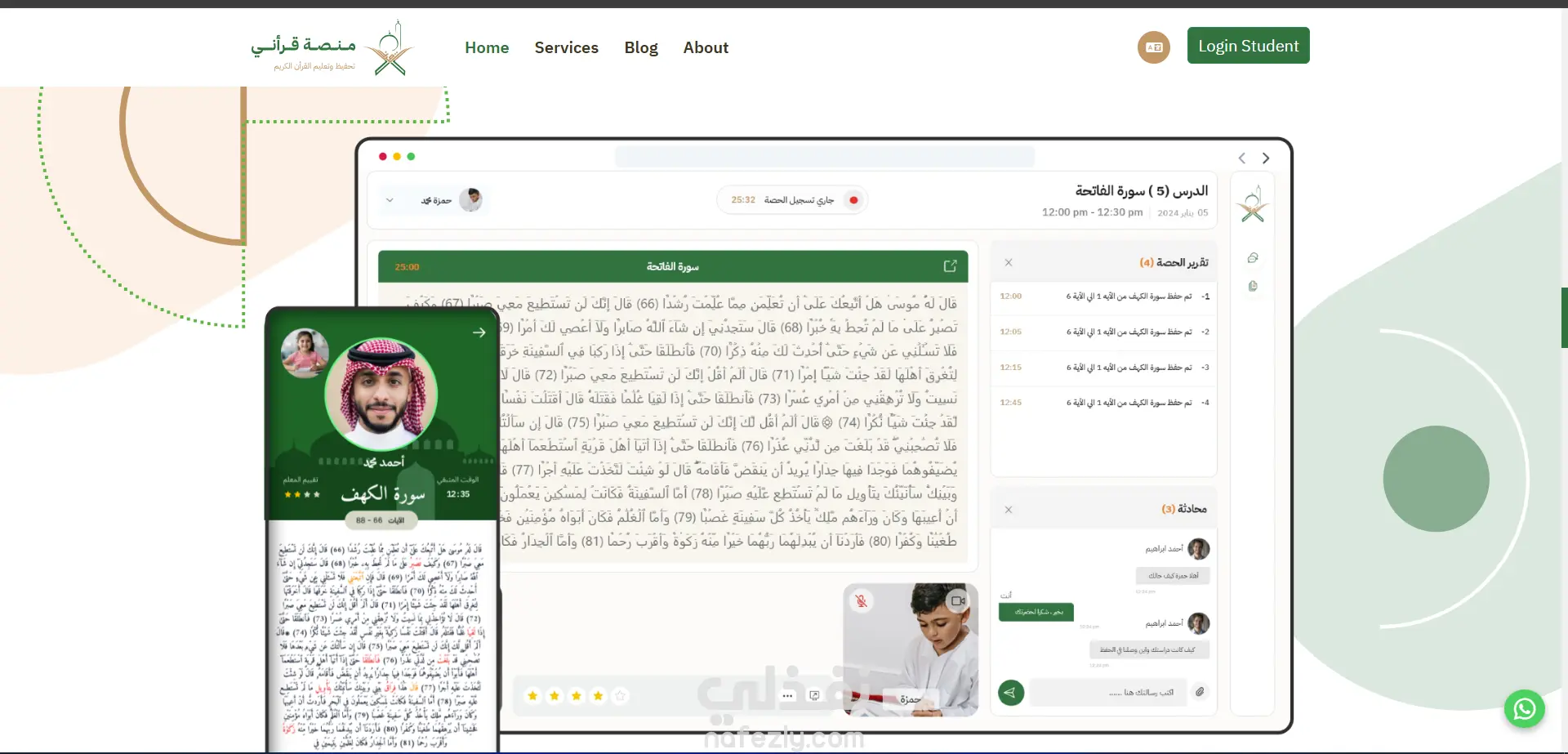 Q-Learn هو نظام تعليمي متكامل بالكامل لتعليم القرآن الكريم والمواد الإسلامية عبر الإنترنت، تم تصميمه باحترافية ليوفر تجربة تعليمية مرنة وسهلة لكل من الطلاب، أولياء الأمور، المعلمين، والإدارة. يتميز النظام بتعدد البورتالات، حيث يوفر: 🔹 بورتال الطلاب وأولياء الأمور إنشاء حساب ولي أمر مع إمكانية إضافة الأبناء ومتابعتهم بشكل كامل. حجز الباقات التعليمية حسب المستوى والاحتياجات. صفحة Dashboard متقدمة لعرض: الحصص السابقة والقادمة نسب الحضور التقييمات والإنجازات الاشتراكات الحالية والقديمة صفحة اختيار المناهج التعليمية (قرآن، تجويد، لغة عربية، دروس إسلامية…). نظام محادثة وإشعارات لتنبيه ولي الأمر بكل جديد. صفحة بروفايل كاملة للطالب وولي الأمر. 🔹 بورتال المعلمين إدارة الجدول اليومي والأسبوعي للحصص. إدارة الطلاب المشتركين مع كل معلّم. لوحة تحكم متقدمة توضح: عدد الحصص الطلاب الحضور والغياب المواعيد القادمة صفحة بروفايل احترافية لكل معلّم تشمل الخبرات والشهادات. 🔹 بورتال الإدارة (Admin Portal) تحكم شامل في النظام بالكامل: إدارة الطلاب والمعلمين إدارة الباقات إضافة/تعديل المناهج إدارة الاشتراكات والمدفوعات تقارير تفصيلية يومية وشهرية التحكم في الجلسات والحصص نظام صلاحيات متقدم للمستخدمين. 🔹 نظام جلسات (Live Sessions) داخلي متكامل ✔ بدون الاعتماد على Zoom أو Google Meet ✔ جلسات فيديو وصوت آمنة داخل المنصة ✔ مشاركة الشاشة ✔ رفع الواجبات ✔ حضور وغياب تلقائي ✔ تسجيل الجلسات للرجوع لها 📌 مميزات أخرى لجذب العميل تصميم UI/UX عصري وسهل الاستخدام. النظام ريسبونسيف بالكامل لجميع الأجهزة. متعدد اللغات (عربي/إنجليزي). نظام إشعارات عبر البريد والـ In-App. قاعدة بيانات قوية قابلة للتوسع. لوحة تحكم متطورة لإدارة كل تفاصيل المنصة. Q-Learn ليس مجرد موقع — إنه نظام تعليم إلكتروني كامل يناسب المؤسسات التعليمية والمراكز والمدارس الدينية.