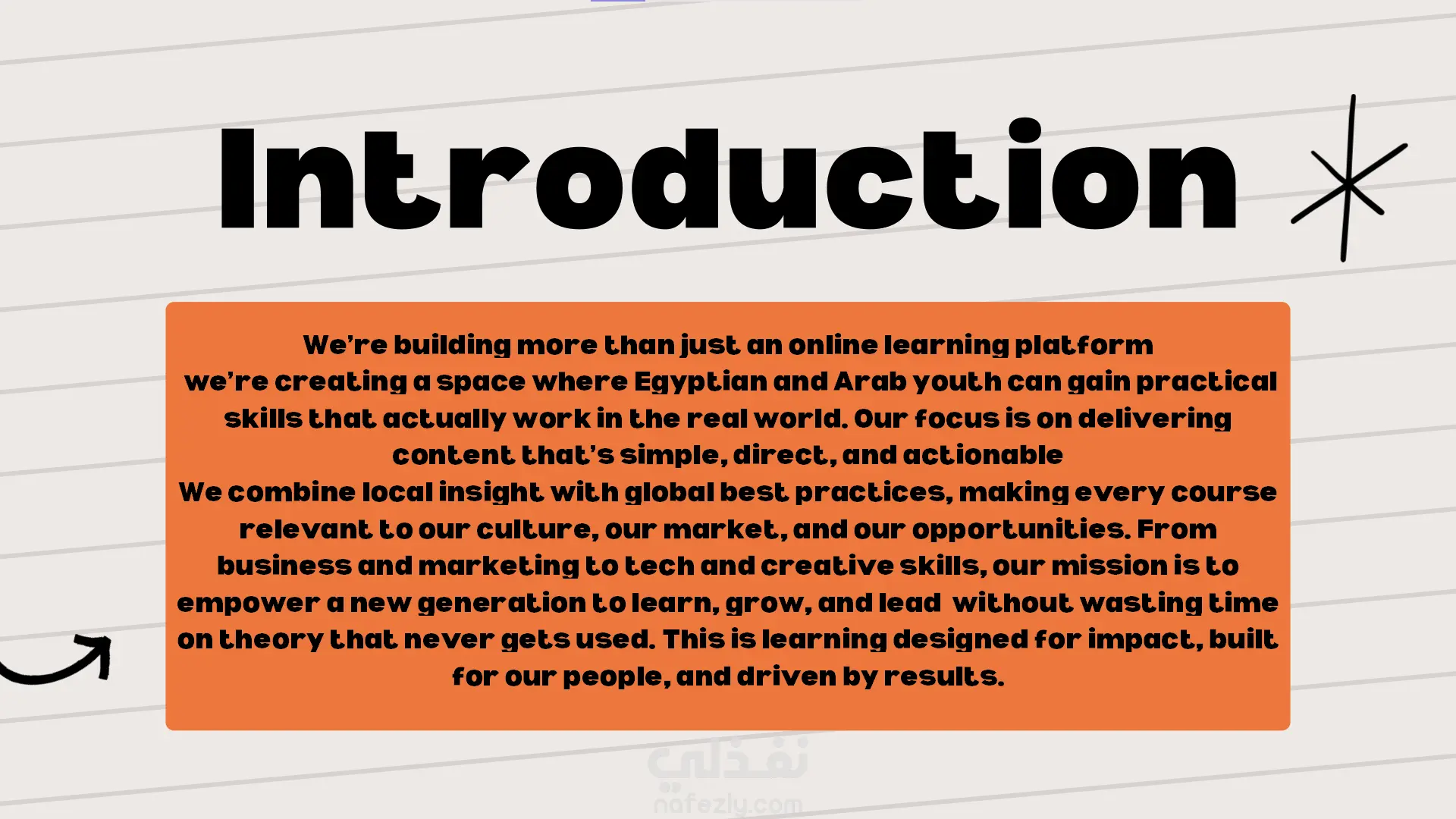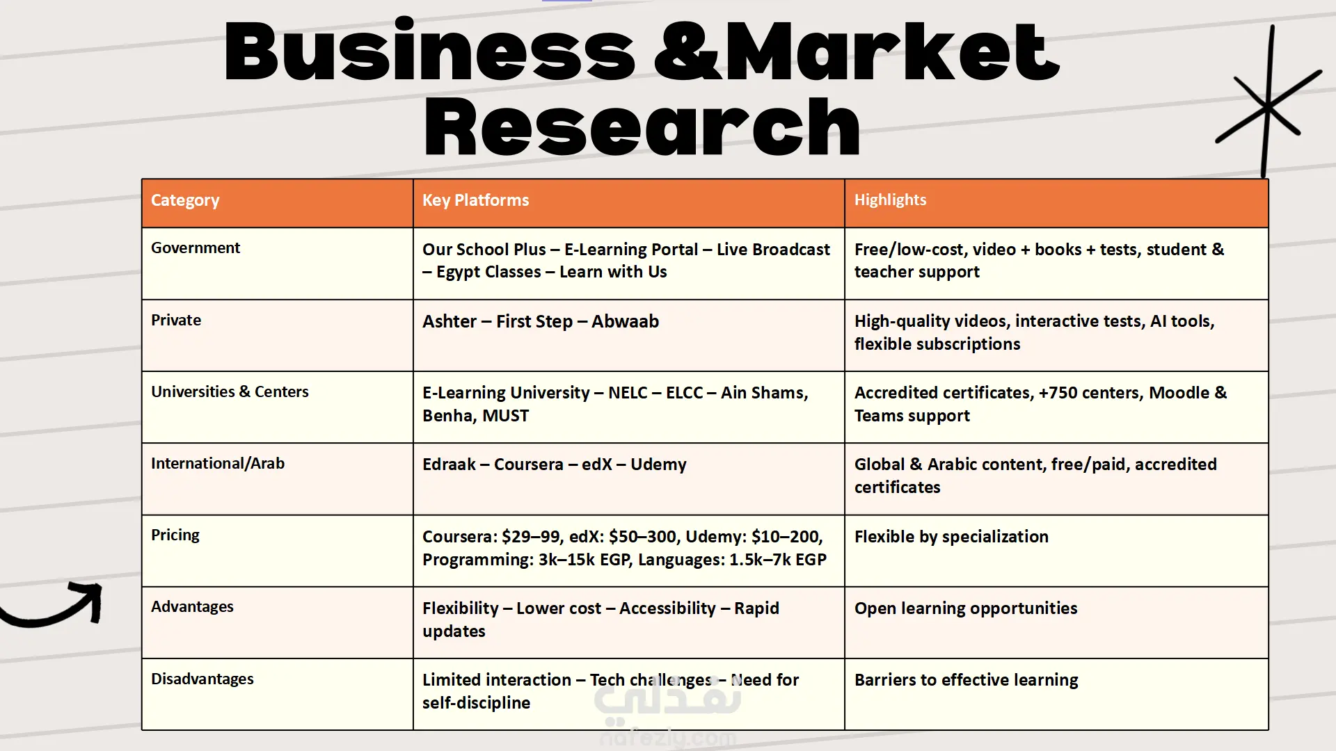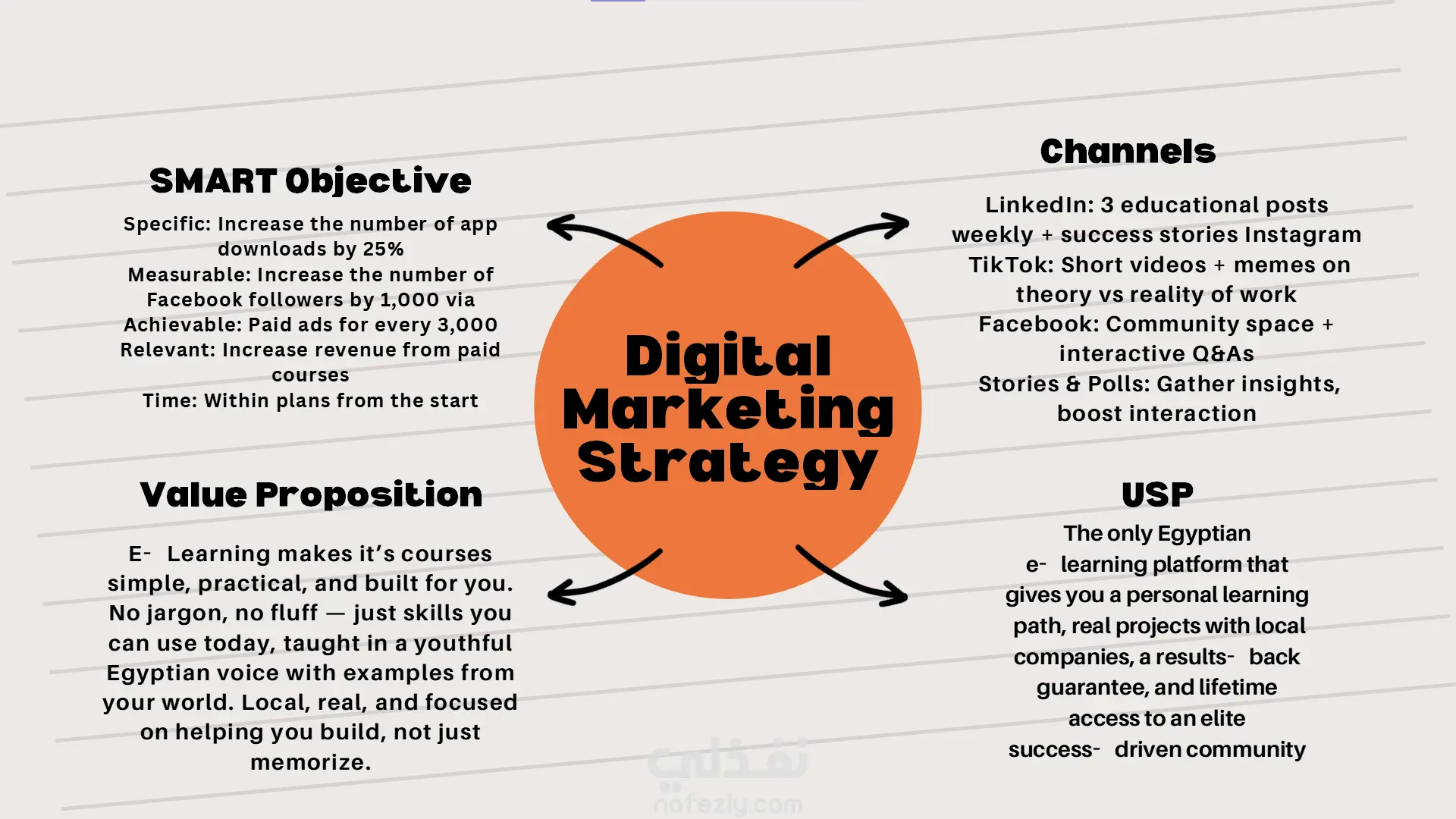صممت هذا المشروع لمجموعة من الطلبة كجزء من تخرجهم من تدريب المعهد القومي للاتصالات في مسار التسويق الرقمي ،ركزت فيه على إبراز مهاراتي في التصميم والعرض المرئي. قدرت ألخص دراسة سوق كاملة، تحليل منافسين، وخطة تسويق رقمية في عدد قليل من السلايدات بشكل منظم وبسيط، مع استخدام ألوان شبابية وستايل عصري يجذب الانتباه. الهدف كان أوضح إزاي أقدر أحوّل محتوى ضخم ومعقد إلى عرض بصري مختصر وواضح، يبرز قوة الفكرة ويخليها سهلة الفهم.