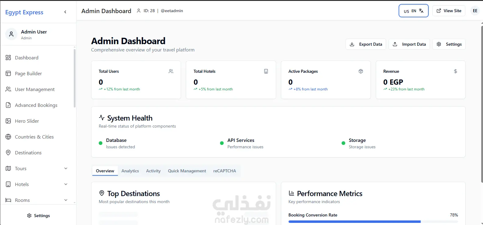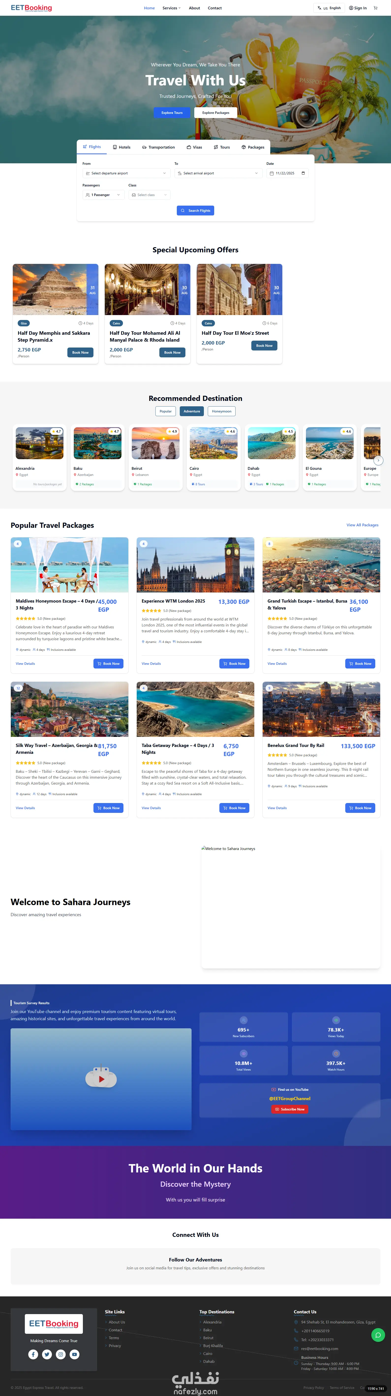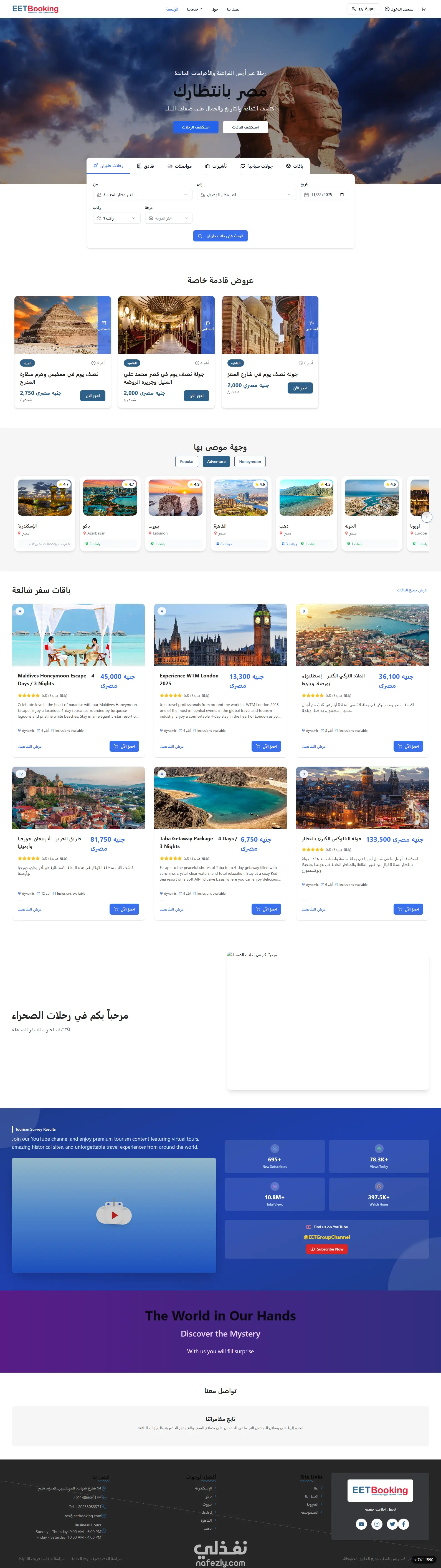 EETbooking منصة حجز سفر ذكية تشمل Dashboard منفصلة لإدارة الطلبات، بفلترات قوية، مقارنة عروض، ودعم فوري لتنظيم الرحلات والفنادق والنقل بسهولة. 1. Backend – السيرفر والعمليات الخلفية PHP / Laravel يستخدم النظام إطار Laravel لبناء API قوية وآمنة، مع إدارة متقدمة للـ Authentication، Roles، Permissions، Logging، وعمليات الحجز. RESTful API / JSON لتسهيل التكامل بين الويب، الموبايل، والـ Dashboard، وضمان سرعة وسهولة في تبادل البيانات. Caching (Redis) لتحسين سرعة تحميل الصفحات وتقليل الضغط على قاعدة البيانات، وخصوصًا في عمليات البحث عن الفنادق أو الرحلات. Queue System (Laravel Queue + Redis) لمعالجة المهام الثقيلة مثل إرسال الإيميلات، توليد ملفات الحجز، ومعالجة المدفوعات في الخلفية. 2. Frontend – واجهة المستخدم React / Next.js لواجهةٍ ديناميكية وسريعة مع تحسين SEO وتوفير أداء أعلى من خلال الـ SSR/SSG. TailwindCSS لتحسين المظهر وتوفير تصميم متجاوب سريع وخفيف. Axios / Fetch API للتعامل مع API الخلفية بسهولة وفعالية. State Management (Redux / Zustand) لإدارة حالة التطبيق بسلاسة خاصة أثناء عمليات البحث والحجز. 3. Dashboard Admin React + Vite لسرعة أعلى في التطوير والتحميل. Role-Based Access Control دعم كامل لتعدد الصلاحيات (Admin – Employee – Client). Charts باستخدام Chart.js أو Recharts لعرض تقارير الحجوزات، عدد العملاء، الإيرادات… إلخ. DataTables / AG-Grid لعرض البيانات الكبيرة مثل الحجوزات، المستخدمين، الطلبات، والفواتير. 4. Database – قواعد البيانات MySQL / MariaDB يتم تصميم قواعد البيانات باستخدام Normalization قوي لضمان السرعة وتنظيم العلاقات بين الجداول (الرحلات، الفنادق، الباقات، العملاء، الحجوزات). Eloquent ORM للتعامل مع الداتا بسهولة وسرعة، مع دعم العلاقات One-to-Many وMany-to-Many.