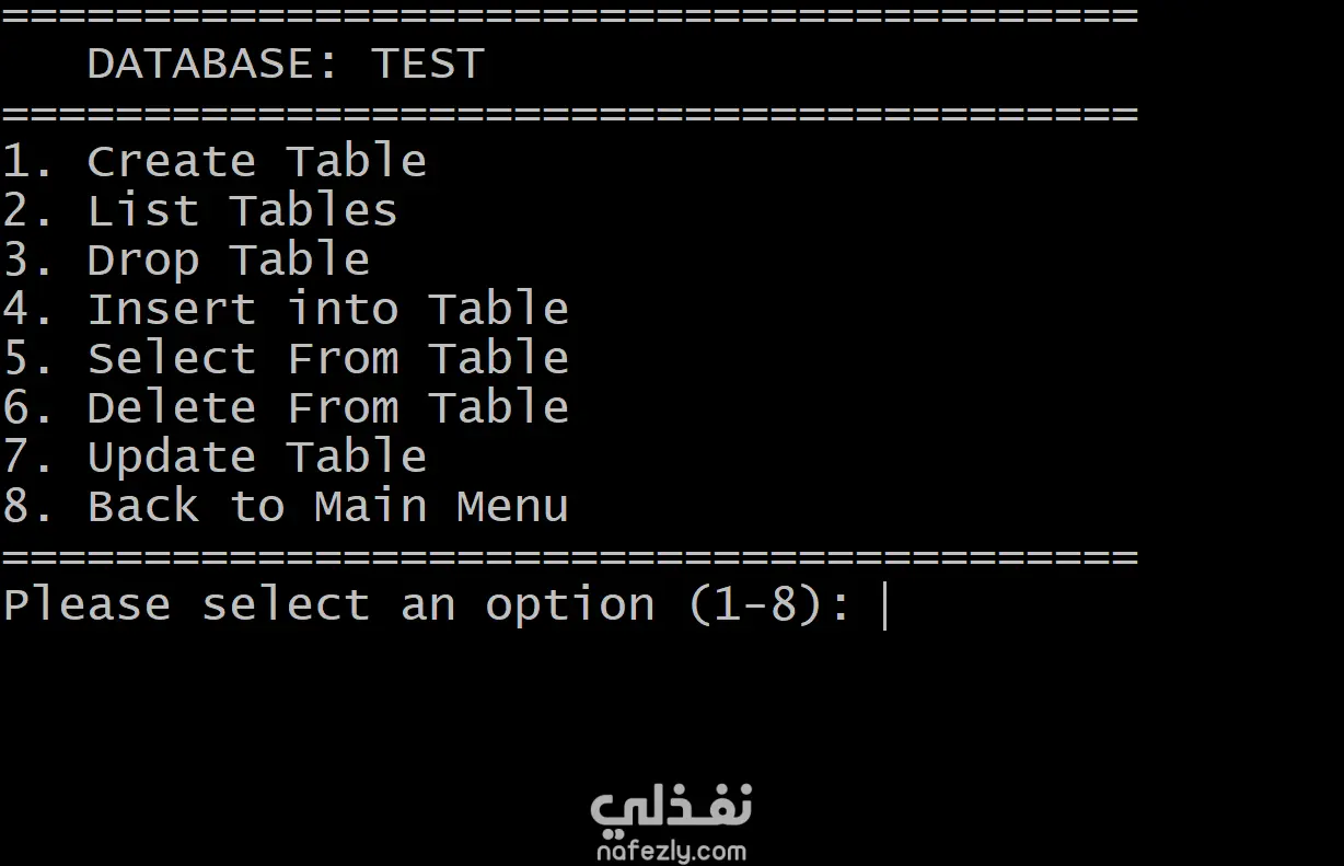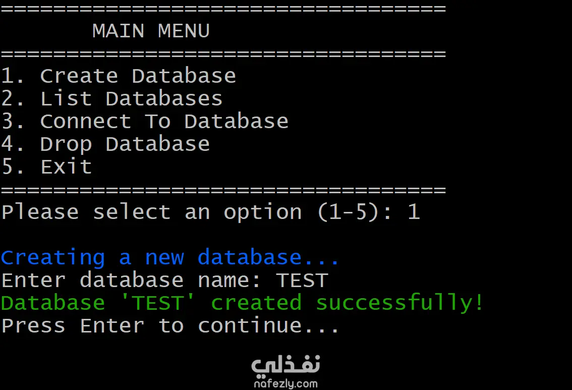 نظام إدارة قواعد بيانات (DBMS) خفيف يعتمد على القوائم وتم تنفيذه بالكامل باستخدام Bash. يتيح هذا المشروع للمستخدمين إنشاء وإدارة قواعد البيانات والجداول مباشرة من خلال الطرفية، مع تخزين البيانات في تنسيق ملفات نصية منظم.