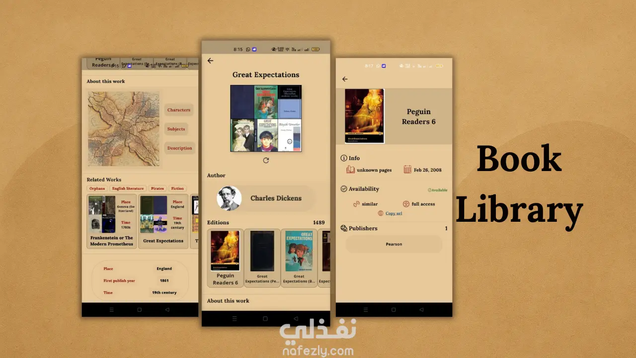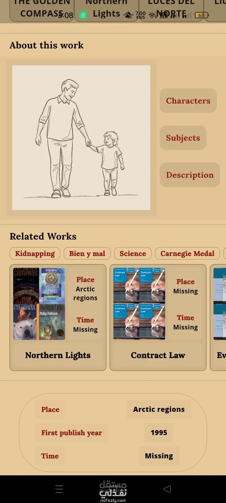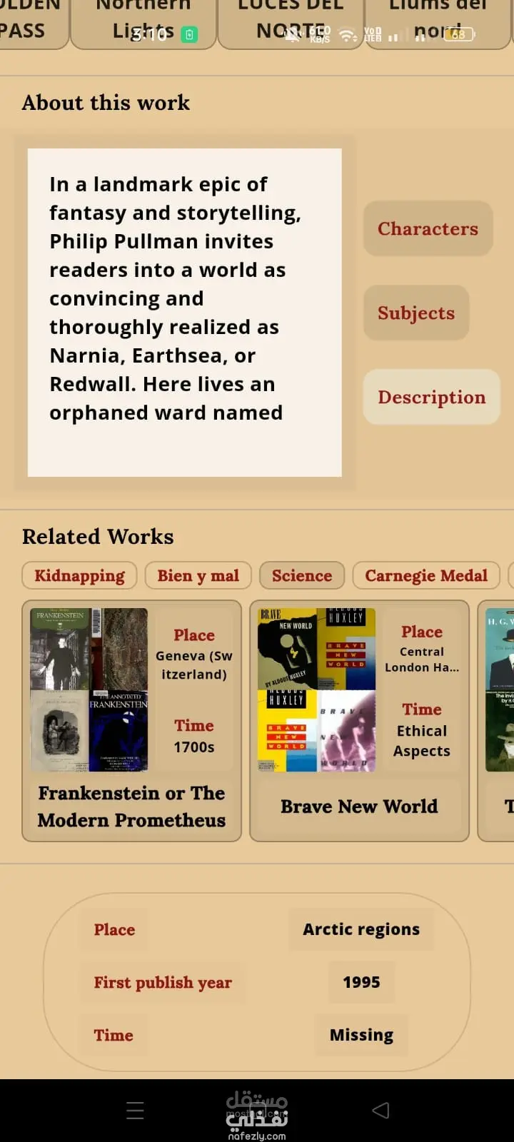 عند الضغط على أي كتاب، يتم فتح صفحة التفاصيل الخاصة به، والتي تتضمن معلومات مثل المؤلف، الموضوعات، الشخصيات، الأعمال المرتبطة، والأماكن أو الأزمنة المرتبطة بالقصة.