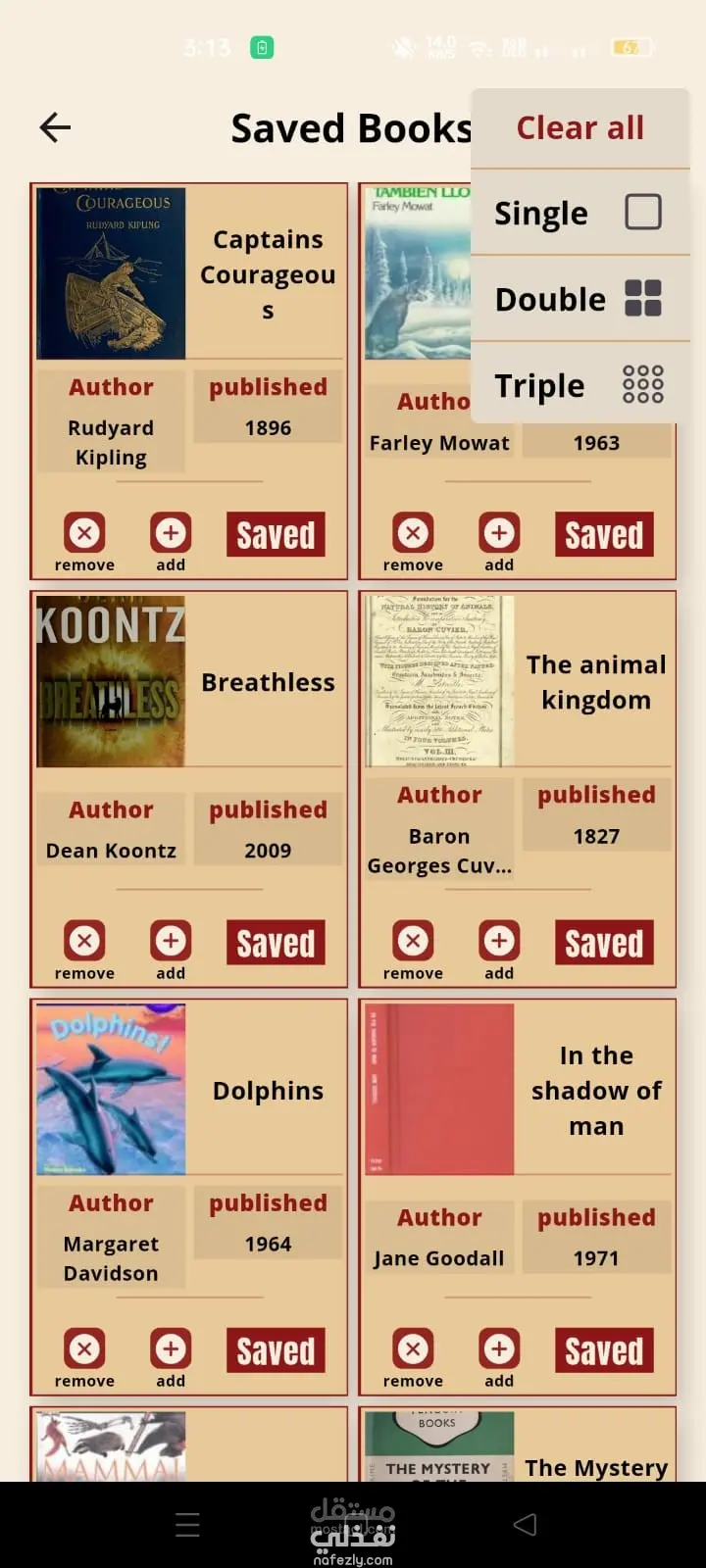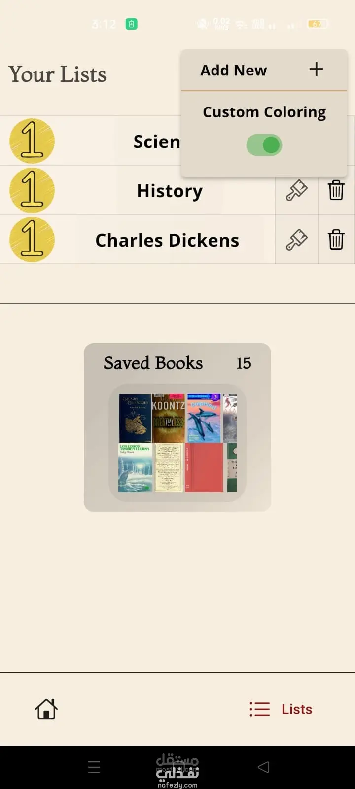 يمكن للمستخدم إنشاء قوائم مخصصة لتنظيم الكتب حسب رغبته، مع وجود قائمة افتراضية باسم "الكتب المحفوظة" للوصول السريع إلى الكتب المفضلة.