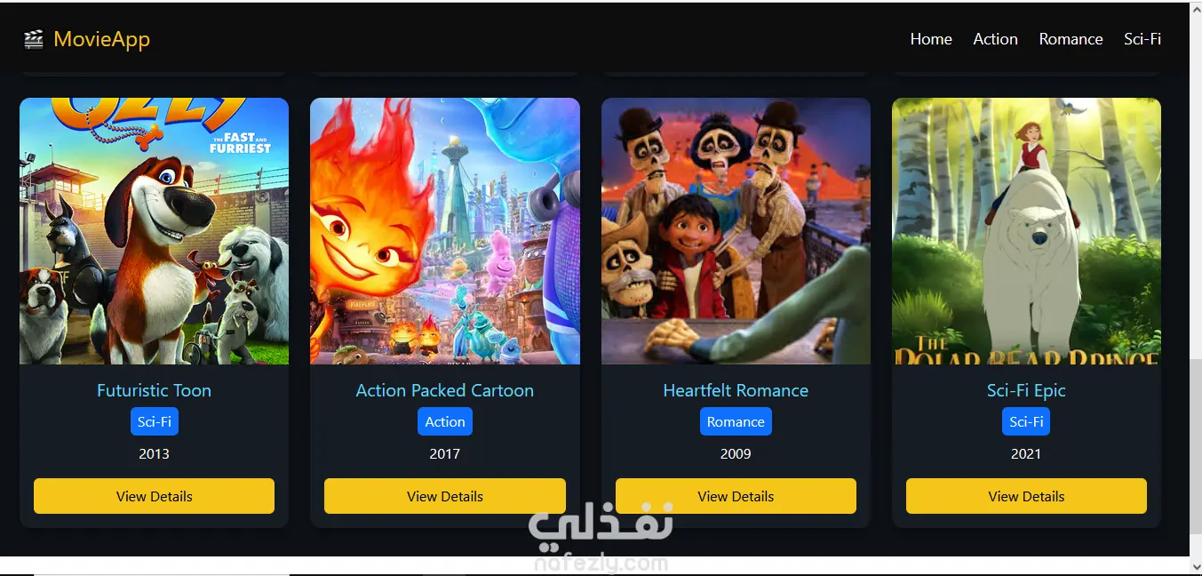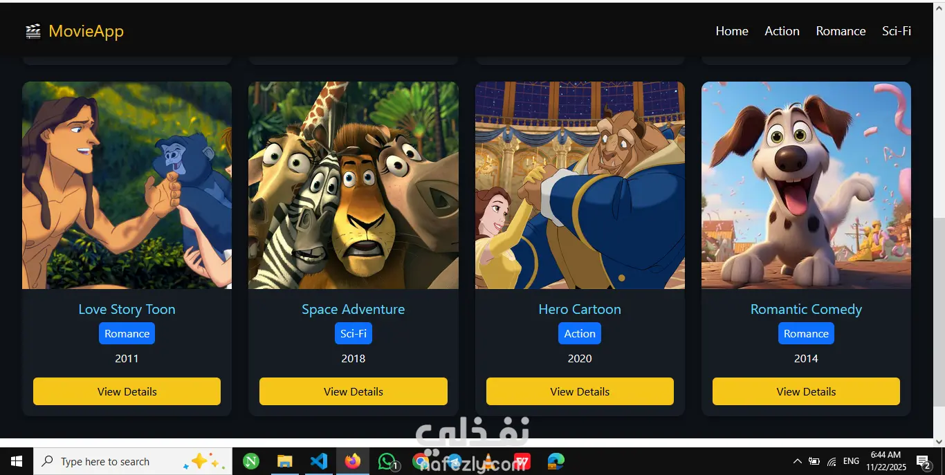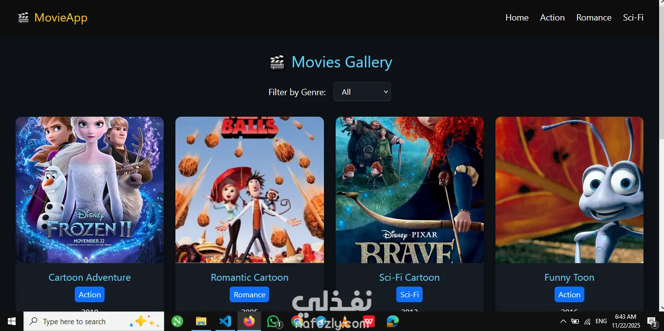عرض قائمة الأفلام من array علي شكل Cards كل card تحتوي علي صوره للفيلم وعنوانه ونوعه وسنه الاصدار export const movies = [ { id: 1, title: "Cartoon Adventure", genre: "Action", year: 2010, image: cartoon1 }, { id: 2, title: "Romantic Cartoon", genre: "Romance", year: 2005, image: cartoon2 }, { id: 3, title: "Sci-Fi Cartoon", genre: "Sci-Fi", year: 2012, image: cartoon3 }, { id: 4, title: "Funny Toon", genre: "Action", year: 2016, image: cartoon4 }, { id: 5, title: "Love Story Toon", genre: "Romance", year: 2011, image: cartoon5 }, { id: 6, title: "Space Adventure", genre: "Sci-Fi", year: 2018, image: cartoon6 }, { id: 7, title: "Hero Cartoon", genre: "Action", year: 2020, image: cartoon7 }, { id: 8, title: "Romantic Comedy", genre: "Romance", year: 2014, image: cartoon8 }, ]; يوجد Dropdown للفلترة حسب النوع Genre: Action / Romance / Sci-Fi / All عند اختيار النوع : يتم عرض الأفلام الخاصة بالنوع فقط. عند الضغط علي أحد ألأفلام يتم عرض تفاصيل الفيلم: -عنوان الفيلم -سنة العرض -وصف مختصر -زر Back to List