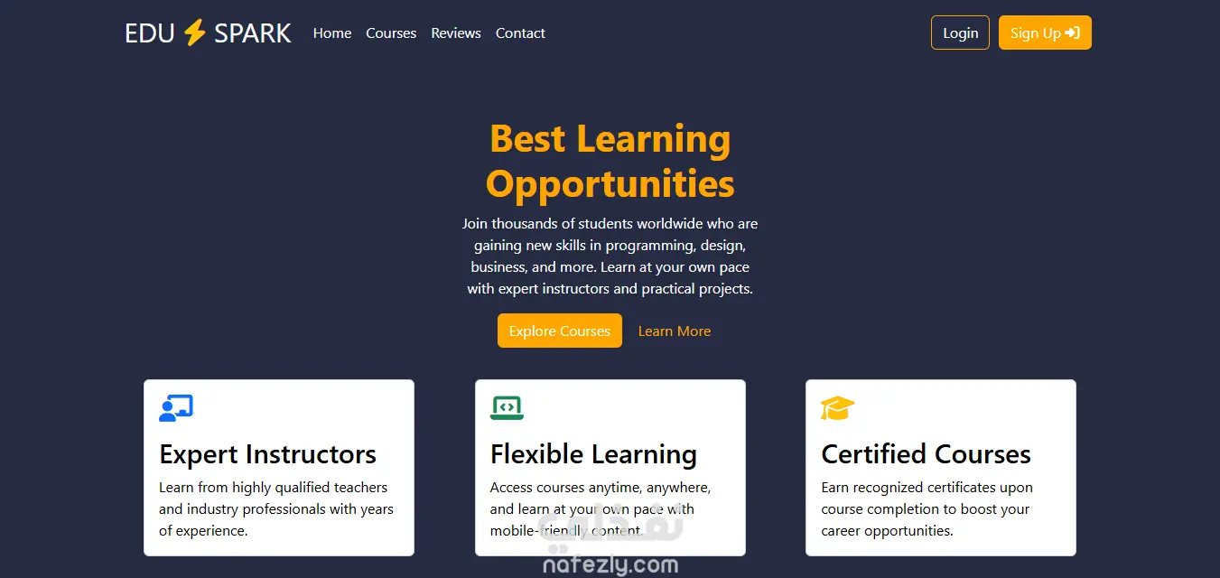 EduSpark هو موقع تعليمي حديث ومتجاوب يقدّم دورات أونلاين في البرمجة والتصميم والأعمال وغيرها. تم بناؤه باستخدام HTML وCSS وBootstrap وFont Awesome، مما يضمن منصة تعليمية احترافية ومتوافقة مع أجهزة الموبايل.