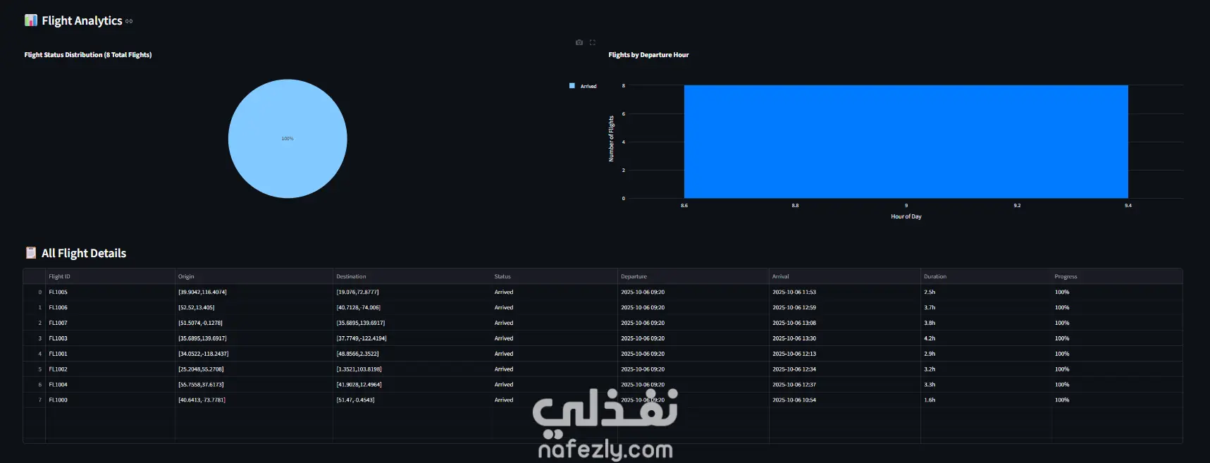 يهدف هذا المشروع إلى إنشاء مسار بيانات حديث لتوليد ونقل ومعالجة وتصوير بيانات وهمية لأحداث الرحلات الجوية. يستخدم النظام Python (Faker) لإنتاج أحداث رحلات افتراضية تُنقل عبر Kafka كوسيط رسائل لحظي. يقوم Spark Structured Streaming باستهلاك ومعالجة هذه الأحداث، وتحويل البيانات قبل حفظها في قاعدة بيانات PostgreSQL. أخيراً، تُعرض تفاصيل ومواقع وحالات الرحلات (في الوقت المحدد، متأخرة، ملغاة) في لوحة معلومات تفاعلية عبر Streamlit وفي الوقت الفعلي. تُستخدم حاويات Docker Compose لتنسيق وتشغيل جميع الخدمات في بيئة قوية وقابلة للاستنساخ.