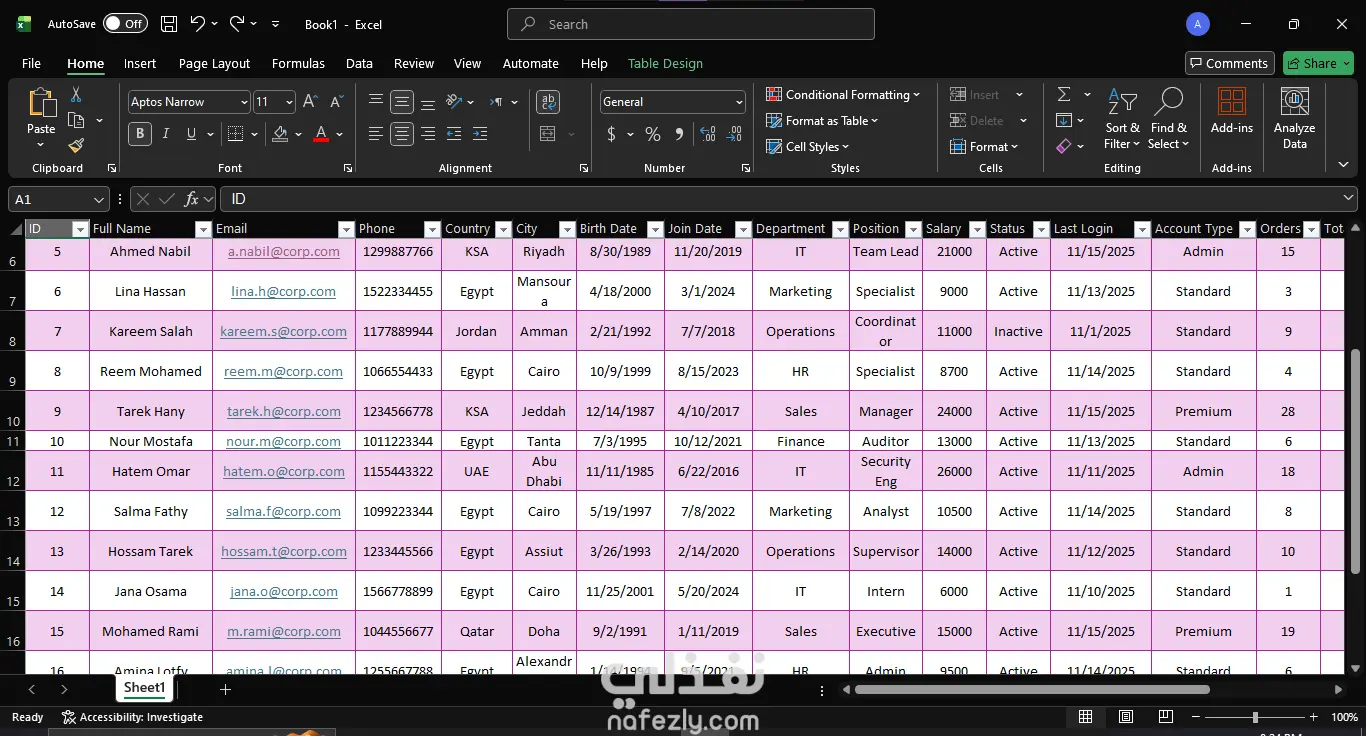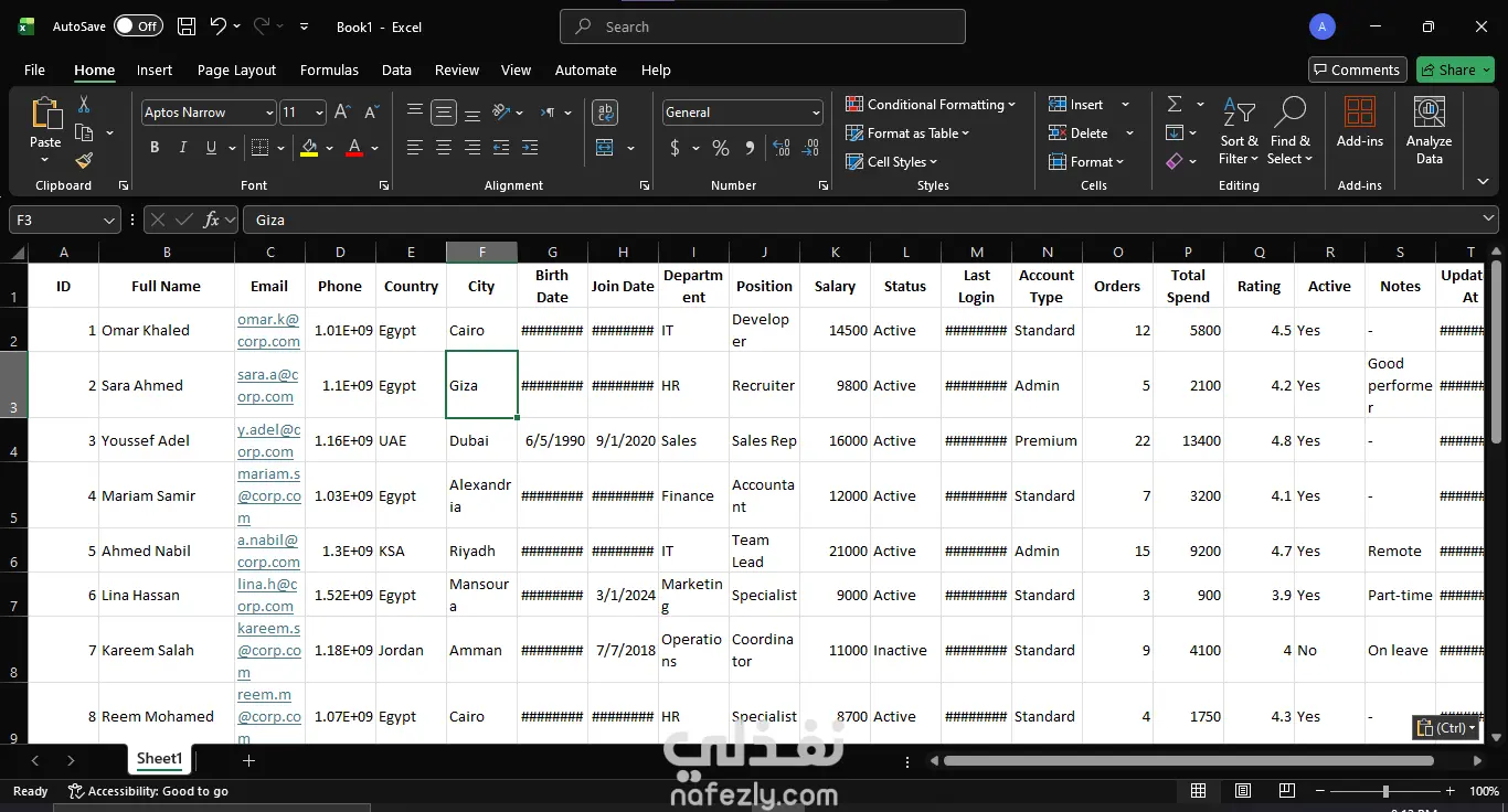 إدخال البيانات يدويًا في الخلايا المطلوبة. تنسيق الصفوف والأعمدة لضمان وضوح الملف وسهولة الاستخدام. التأكد من دقة المعلومات وصياغتها بشكل احترافي. عدد الخلايا 400 خلية