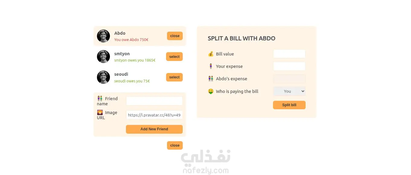 Split Bill Form: When a friend is selected from the list, a special form appears to split a bill with that specific person. The form requires inputs for: