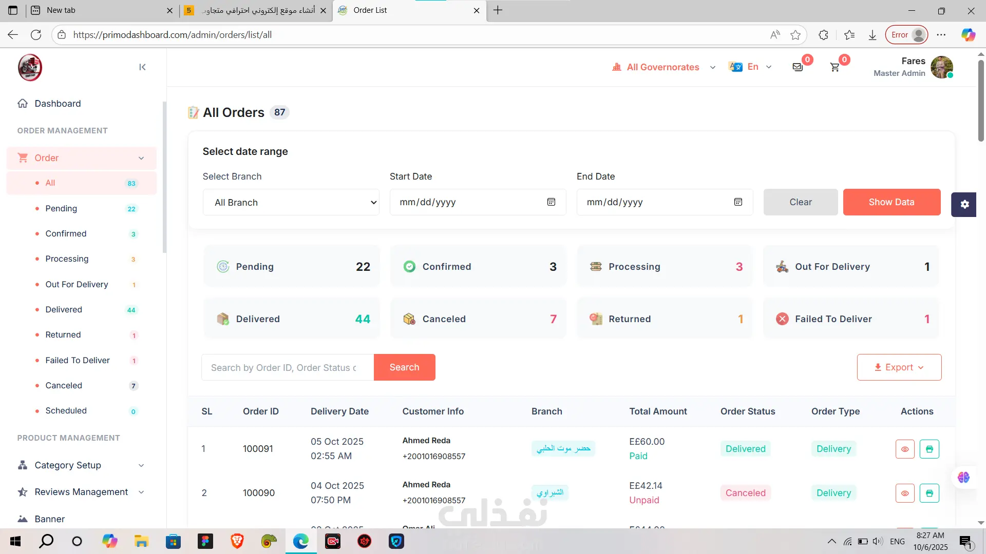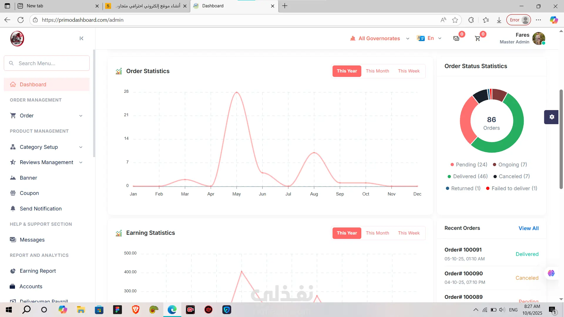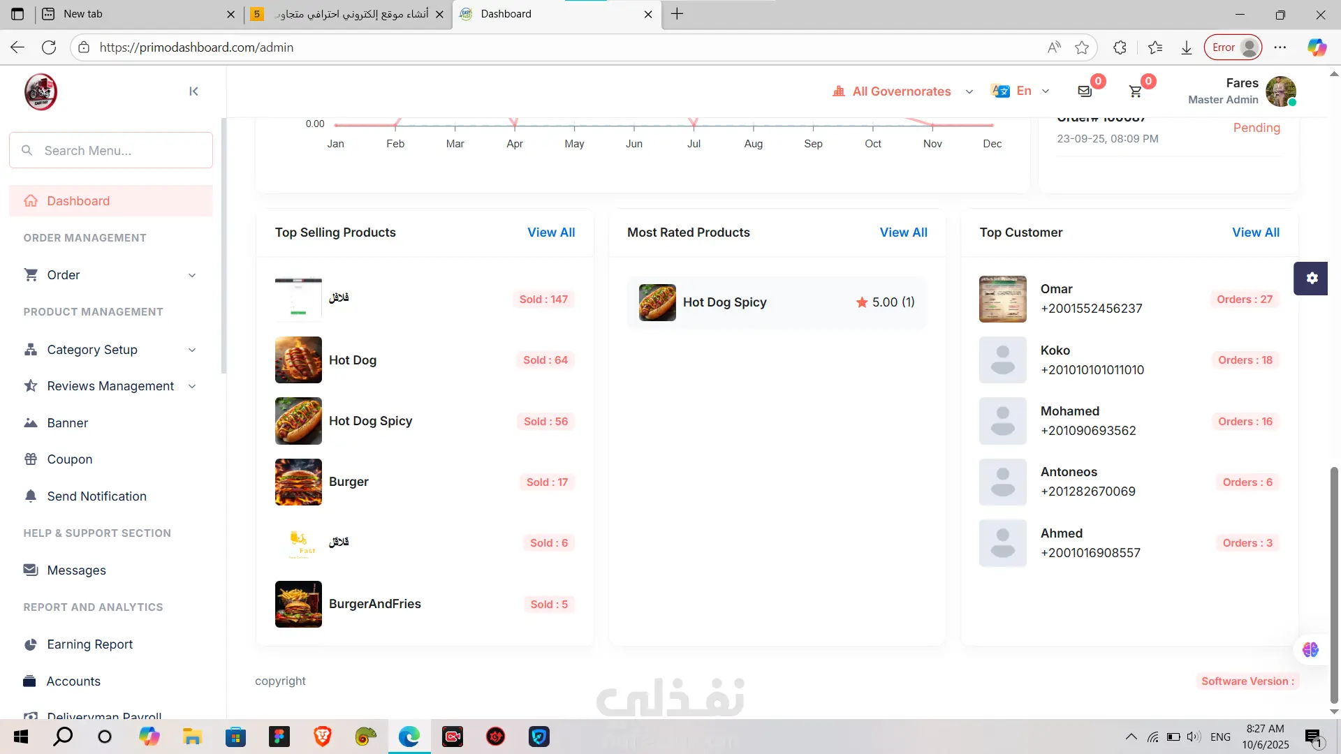 PrimoDashboard هي لوحة تحكم (Admin Dashboard) احترافية متكاملة لإدارة المطاعم وخدمات التوصيل (Delivery).