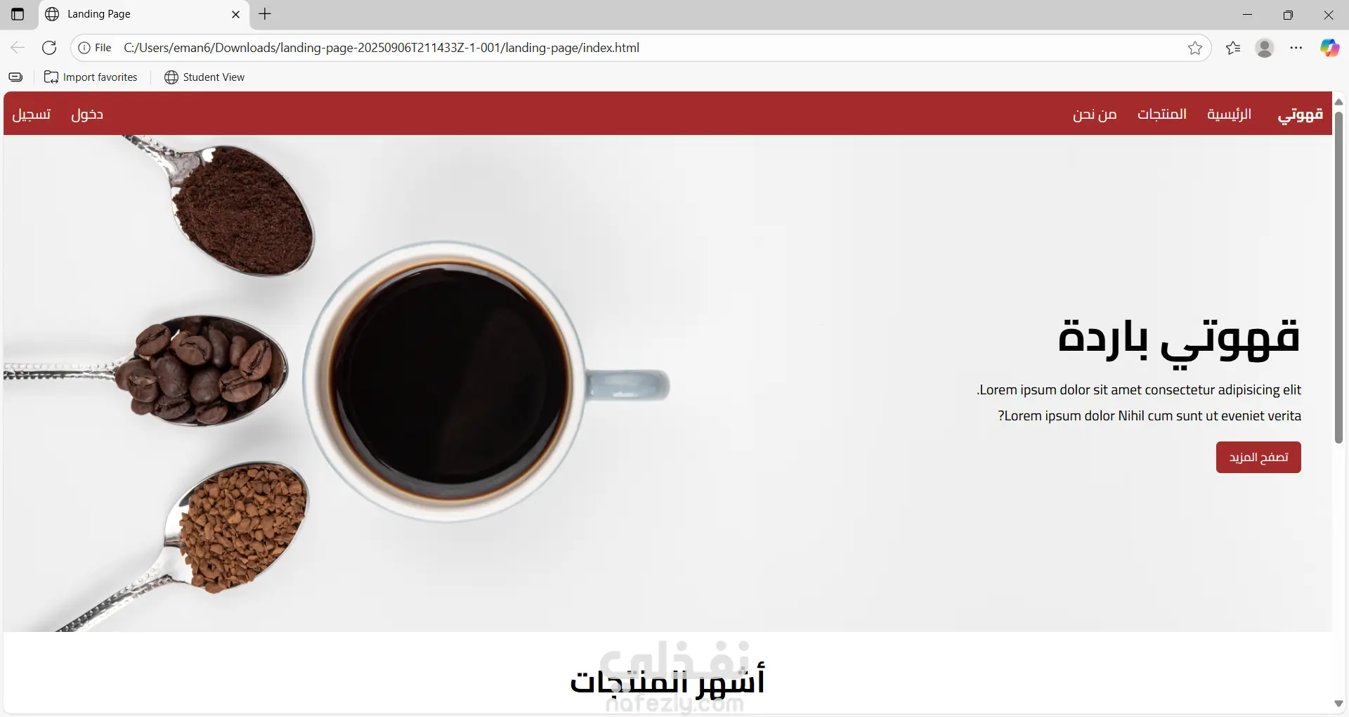 قمتُ بتصميم وتطوير واجهة موقع ويب لمقهى "قهوتي باردة"، حيث ركزتُ على إبراز هوية المقهى من خلال تصميم بسيط وجذاب يعرض المنتجات والخدمات بشكل منظم وملفت. اعتمدتُ في التنفيذ على تقنيات HTML, CSS, JavaScript مع توظيف مكتبة React لزيادة التفاعل وسرعة الأداء. الموقع متجاوب مع جميع الأجهزة (موبايل، تابلت، كمبيوتر)، مما يتيح للمستخدمين تجربة سلسة وسهلة في التصفح. كما حرصتُ على كتابة كود نظيف ومنظم يسهل تطويره مستقبلًا، مع تحسين سرعة تحميل الصفحات وتجربة المستخدم بشكل عام.