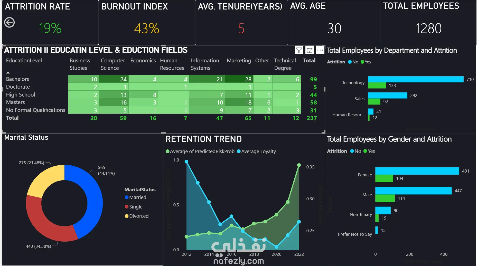 قمت بتصميم وتنفيذ لوحة معلومات تفاعلية (Dashboard) لقياس وتحليل معدل الرحيل الوظيفي داخل الشركة، مع تحليل شامل للعوامل المؤثرة مثل معدل الاحتراق الوظيفي، متوسط سنوات الخبرة، العمر، الحالة الاجتماعية، النوع الاجتماعي، والتوزيع حسب الأقسام والتخصصات. تعتمد الداشبورد على عرض KPIs أساسية مثل: نسبة الرحيل الوظيفي (Attrition Rate) مؤشر الاحتراق الوظيفي (Burnout Index) متوسط سنوات البقاء إجمالي عدد الموظفين كما تحتوي على تحليلات تفصيلية توضح: توزيع الرحيل حسب الأقسام علاقة التعليم والتخصص بمعدلات الرحيل تحليل الموظفين حسب النوع الاجتماعي الحالة الاجتماعية للموظفين اتجاهات الاحتفاظ بالموظفين عبر السنوات (Retention Trend) الدashboard توفر نظرة واضحة تساعد الإدارة في اتخاذ قرارات مدعومة بالبيانات لتحسين بيئة العمل وتقليل معدلات الرحيل.