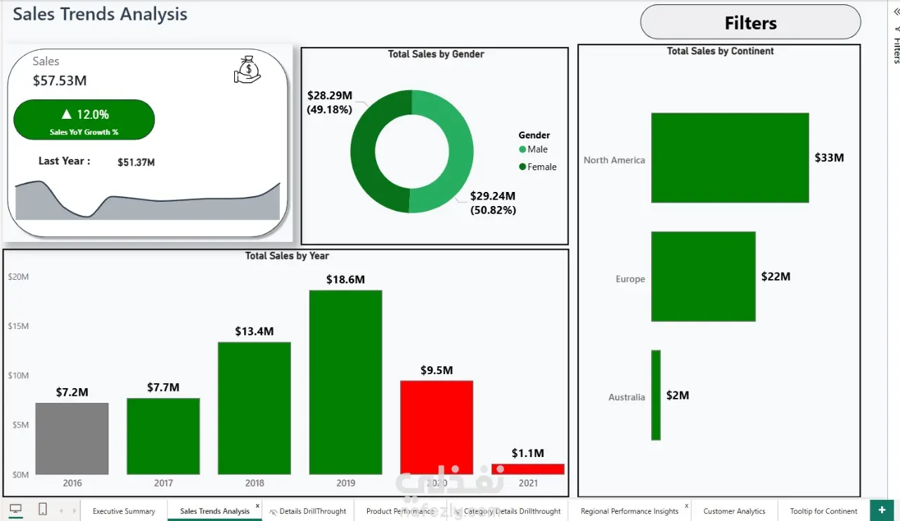 وظيفة اللوحة: توفير تحليل مفصل لأداء المبيعات من خلال تقسيم البيانات حسب **الجنس** و**القارة** و**الاتجاه الزمني**. **الأداء العام:** - إجمالي المبيعات: **57.53 مليون دولار** - نمو المبيعات عن العام الماضي: **12%** **توزيع المبيعات حسب الجنس:** - **الإناث:** 29.24 مليون دولار (50.82%) - **الذكور:** 28.29 مليون دولار (49.18%) **توزيع المبيعات حسب القارة:** - **أمريكا الشمالية:** الأعلى أداءً (33 مليون دولار) - **أوروبا:** 20 مليون دولار - **أستراليا:** 7.2 مليون دولار **اتجاه المبيعات عبر السنوات (2016-2021):** - نمو مستمر ومطرد في جميع القارات - أمريكا الشمالية وأوروبا تسجلان أعلى معدلات النمو - قارة أستراليا تحقق نمواً ثابتاً ولكن بمستوى أقل **التحليلات الإضافية المتاحة:** - إمكانية الحصول على تفاصيل أكثر depth من خلال الأقسام الأخرى - تحليل أداء المنتجات - تحليل الأداء regional - تحليلات العملاء **الاستنتاج:** أداء متوازن بين الجنسين، مع هيمنة واضحة لأمريكا الشمالية على حصة السوق، ونمو صحي ومستقر عبر جميع الأسواق خلال السنوات الست الماضية.