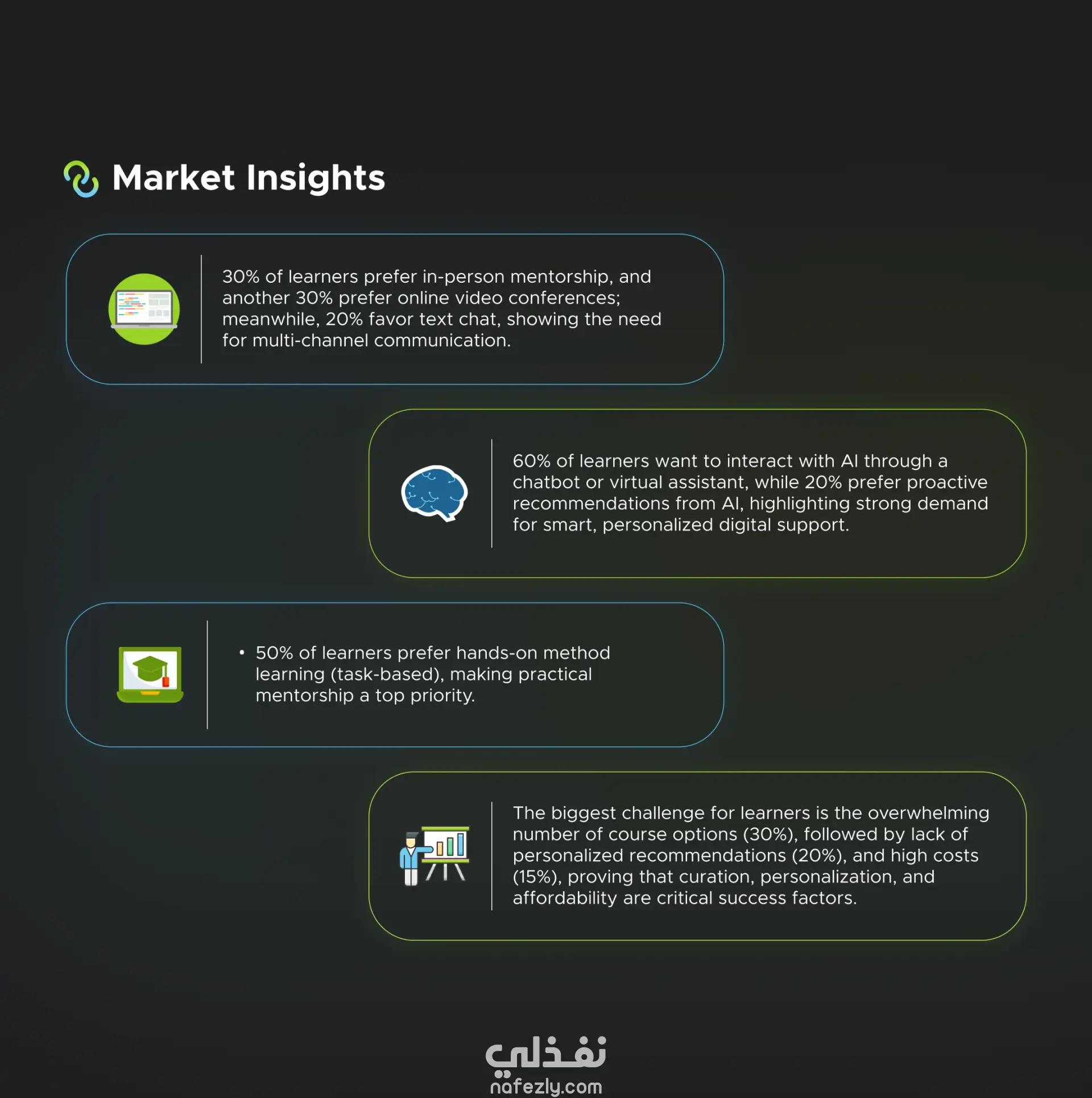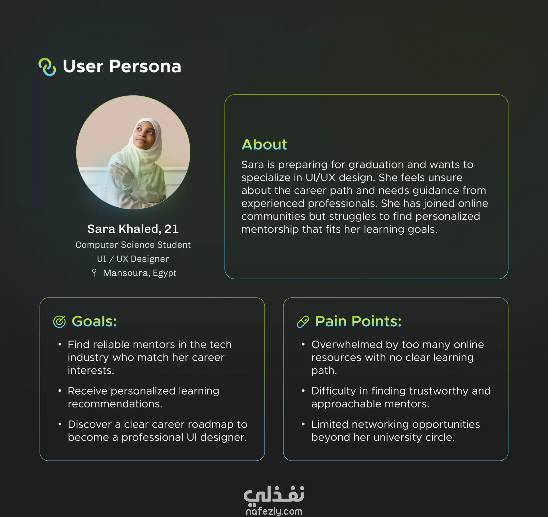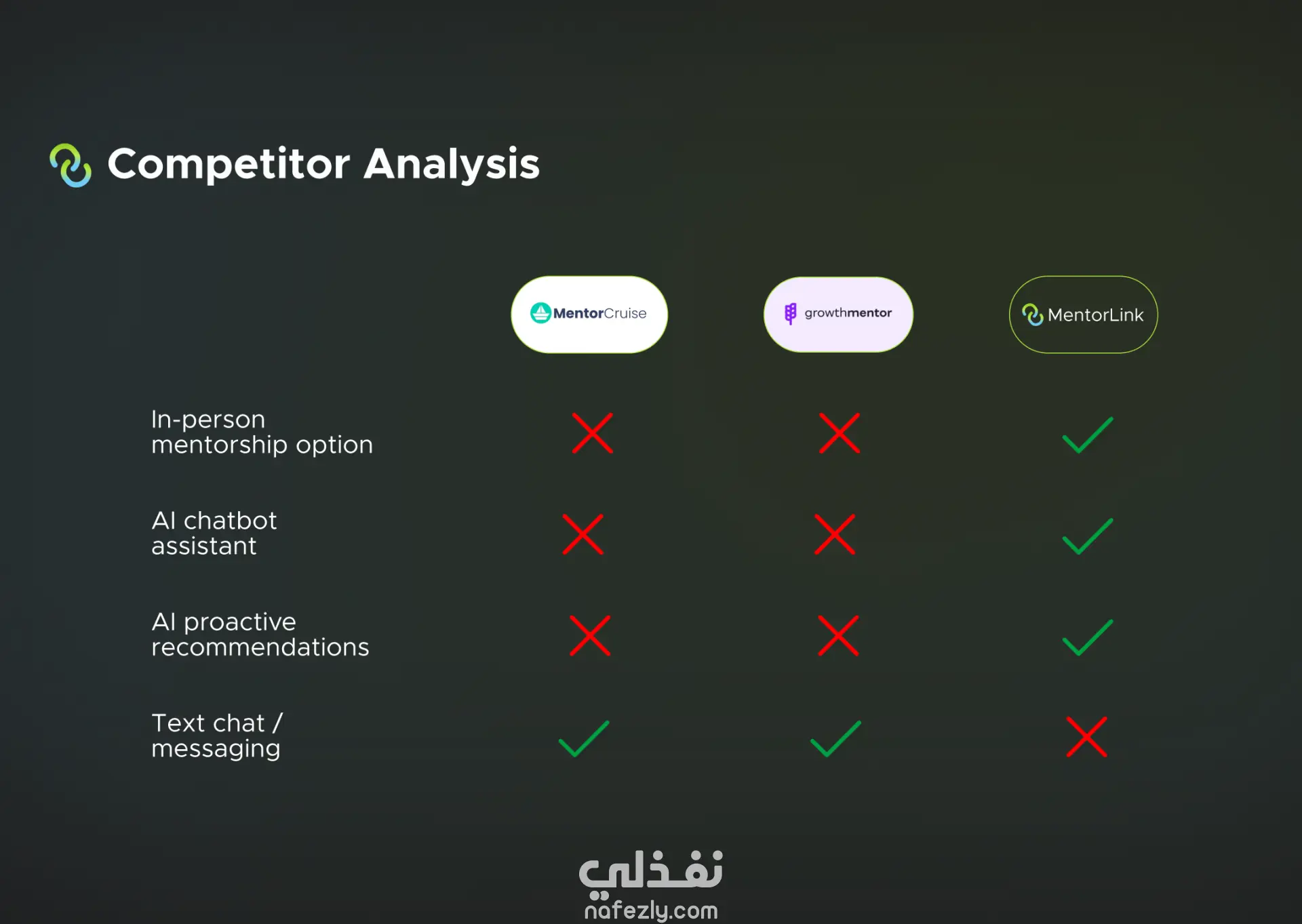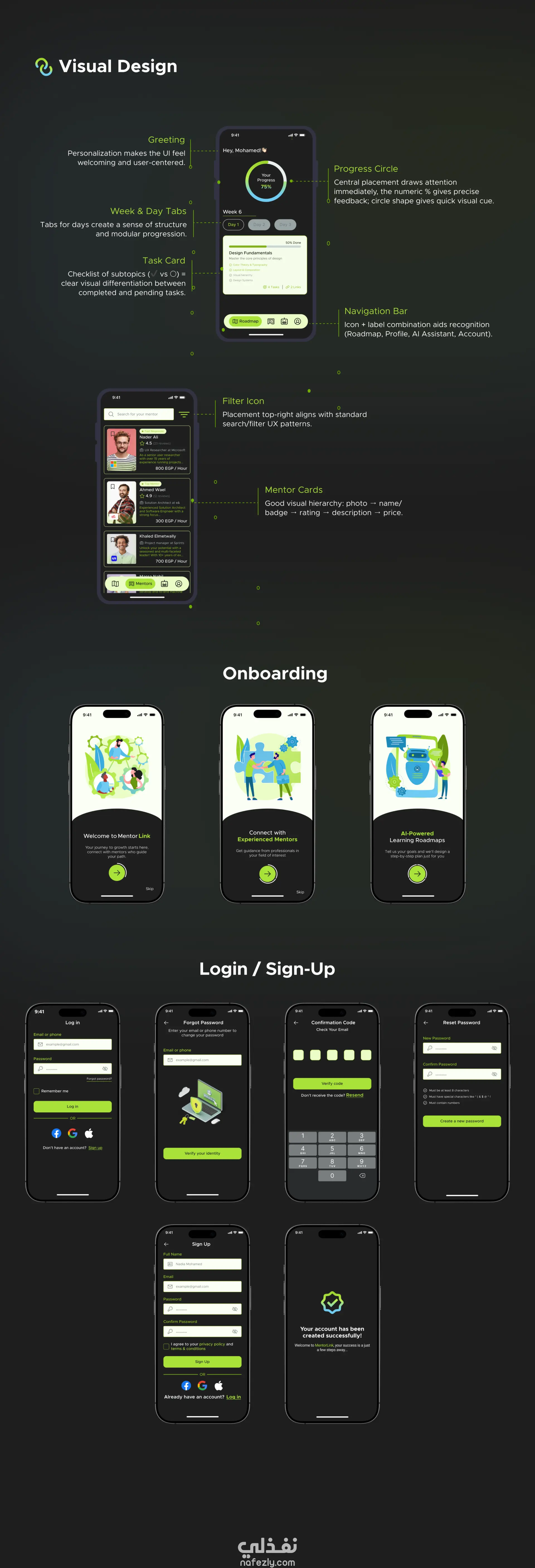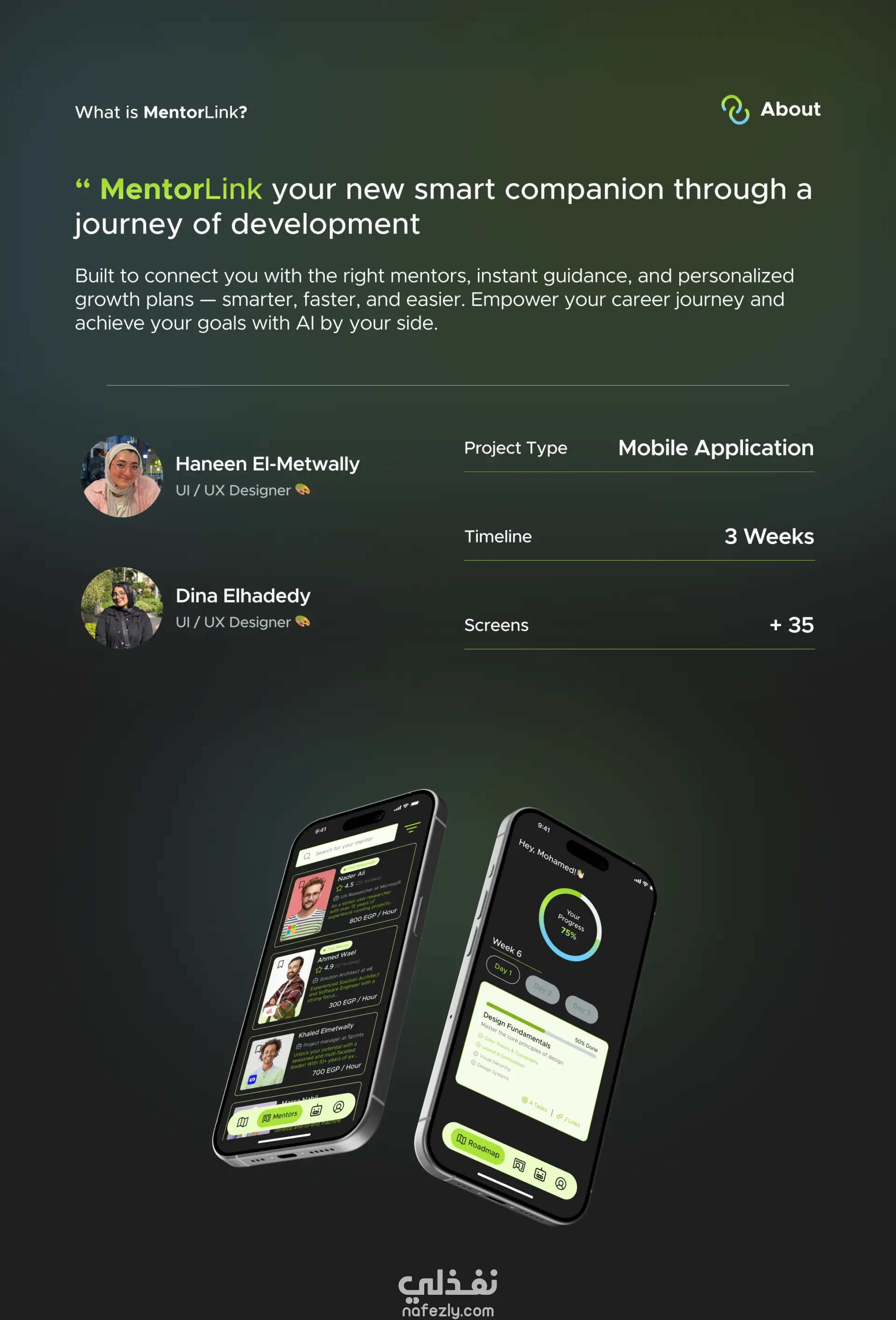 MentorLink هو تطبيق ذكي يعتمد على تقنيات الذكاء الاصطناعي لتسهيل وتعزيز تجربة الإرشاد المهني. يربط التطبيق بين المتدربين وأفضل المرشدين المناسبين لهم، من خلال نظام مطابقة ذكي، وتتبع التقدم، ونصائح مخصّصة تساعد كل مستخدم على بناء مساره المهني بثقة. 🎯 رؤيتنا بناء منصة تجعل الإرشاد المهني واضحًا، موجّهًا، ومؤثرًا من أول لحظة، مع واجهة استخدام بسيطة تحفّز المستخدم على اتخاذ خطوات فعلية نحو التطور. 🤖 مطابقة تعتمد على الذكاء الاصطناعي يقوم النظام بتحليل خلفية المستخدم، مهاراته، واهتماماته ليُرشّح له أفضل المرشدين بدقّة عالية—بدون مجهود. 📈 متابعة التقدم خطوة بخطوة يوفّر التطبيق أدوات عملية لمتابعة التقدّم، تحديد الأهداف، وإنشاء خطط تطوير واضحة تساعد المستخدم على رؤية نجاحه أمامه. 💡 توجيه مخصص ومحتوى داعم يقترح MentorLink نصائح، ملاحظات، ومواد تعليمية مبنية على احتياجات كل مستخدم بشكل فردي.