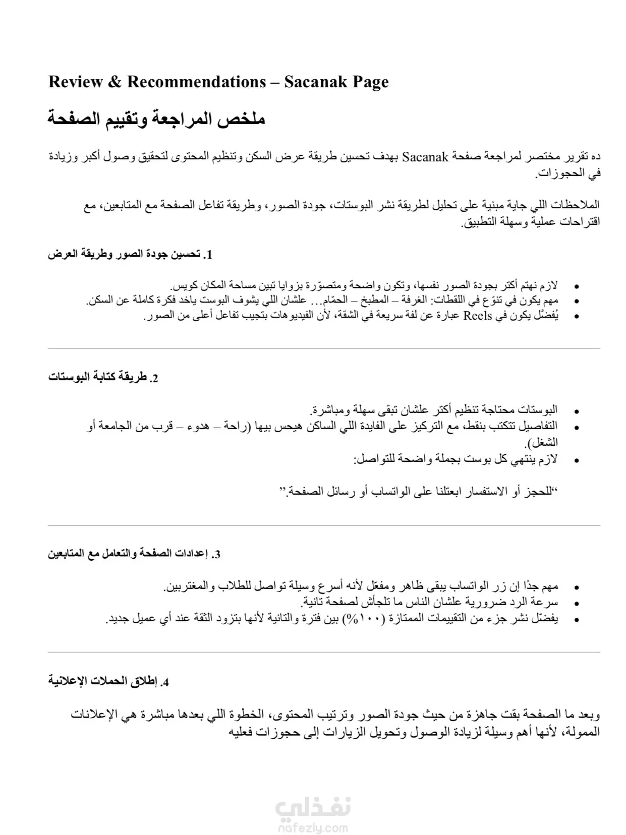هقدّم لك مراجعة احترافية كاملة لصفحتك على السوشيال ميديا، هدفها تحسين شكل الصفحة وزيادة التفاعل والوصول، وكمان تجهيزها لاستقبال حملات إعلانية ناجحة. الخدمة بتشمل: 1. تحليل شامل للصفحة •مراجعة طريقة عرض الصور وجودتها. •تقييم ترتيب البوستات وشكل المحتوى. •تحليل أسلوب الكتابة وتقديم النصائح للتحسين. •مراجعة إعدادات الصفحة (الواتساب – التفاعل – الردود – التقييمات). 2. كتابة تقرير جاهز PDF هسلّمك تقرير منسق وجاهز فيه: •ملاحظات واضحة على كل نقطة تحتاج تحسين. •اقتراحات تطوير سهلة التطبيق. •خطة جاهزة لرفع جودة الصفحة وزيادة الثقة عند المتابعين. 3. خطة إعلانية مقترحة (اختياري) •اقتراح أنواع الحملات المناسبة للهدف. •توضيح شكل الإعلانات اللي تحقق وصول أعلى وحجوزات أكتر