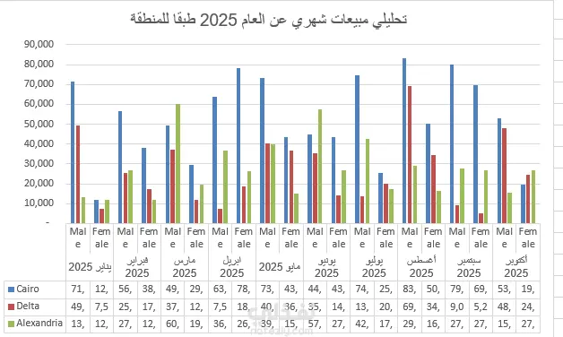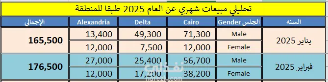 ده مثال لشغل تحليل بيانات مبيعات قمت بعمله باستخدام Excel. اشتغلت على ترتيب وتنظيف البيانات، وبعدها عملت تحليل شهري واضح يوضح مبيعات كل منطقة (القاهرة – الدلتا – إسكندرية) ومبيعات الذكور والإناث. الشغل بيشمل: تحليل شهري كامل للبيانات. حساب الإجماليات والمقارنات بين الشهور. تصميم Dashboard بسيطة وسهلة توضح الأداء. عمل جرافيكس واضحة تساعد في معرفة أفضل منطقة وأفضل شهر. تنسيق الجدول والجرافيك بشكل احترافي وجاهز للعرض. النموذج ده بيوضح أسلوبي في تحليل البيانات وعرض النتائج بطريقة بسيطة وسهلة الفهم.