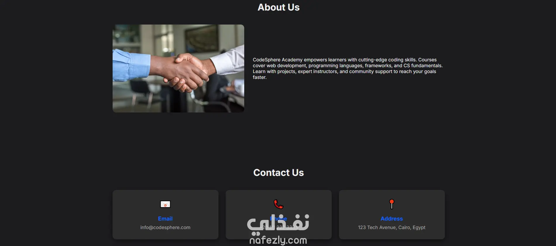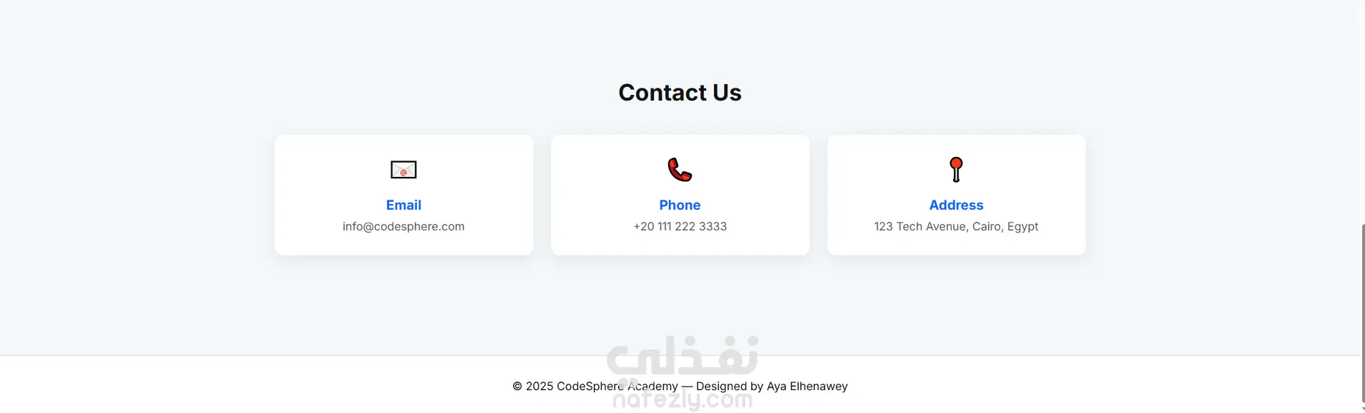 Contact Section احترافي: تصميم تواصل واضح مع أيقونات وعناوين.