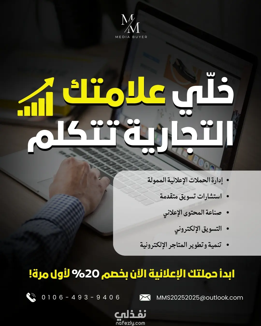 أقدّم خدمة تصميم إعلان تسويقي احترافي مخصص لأصحاب الأعمال، يوضح الخدمات التسويقية المقدمة بشكل جذاب وواضح، مع إمكانية التعديل حتى الرضا التام. الإعلان المعروض يتضمن: إدارة الحملات الإعلانية الممولة استشارات تسويق متقدمة صناعة المحتوى الإعلاني التسويق الإلكتروني تنمية وتطوير المتاجر الإلكترونية كما يتضمن العرض خصم 20% لأول مرة. سأقوم بتصميم إعلان مشابه أو أفضل، مع الحفاظ على: هوية العلامة التجارية الألوان تناسق النصوص جودة عالية مناسبة للنشر إمكانية تصميم مقاسات متعددة للسوشيال ميديا
