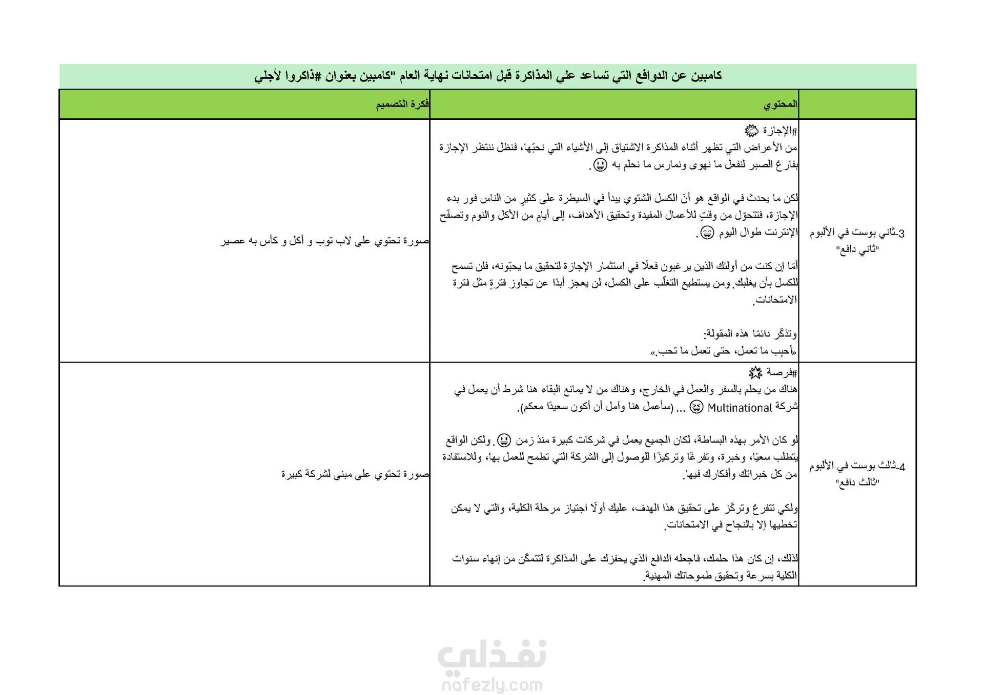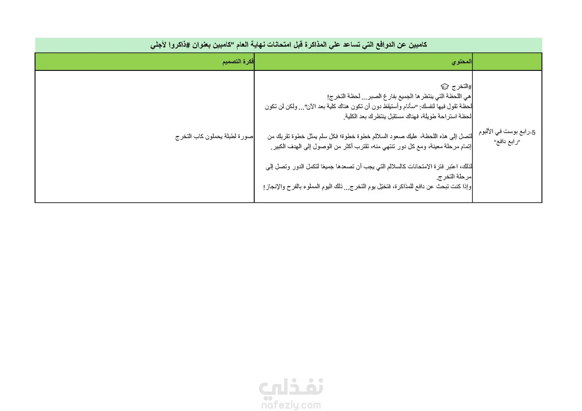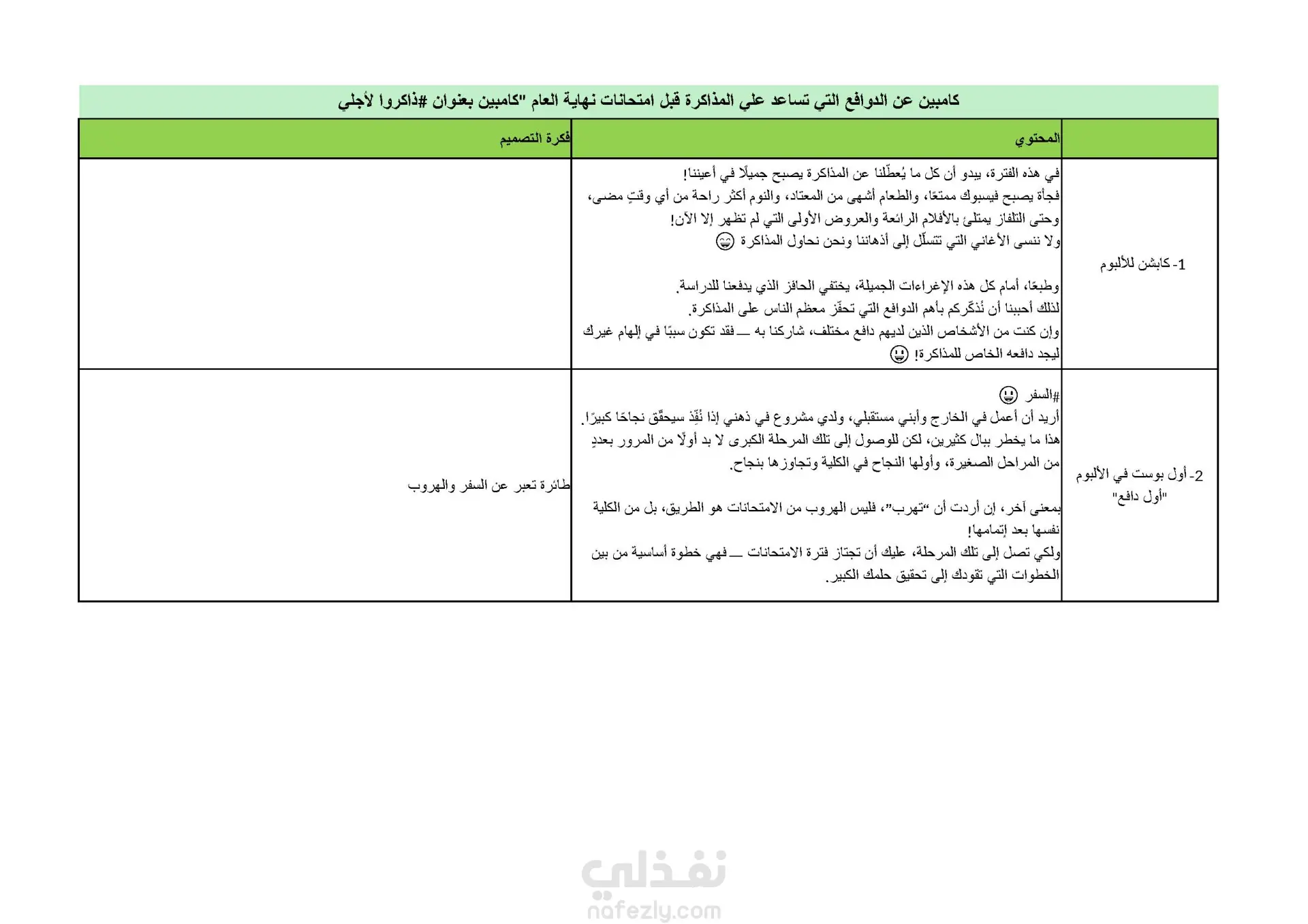 إعداد ألبوم مكون من خمس صور وكل صورة يرفق معها محتوى يعبر عنها. بناء المحتوى و فكرة التصميم لكل صورة لمساعدة الجرافيك ديزاينر الغرض من هذه الكامبين تحفيز الطلبة فى الجامعات على المذاكرة لامتحانات آخر العام