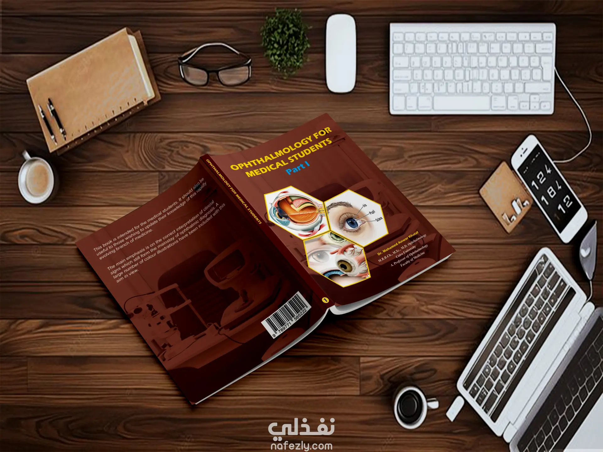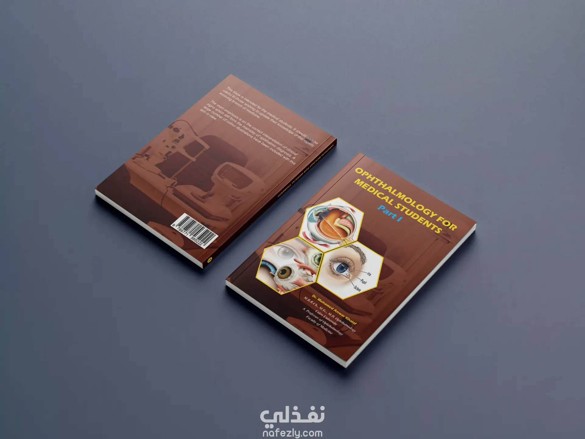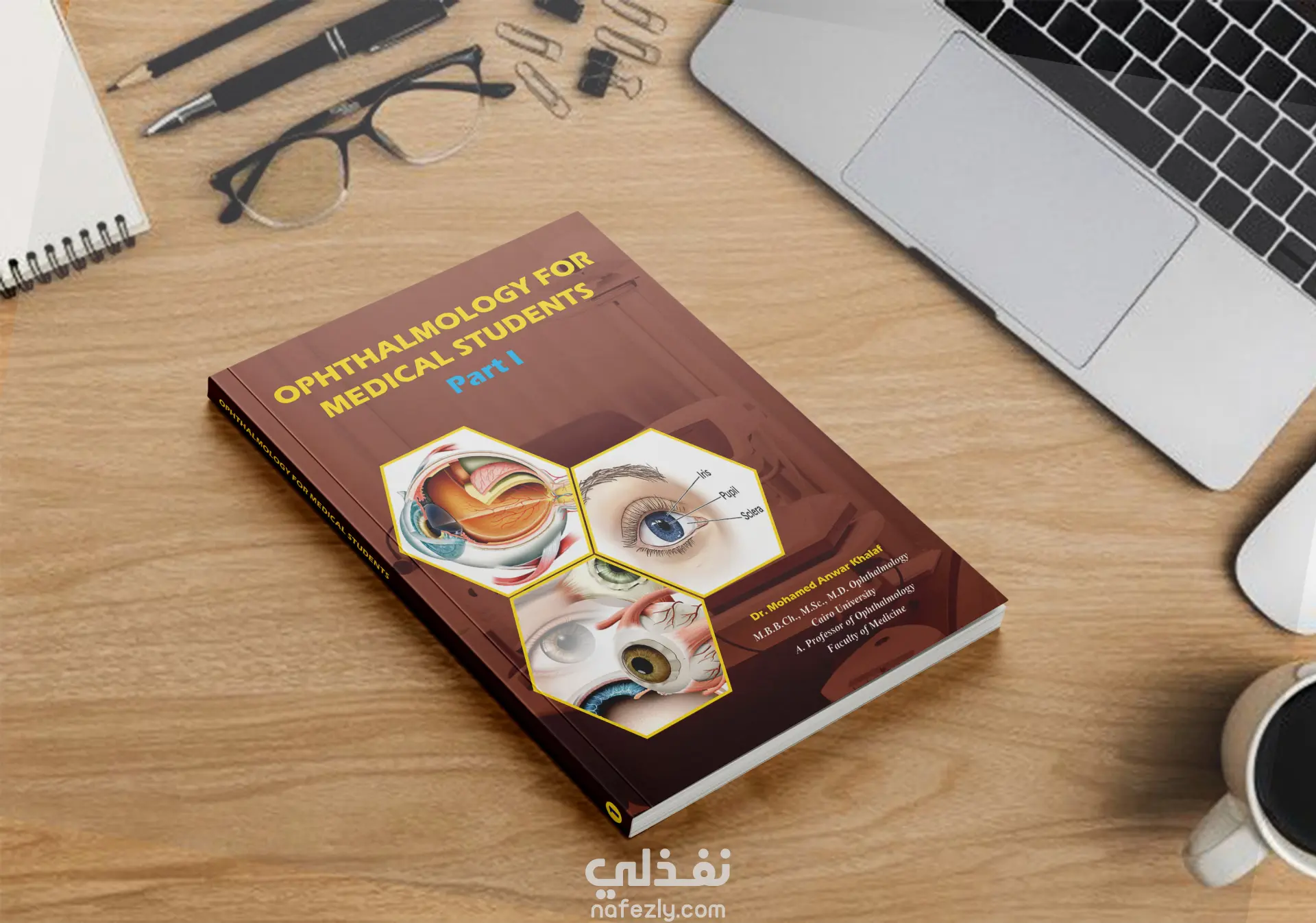 غلاف كتاب إبداعي ومتوازن، بألوان دافئة وصور طبية خاصة بطبّ العيون، مع خلفية لأجهزة طبيب العيون، وتوزيع متوازن لجميع العناصر.