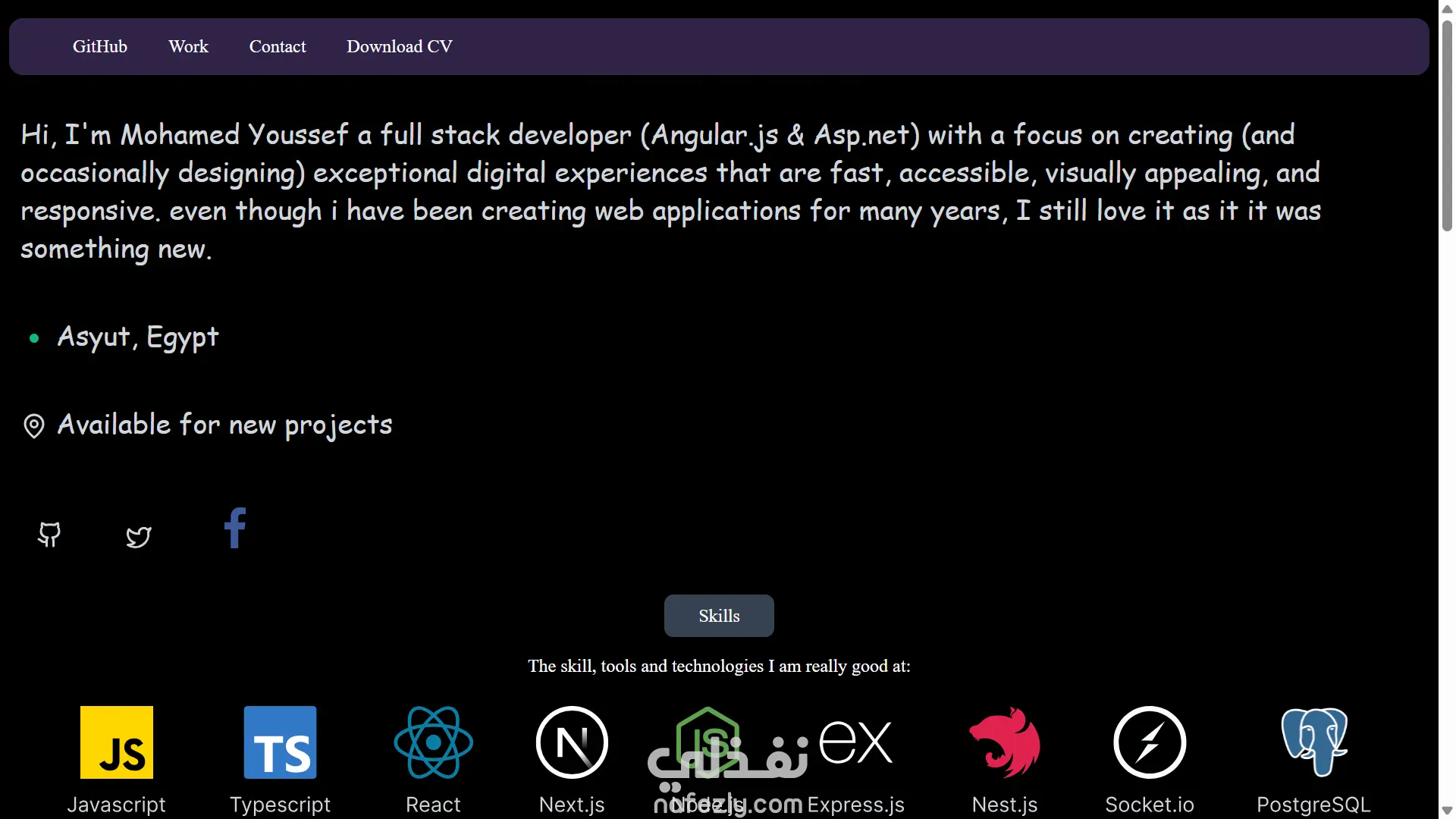 يبدأ الموقع بمقدمة إنسانية وصادقة تعرّف الزائر على "محمد يوسف" كمطوّر Full Stack يجمع بين Angular و ASP.NET، ويقدّم نفسه بشغف حقيقي تجاه صناعة الويب. النص مكتوب بأسلوب مباشر يعطي إحساسًا بالخبرة والواقعية، ويُظهر شغفه في بناء تطبيقات سريعة، متجاوبة، وجميلة بصريًا.