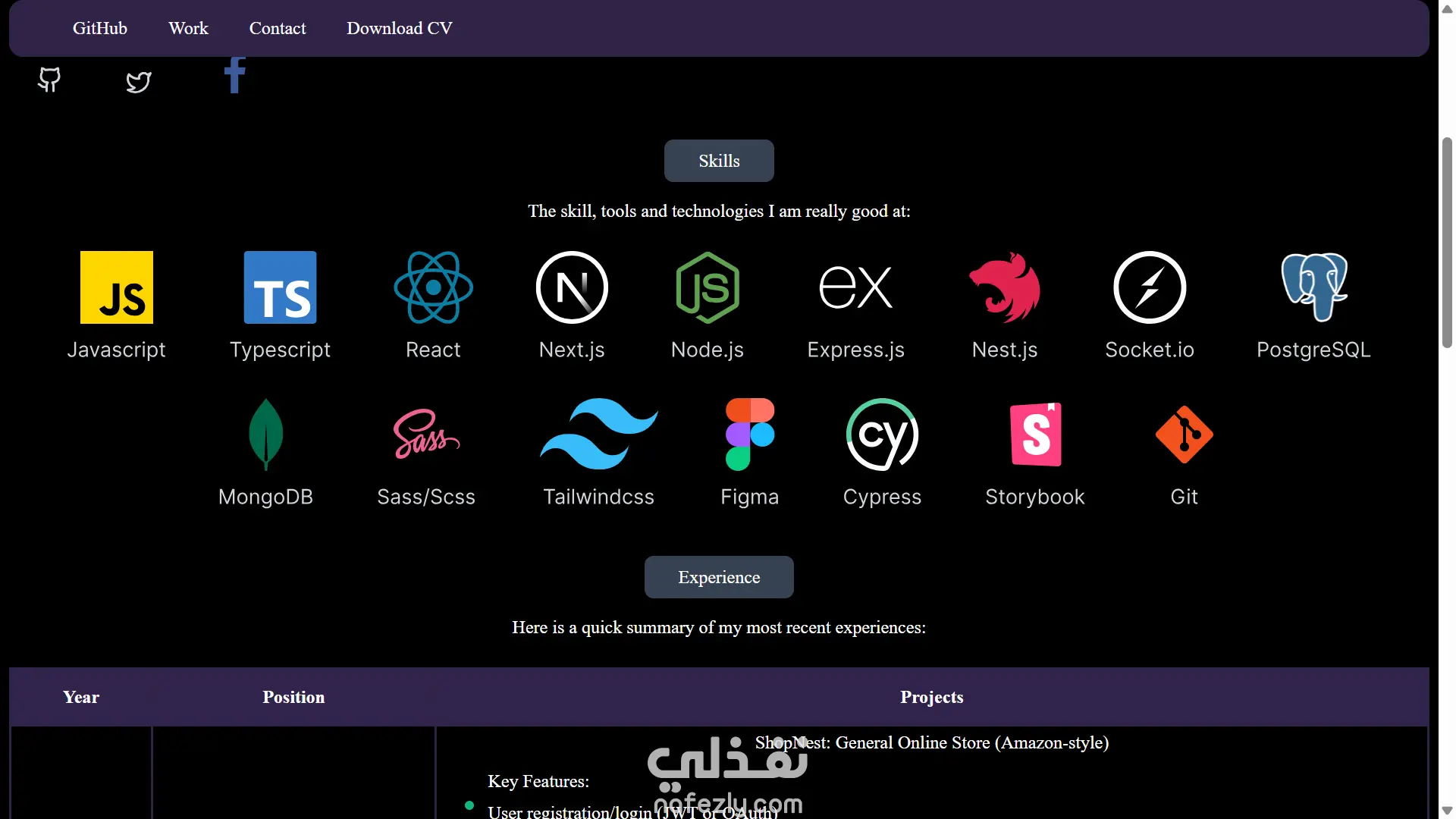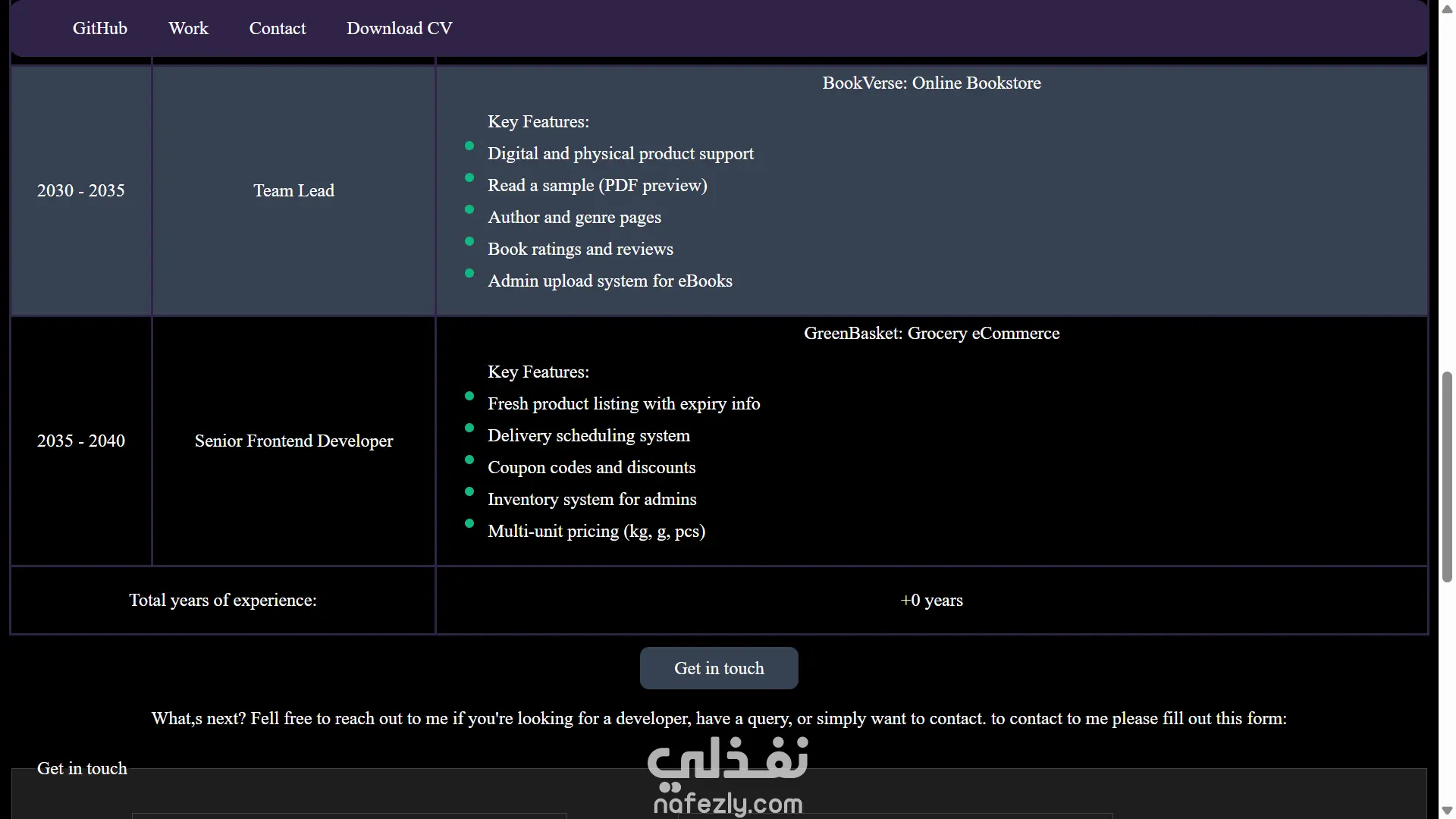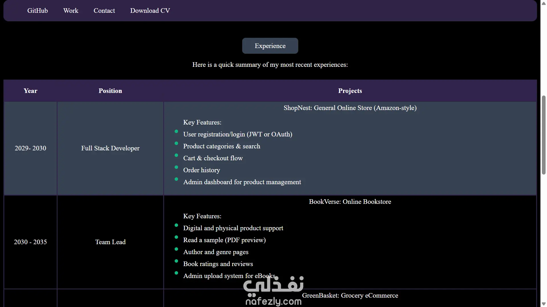 قسم الخبرات مُصمم بشكل احترافي باستخدام جدول واضح يوضح التسلسل الزمني لمسيرة المطوّر، مع كل مشروع مرفق بنقاط مختصرة توضّح المزايا الأساسية التي تهم أي صاحب مشروع.