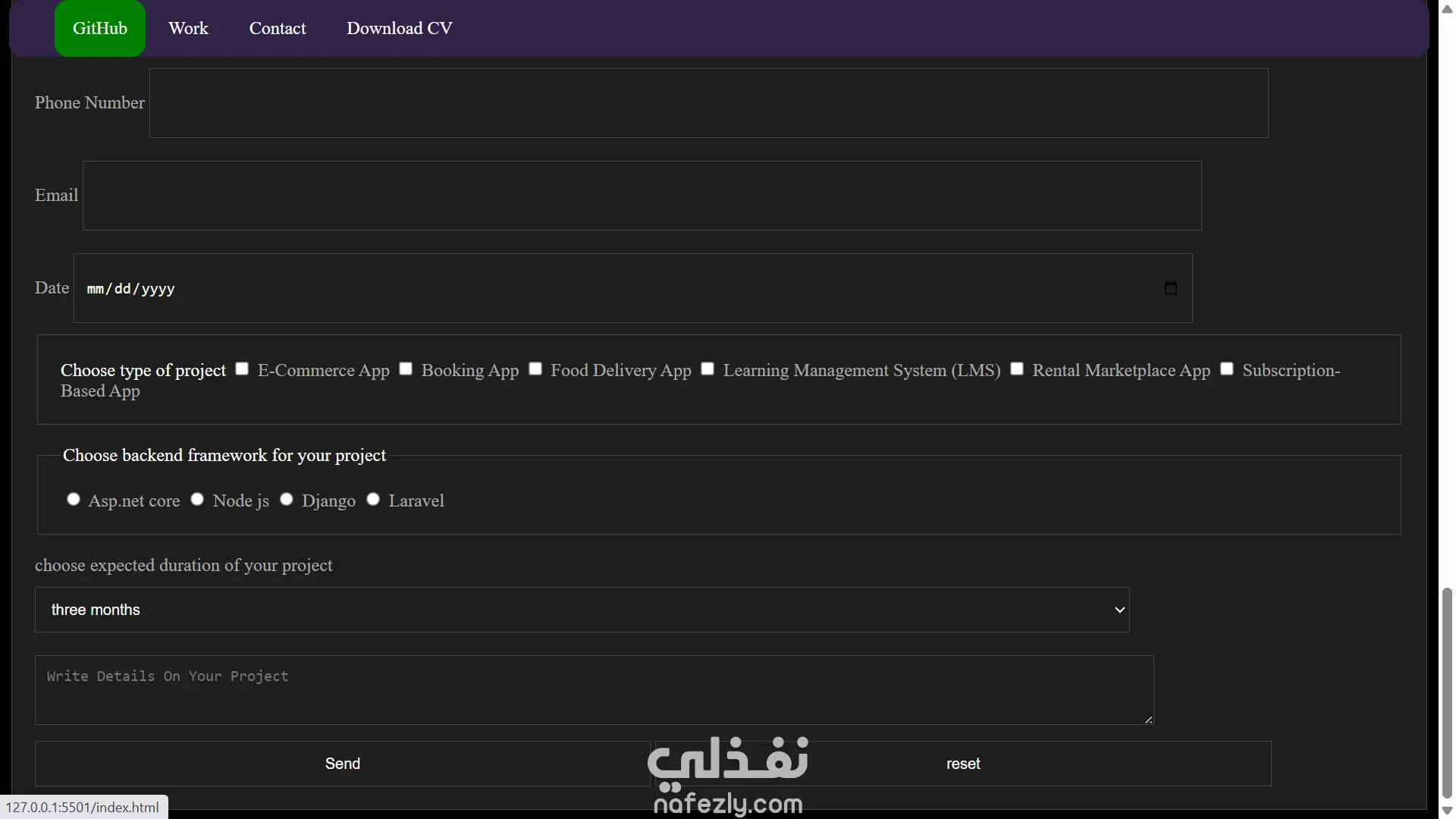 أما قسم "تواصل معي"، فهو مصمم ليكون عمليًا ومباشرًا، يحتوي نموذجًا كاملًا يجمع من العميل كل ما يحتاجه المطوّر لفهم المشروع من أول رسالة: