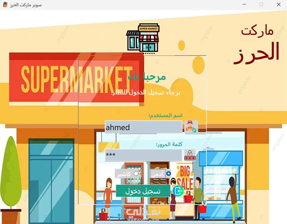 برنامج كاشير خاص بمبيعات ومشتريات سوبر ماركت وطباعة فواتير بكل معاملة داخل المحل مع تزويد المالك بتقارير يومية واسبوعية وسنوية بكل ما تم لمراجعة عمله بشكل دورى