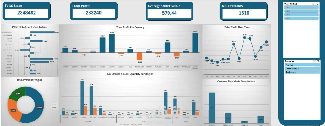 قمتُ ببناء لوحة تحكم تفاعلية باستخدام Excel لتحليل وعرض بيانات مبيعات الشركة. قمتُ بتنظيف البيانات الخام وتحويلها، وإنشاء مؤشرات أداء رئيسية (KPIs)، ورسوم بيانية، وجداول محورية (Pivot Tables). ساعدت اللوحة على كشف رؤى مهمة حول أداء المنتجات، اتجاهات المبيعات، وسلوك العملاء.