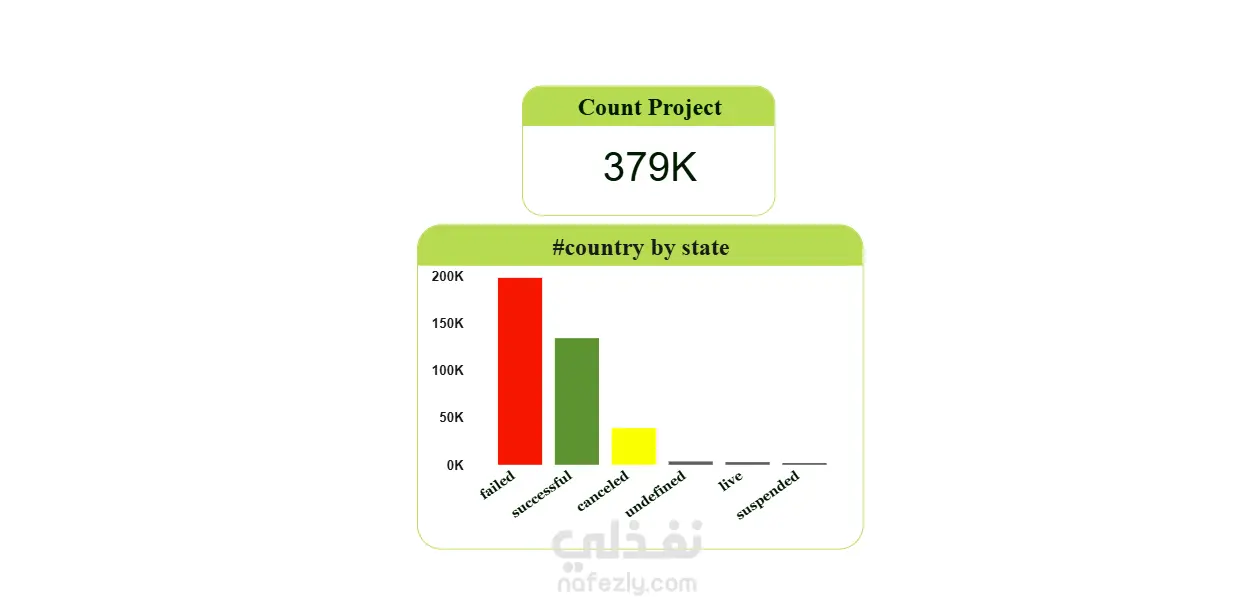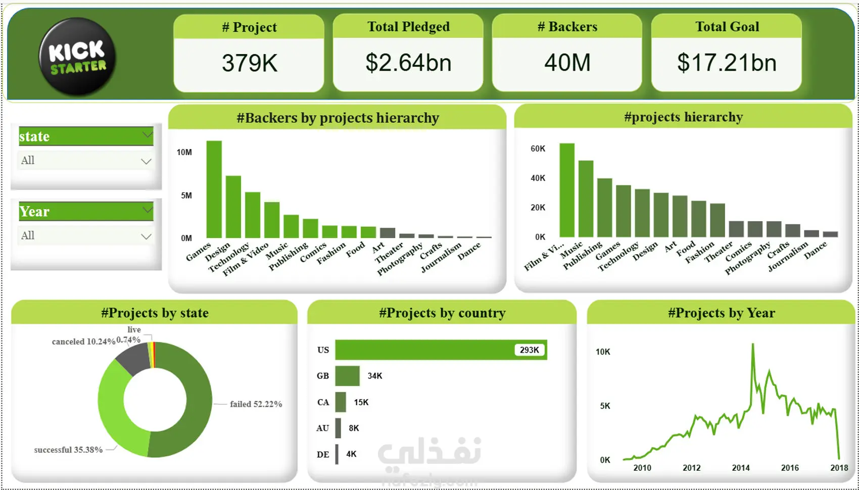 الداشبورد توفر رؤية واضحة عن أداء مشاريع Kickstarter ومدى نجاحها عبر السنوات، مع تمكين المستخدم من تحليل أي فئة أو دولة بسهولة بفضل الـ Hierarchies والفلاتر الديناميكية.