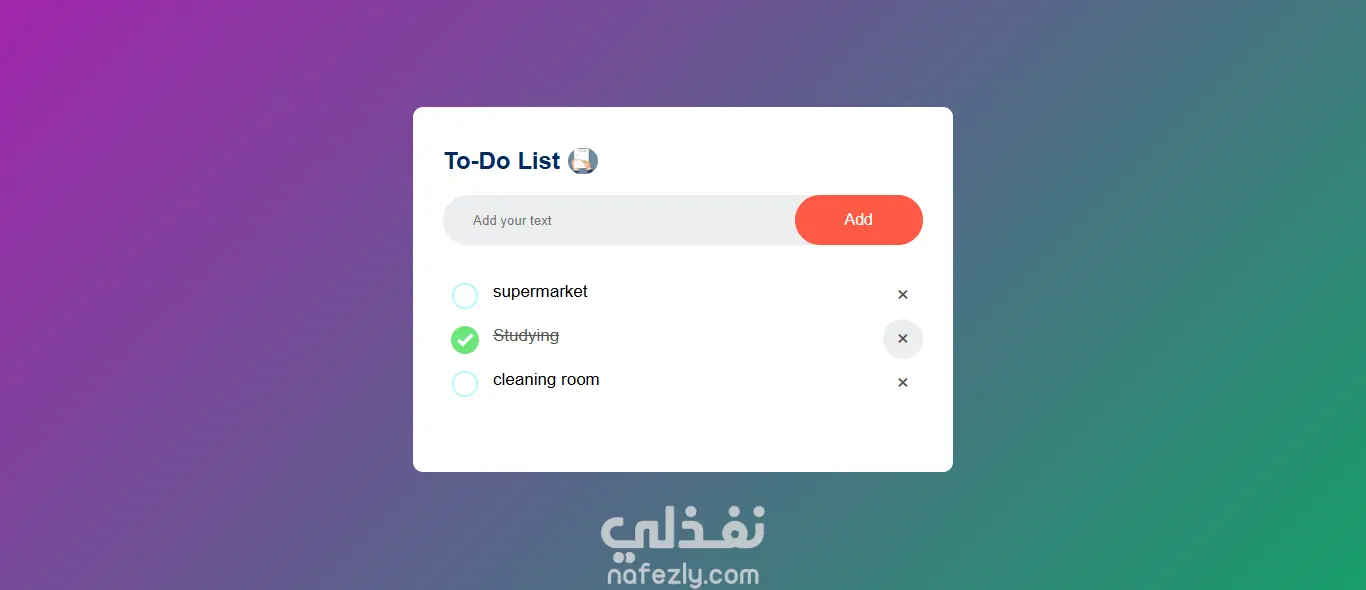 To-Do-List هي قائمة انا بقدر اعملها للمستخدم يكتب فيها المهام المراد تنفيذها ويمكن التحكم في المهام وحذفها والتحكم بها اذا كانت تمت كمهمة ام لا ولا يمكن للبيانات ان تختفي عند اعادة تحميل الصفحة لكي تتمكن من متابعة قائمة المهام الخاصة بك
