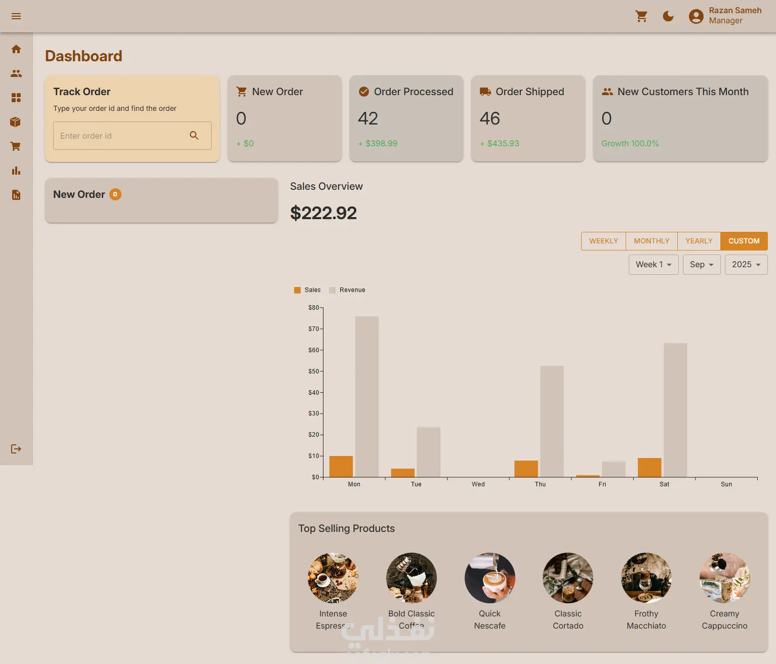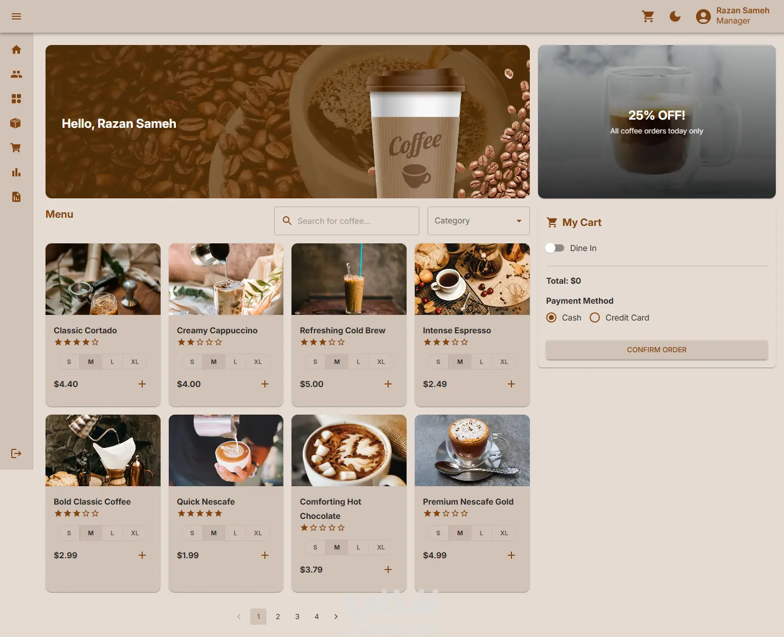 طوّرت تطبيق إدارة متجر قهوة (Coffee Management Admin) يتيح للمدير متابعة المبيعات والمنتجات في الوقت الفعلي، مع واجهة أخرى مخصصة لاستخدام المتجر أثناء عمليات البيع اليومية. تم تصميم المشروع بواجهة حديثة ومتجاوبة تدعم الوضع الليلي (Dark Mode) وتعمل بسلاسة على جميع الأجهزة. اعتمدت في التطوير على التقنيات التالية: - React وTypeScript لبناء واجهة تفاعلية ومنظمة. - Redux لإدارة الحالة بشكل فعّال. - Material UI لتصميم واجهة عصرية وسهلة الاستخدام. - Firebase لتخزين البيانات وإدارة المستخدمين والمبيعات. المشروع يوفّر تجربة مرنة للمدير والموظفين، مع أداء سريع وسهولة في متابعة العمليات اليومية داخل المقهى.