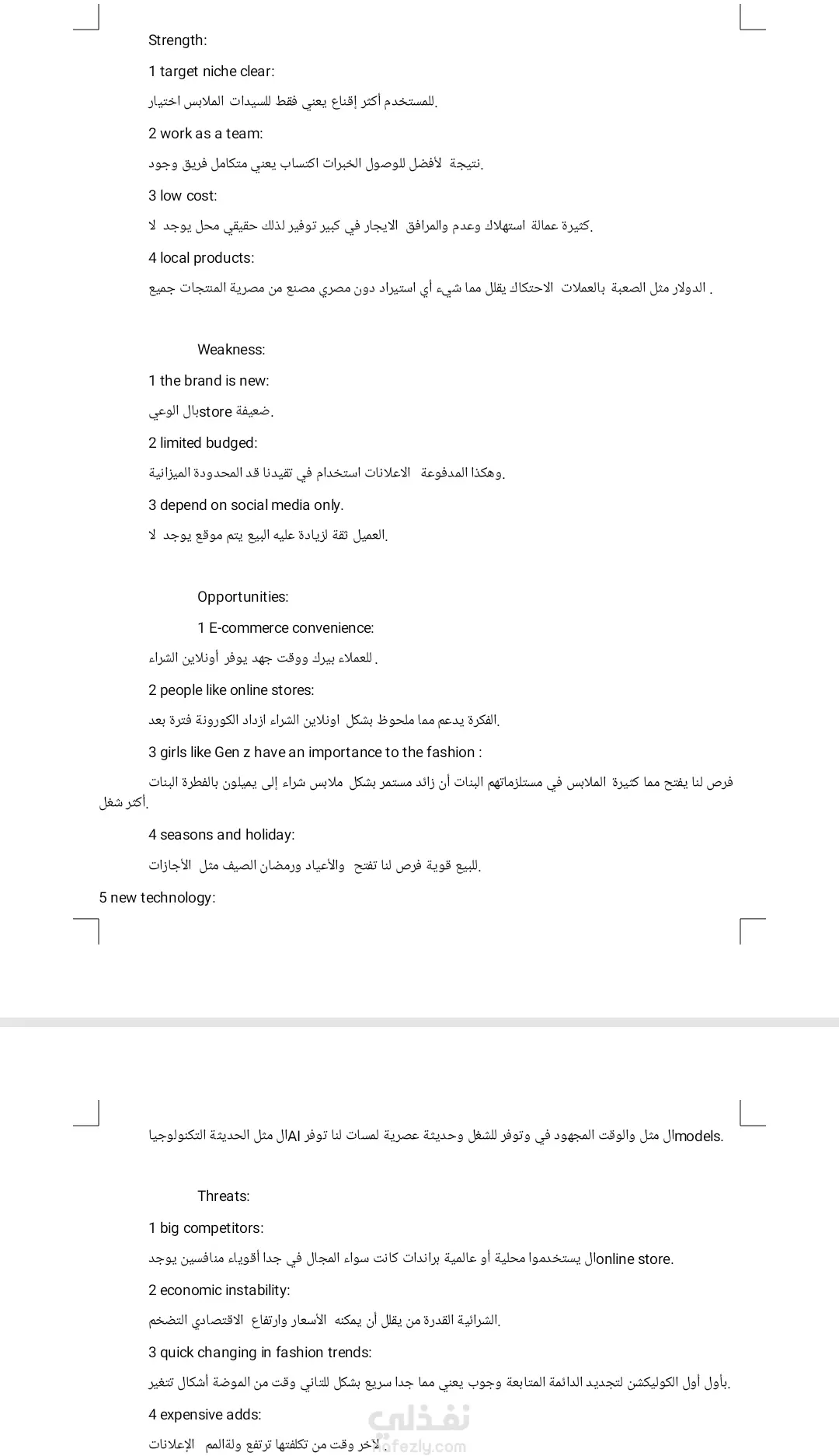 قمنا بعمل تحليل للمشروع تضمن نقاط الضعف والقوه والتهديدات التي ربما تواجه المشروع والفرص المستقبليه التي يستطيع ان يستغلها هذا التحليل غرض منه الوقوف على الحاله الشامله للمشروع لنستطيع عمل خطه تسويقيه محكمه