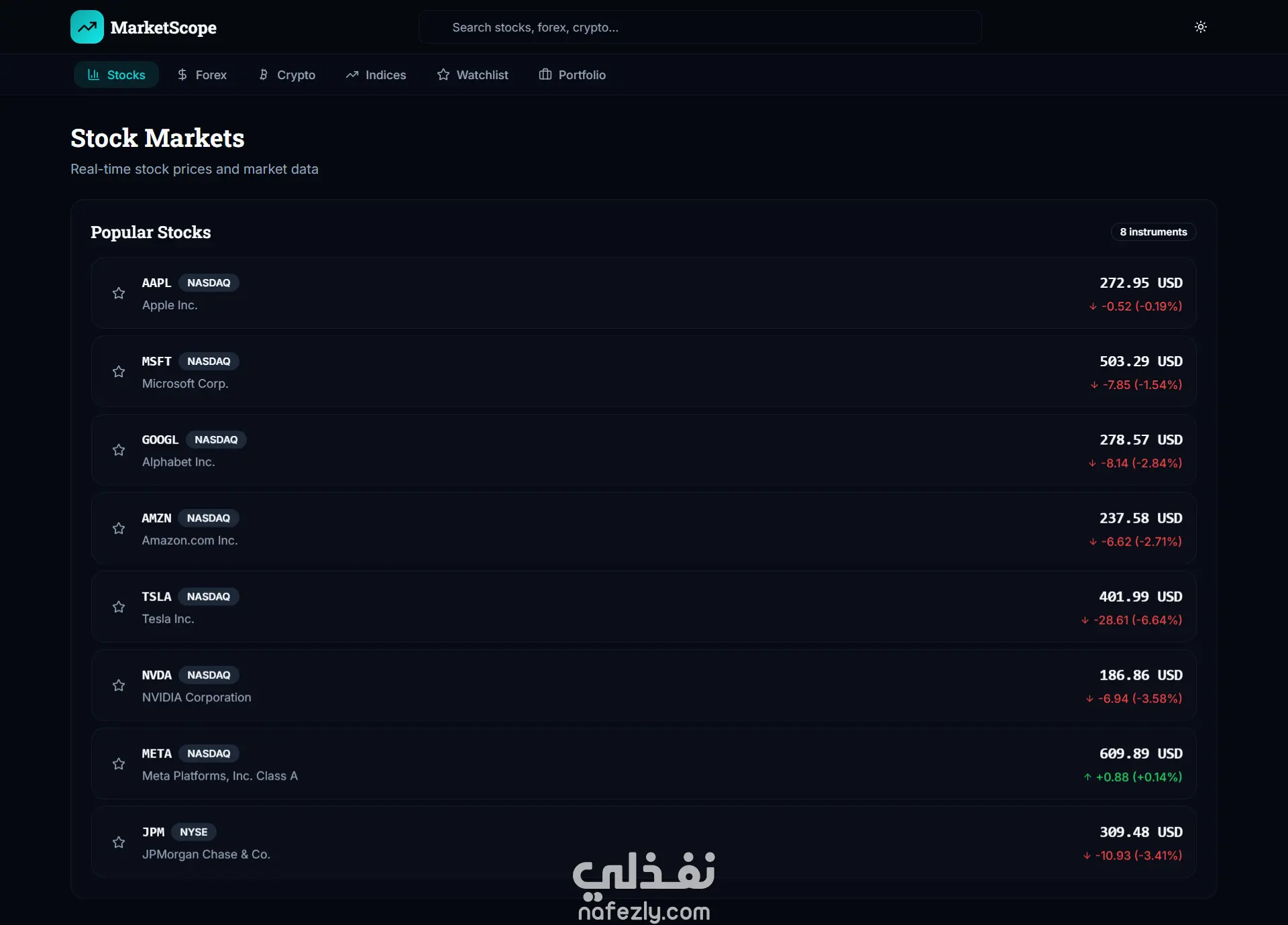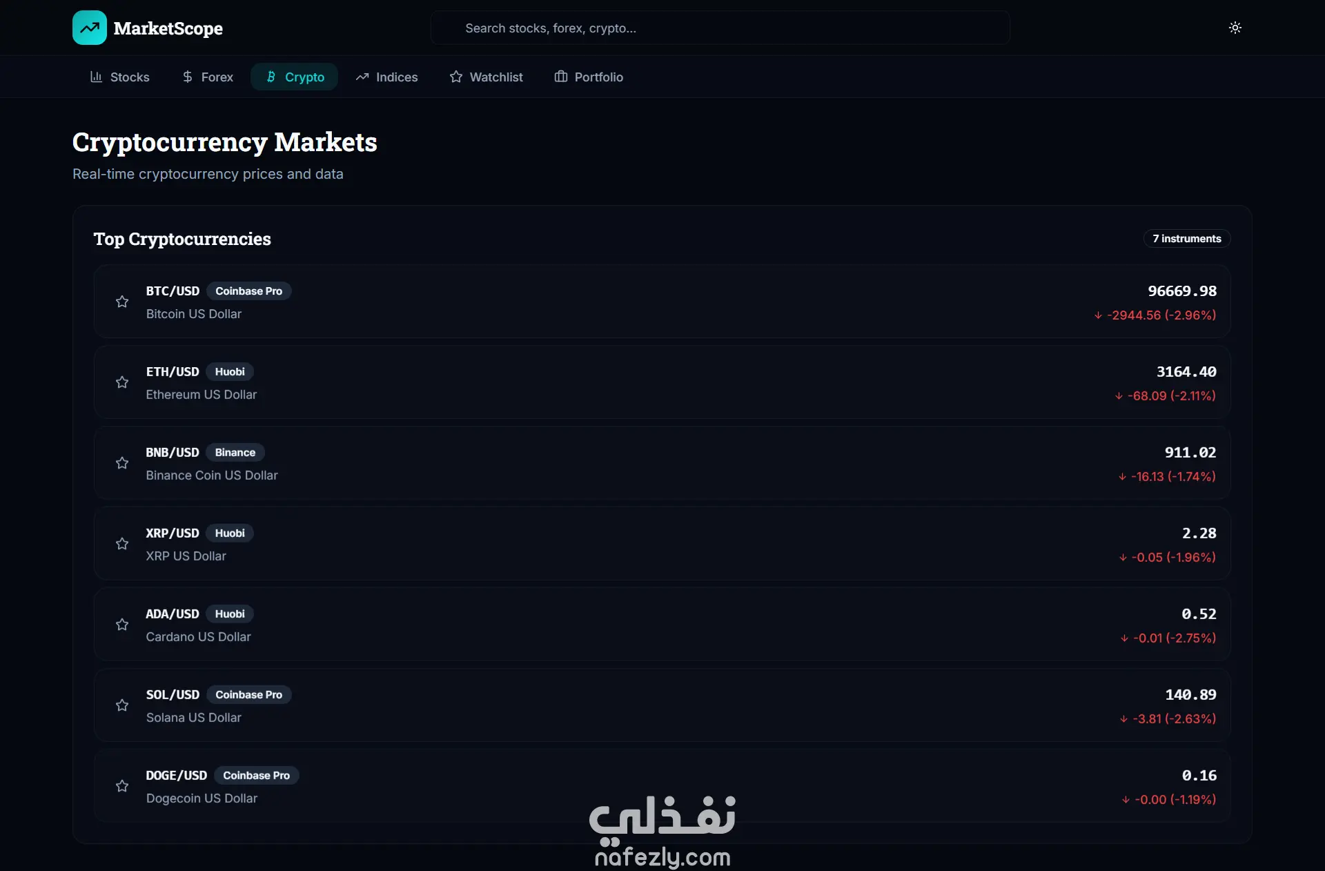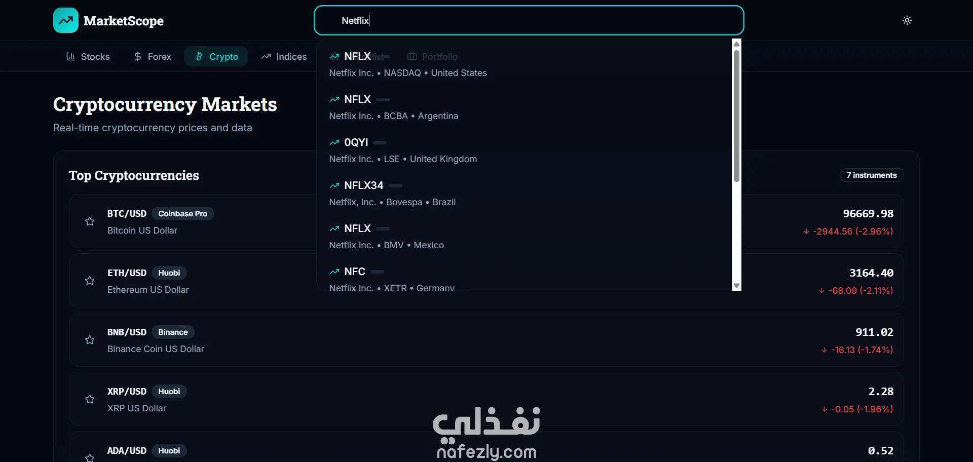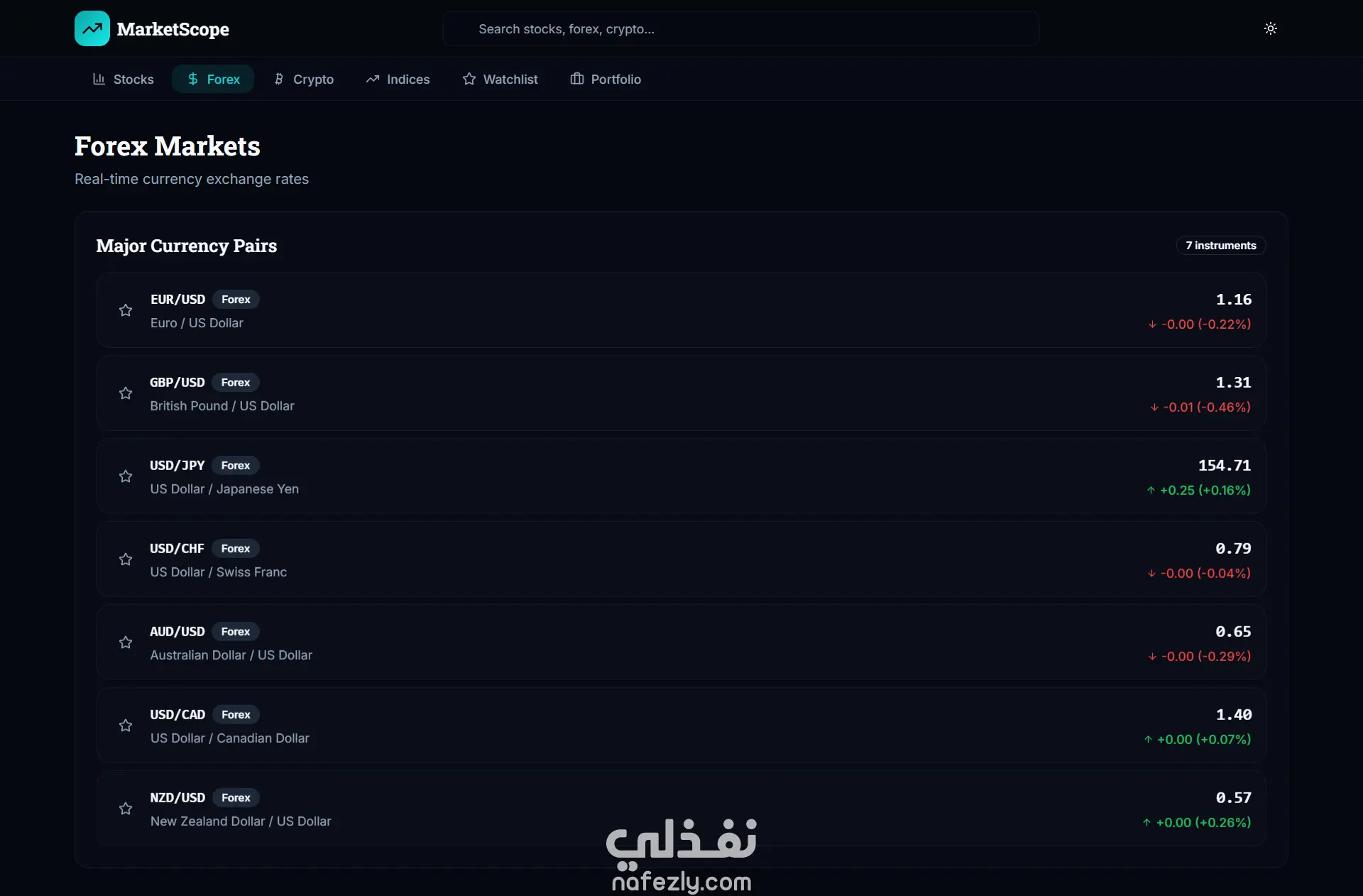 صفحات مثل: الأسهم – العملات – الكريبتو – المؤشرات – قائمة المراقبة – المحفظة