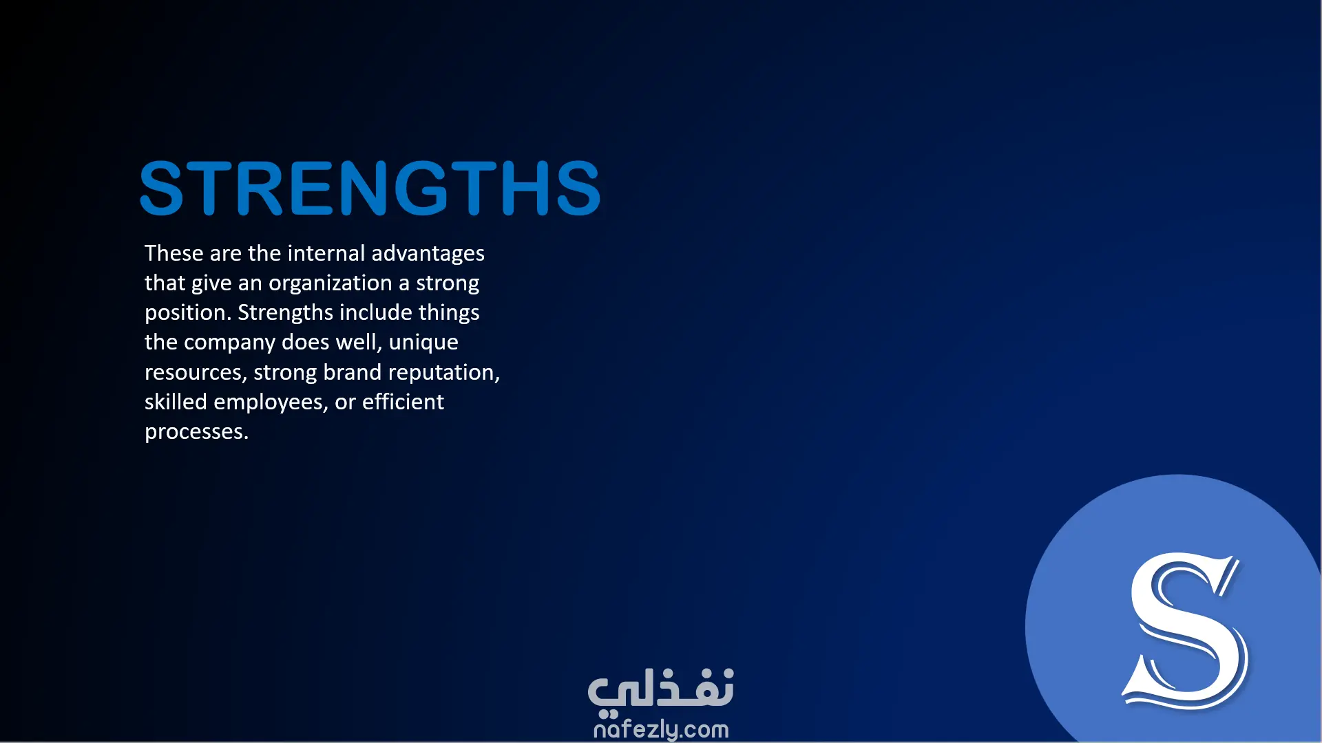 نقاط القوة (Strengths): المزايا الداخلية التي تساعد المنظمة على النجاح.