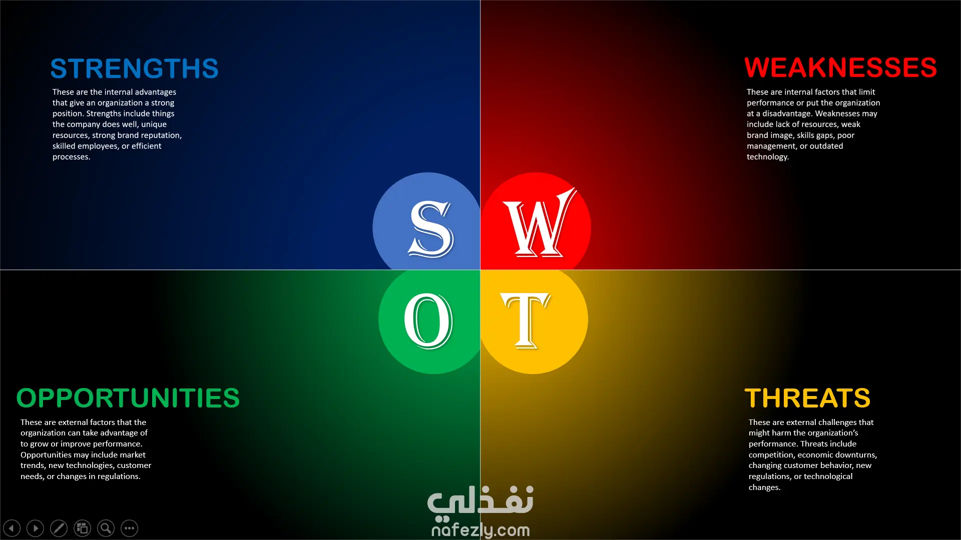 تم عرض كل عنصر في سلايد منفصلة، مع الحفاظ على تنسيق موحّد، وخلفيات Gradient، وتصميم دائري لكل حرف من أحرف SWOT بما يعكس هوية واضحة ومظهرًا احترافيًا.