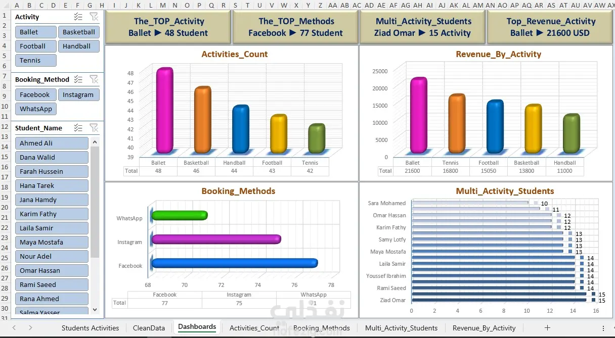 تم تنفيذ مشروع تحليل بيانات وإنشاء لوحة تقارير تفاعلية (Students Activities Dashboard). شمل العمل جمع البيانات وتنظيفها، ثم إعداد نموذج تحليل متكامل يعرض أهم مؤشرات المشاركة الطلابية في الأنشطة المختلفة. كما تضمّن المشروع تصميم Dashboard تفاعلية توضح توزيع الطلاب حسب الفئات، ونسب المشاركة في كل نشاط، وتحليل الفاعليات الأعلى مشاركة، بالإضافة إلى إنشاء بطاقات قياس (Cards) تُظهر أهم المؤشرات بشكل سريع وواضح. تم الاعتماد على أدوات التحليل ودمج البيانات داخل Excel، مع إعداد تصميم بصري متناسق يسهل على الإدارة متابعة أداء الأنشطة واتخاذ قرارات مبنية على البيانات. تم تسليم المشروع بجودة عالية وفق متطلبات العميل، مع مراعاة الدقة والتنظيم والوضوح في عرض النتائج.